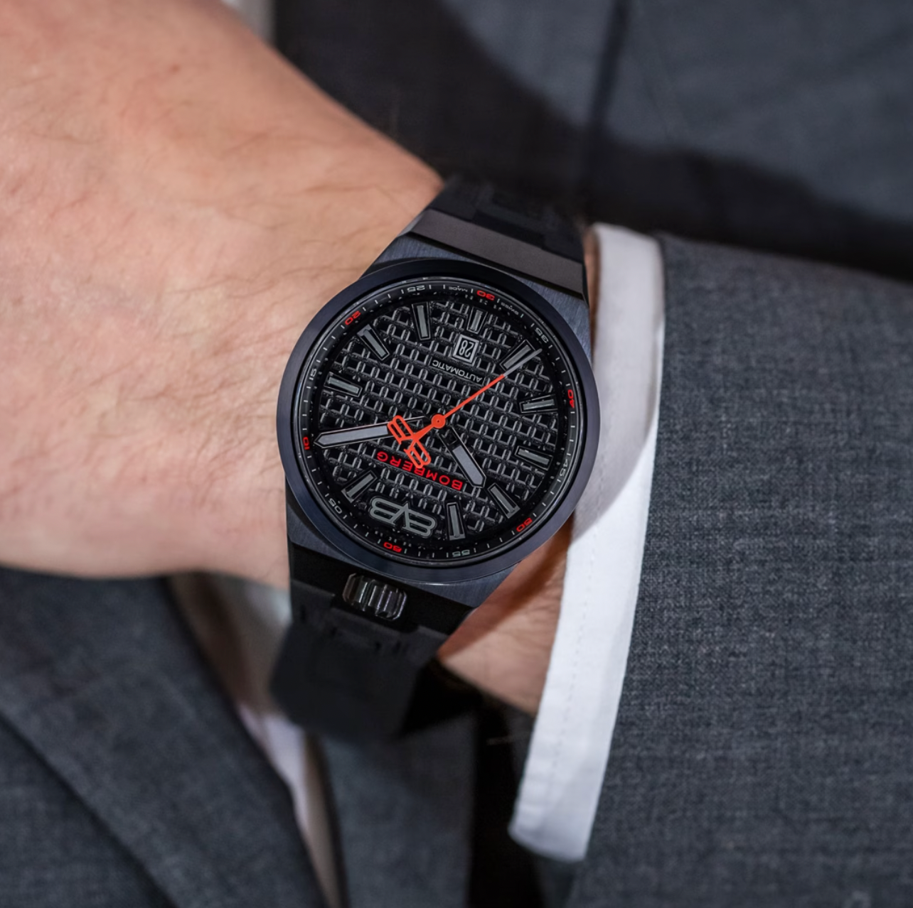Black Tapestry Dial - Grey Pencil-Shaped Hands - Baton Hour Indices - Red Accents - Date Window at 6 O'Clock.
