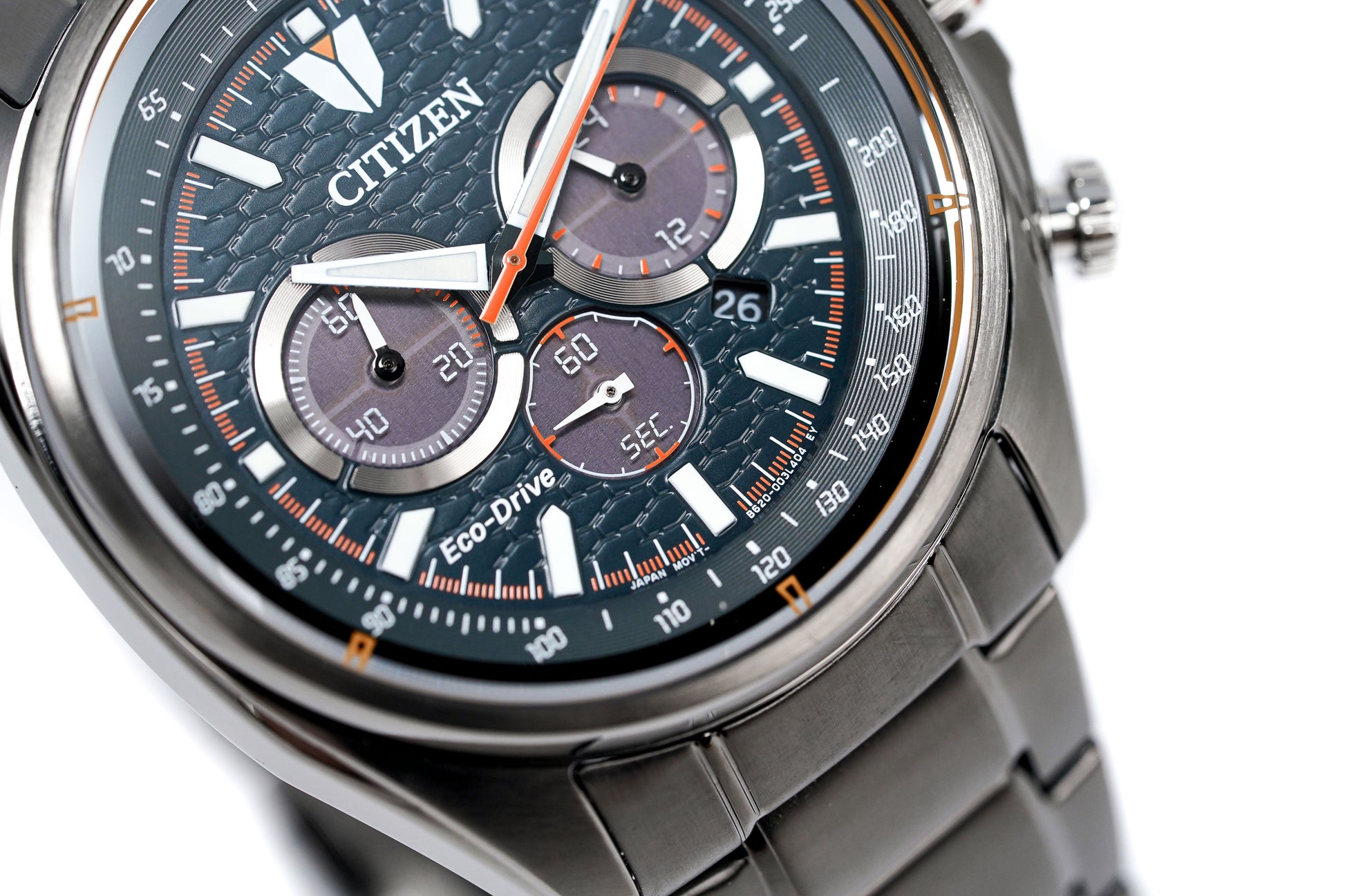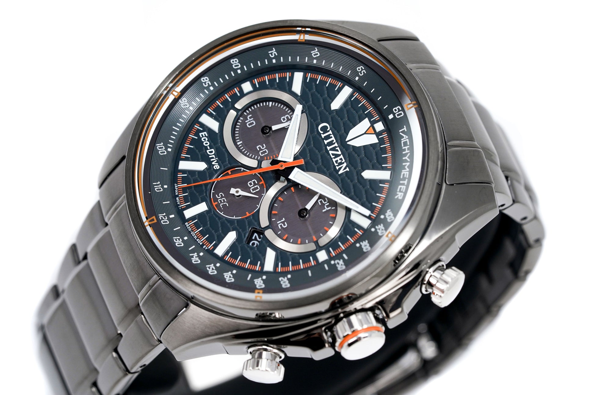 +/- 15 seconds per month, 24-hour display, 270 days power reserve, Date, Eco-Drive, Insufficient charge warning feature, Stopwatch: max.60 Min,1/5 Second