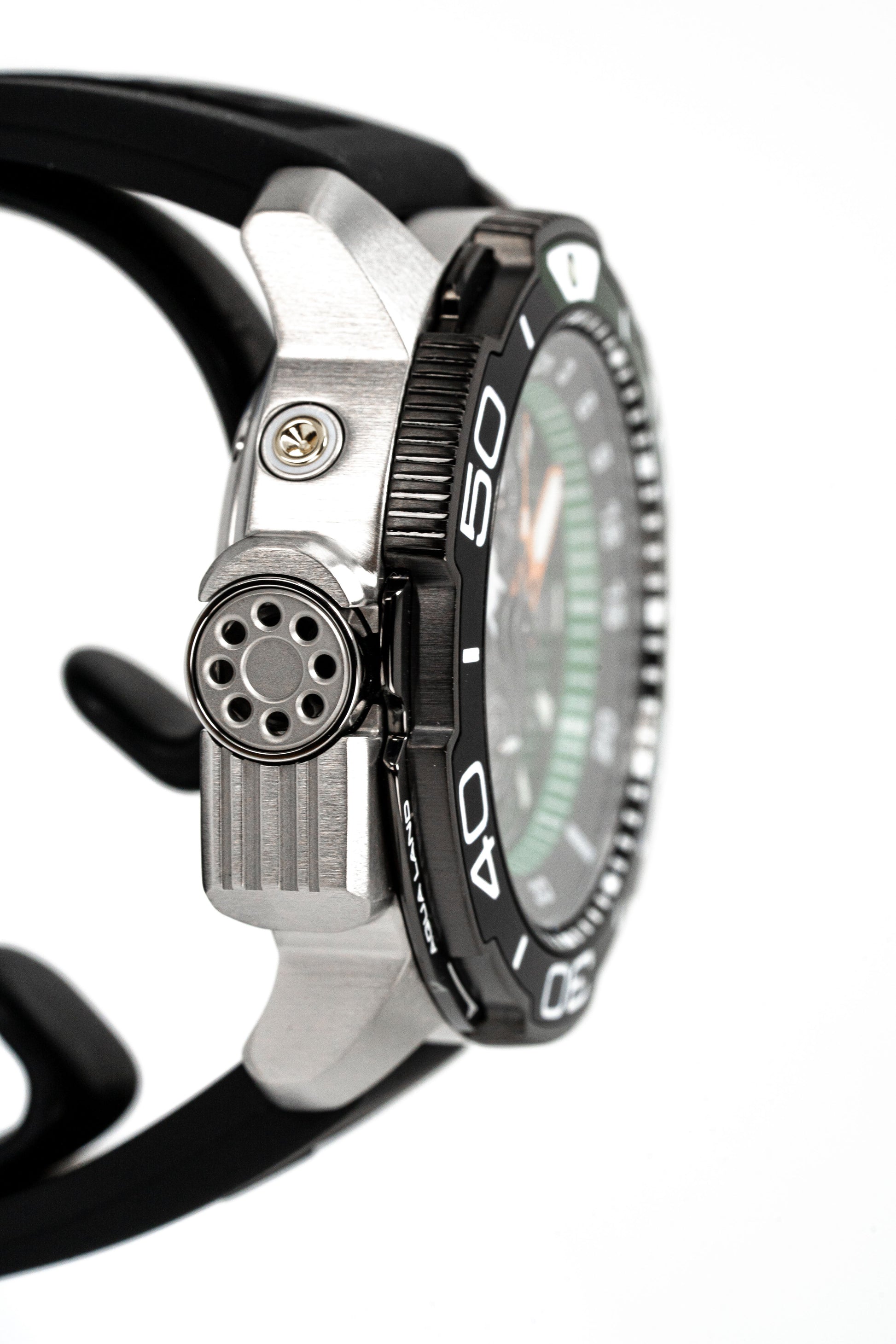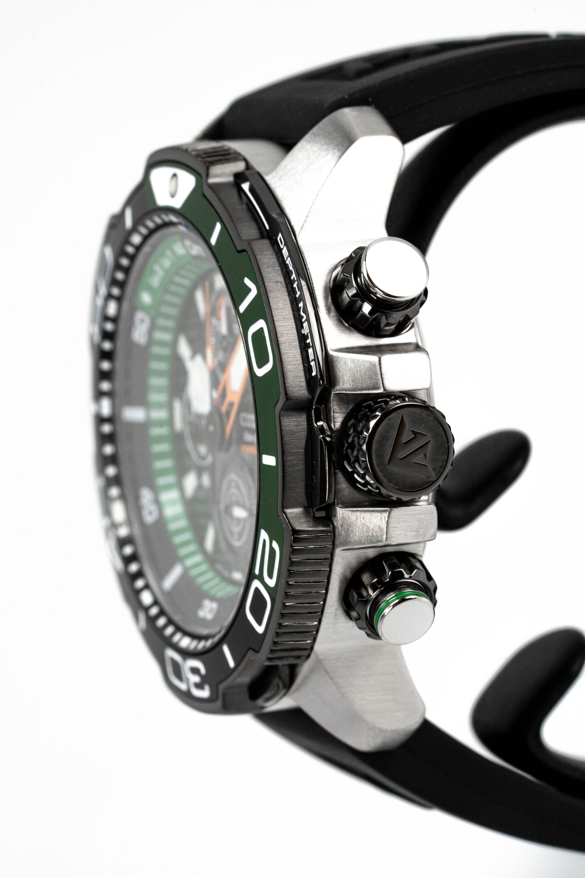 47mm x 16mm 316L Stainless Steel Case - Silver - Round Shape - Stainless Steel back, Bottom screwed-in, Screwed Crown - Green/Black Unidirectional Rotating Bezel.