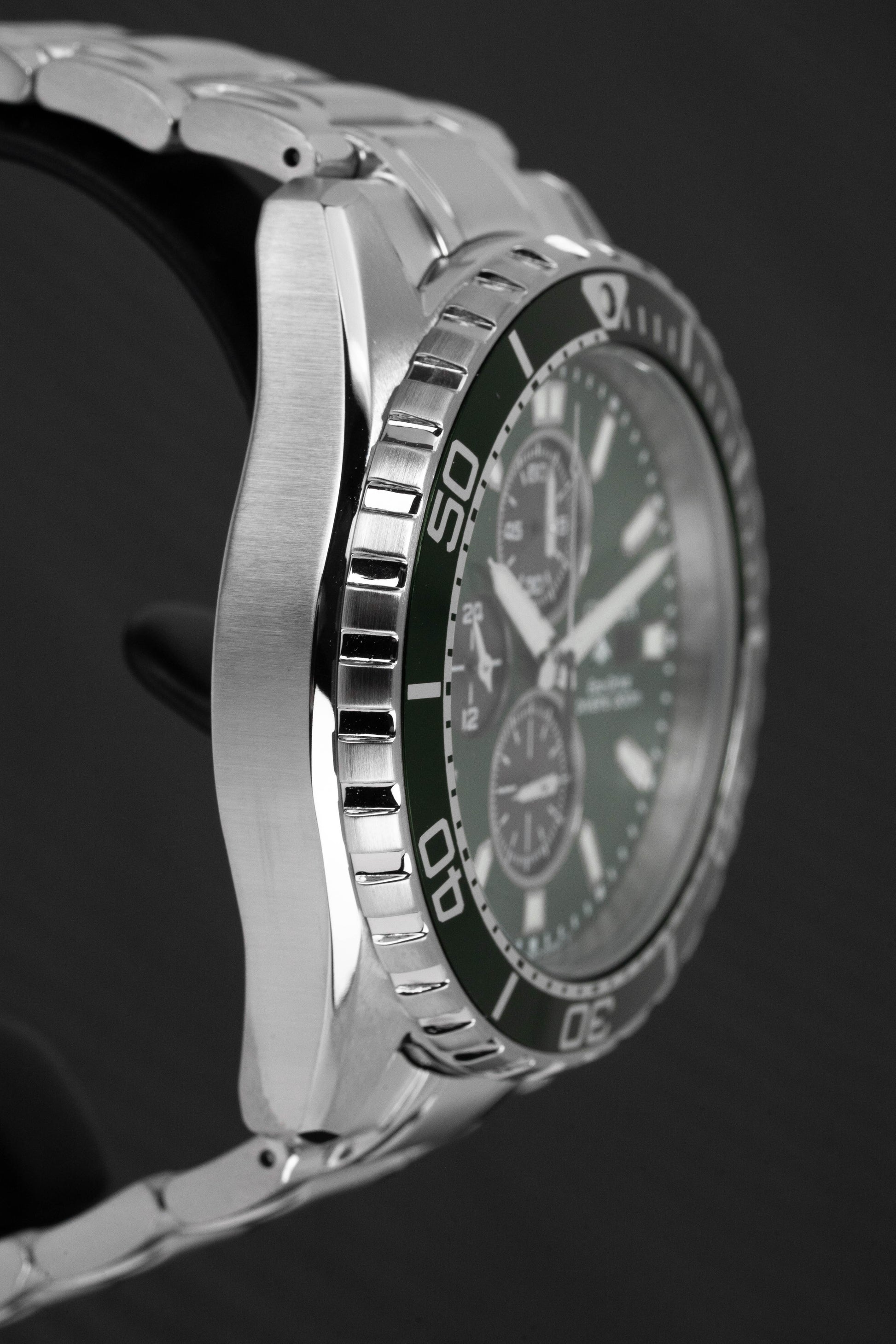Green Dial - Luminous Stainless Steel Hands and Hour Indexes - Date Window at 3 O'Clock - 60 Seconds, 60 Minutes, and 24 Hour Sub Dials.