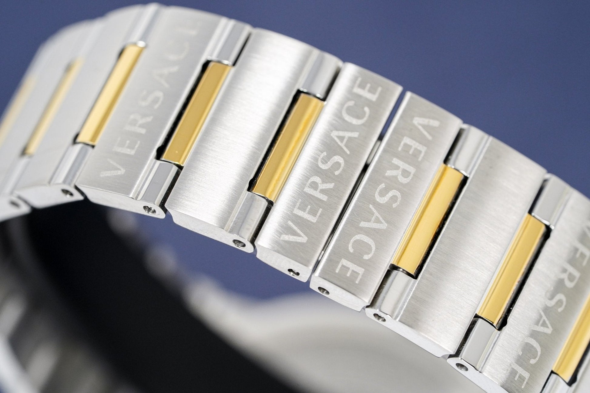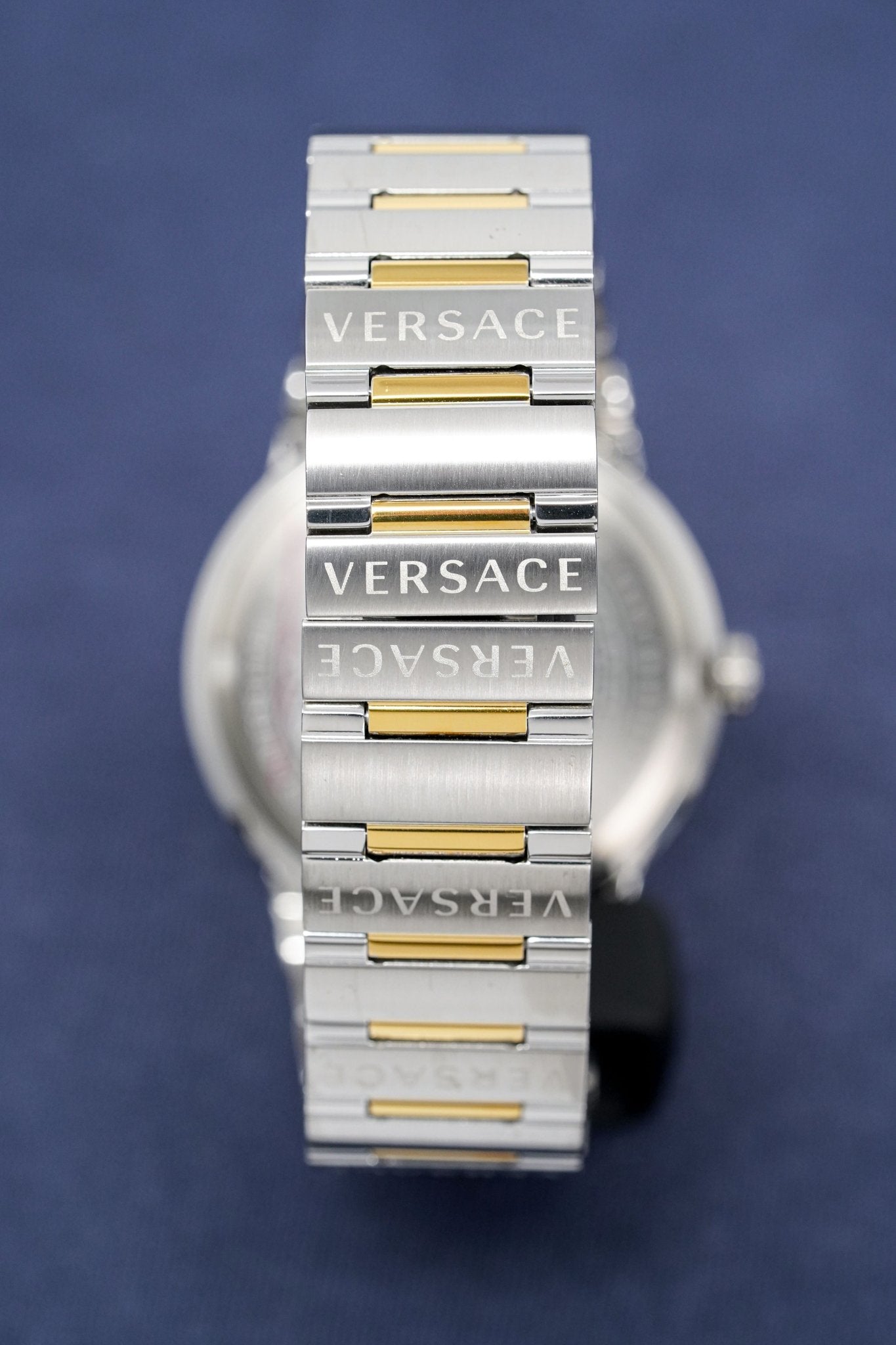 Case: 38mm x 9mm Brushed/Polished Stainless Steel - IP Gold Plated 316L Case Bezel - Greca Engraved Bezel with Screw Accents - Solid Stainless Steel Caseback with Versace Engraving - Ant-Reflective Sapphire Crystal Glass. Push-Pull Crown.