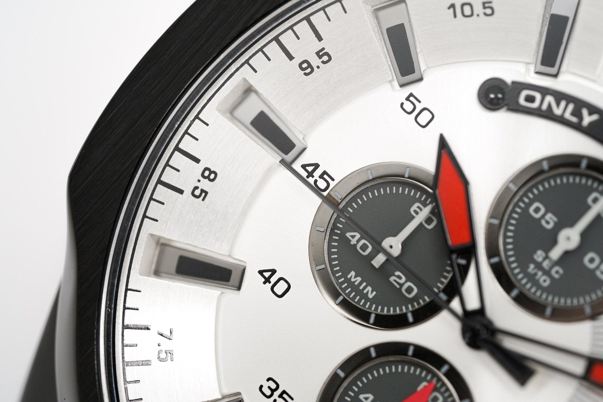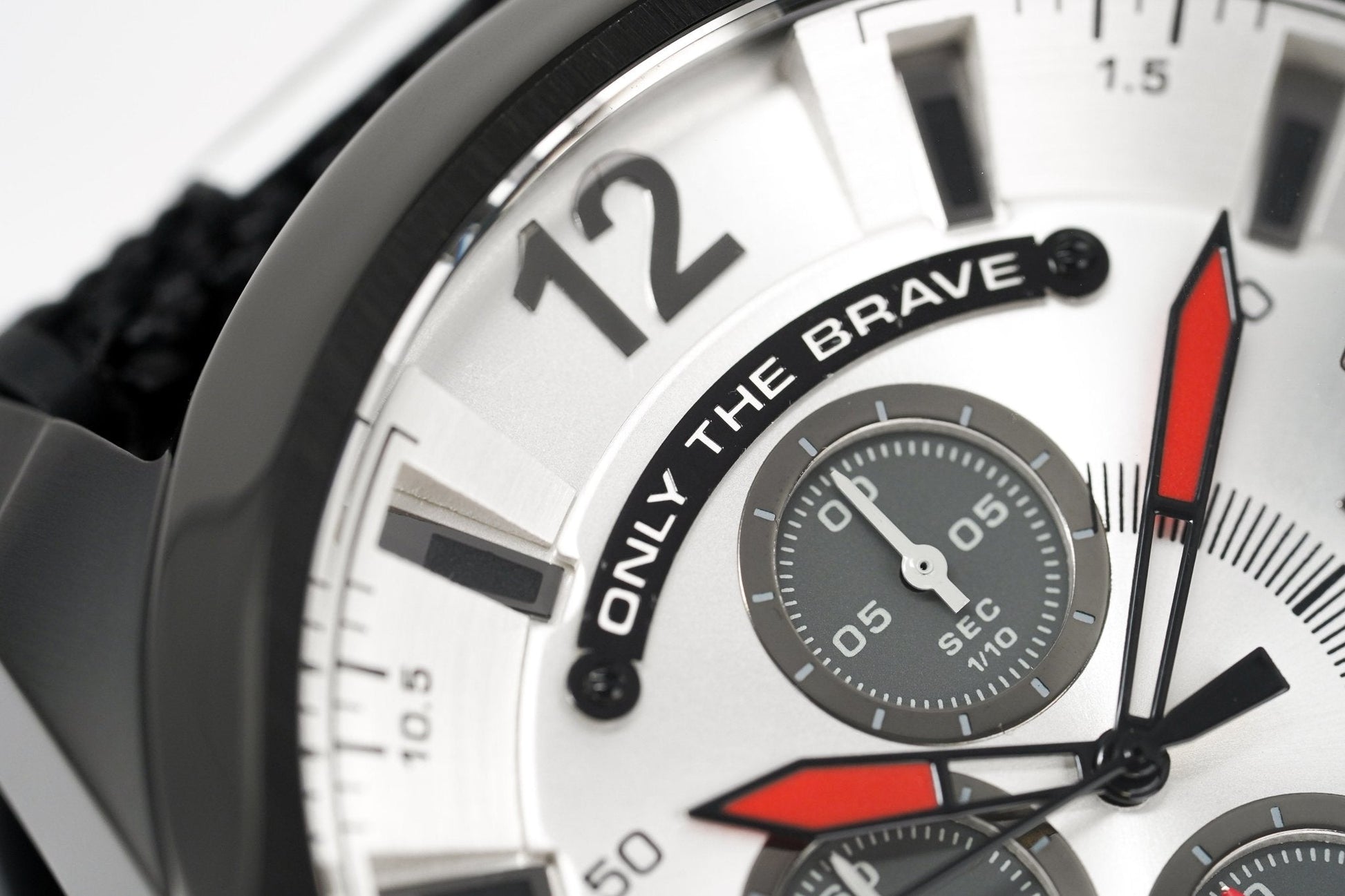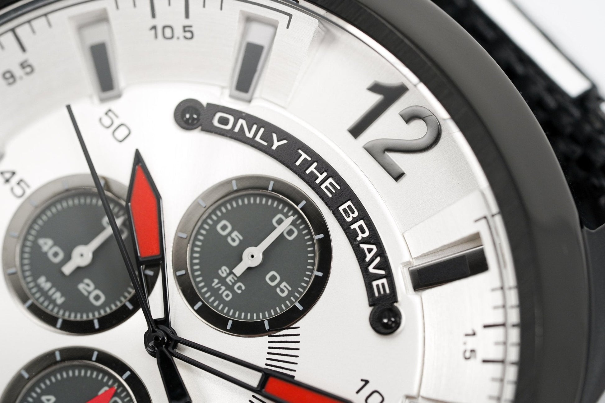 Grey Two-Layer Dial with Black Indexes - Grey Arabic Digit at 12 O'Clock - Chronograph Movement with Date - Luminous White/Grey Hour and Minute Hands - Black Seconds Hand - Date at 3 O'Clock - 1/10 Second subdial at 12 O'Clock, 60 Seconds Subdial at 6 O'Clock and 60 Minute Subdial at 9 O'Clock - Only the Brave Plate at 12 O'Clock - Push-Pull Crown with Stopwatch Functions.