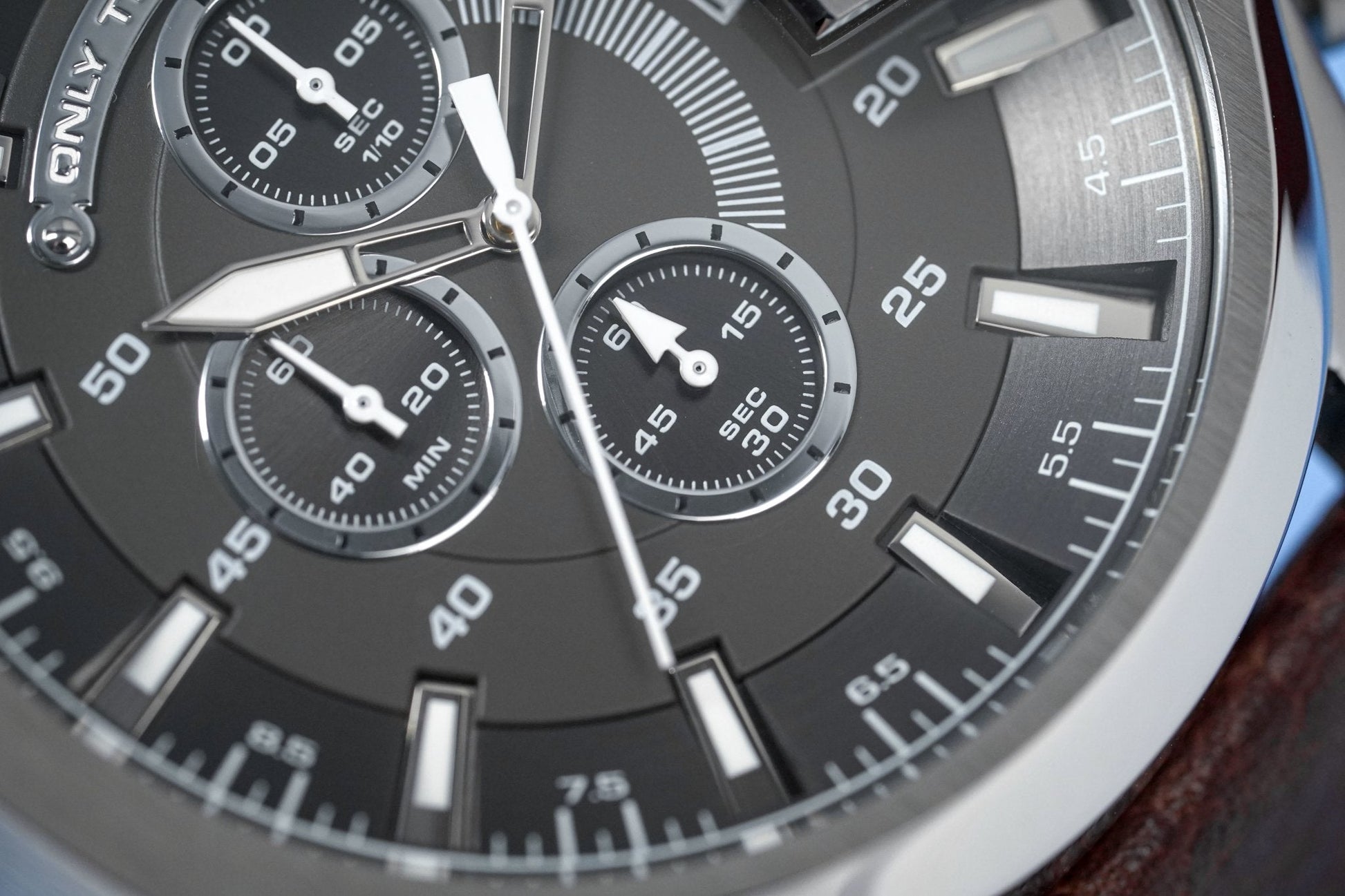 Grey Two-Layer Dial with Silver and White Indexes - Silver Arabic Digit at 12 O'Clock - Chronograph Movement with Date - Luminous Silver/White Hour and Minute Hands - White Seconds Hand - Date at 3 O'Clock - 1/10 Second subdial at 12 O'Clock, 60 Seconds Subdial at 6 O'Clock and 60 Minute Subdial at 9 O'Clock - Only the Brave Engraved at 12 O'Clock - Push-Pull Crown with Stopwatch Functions.
