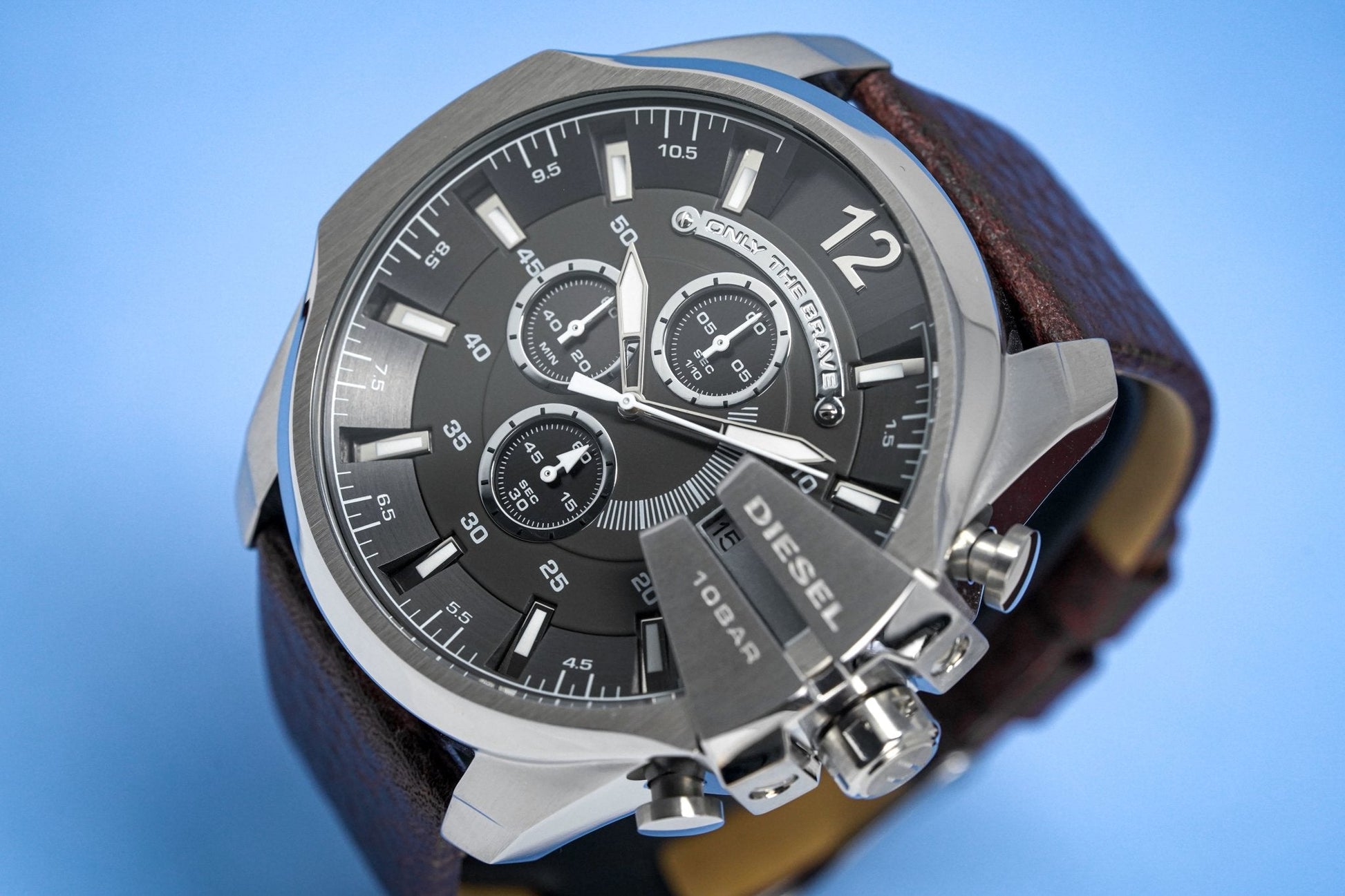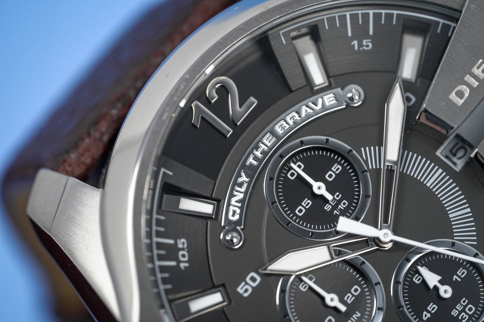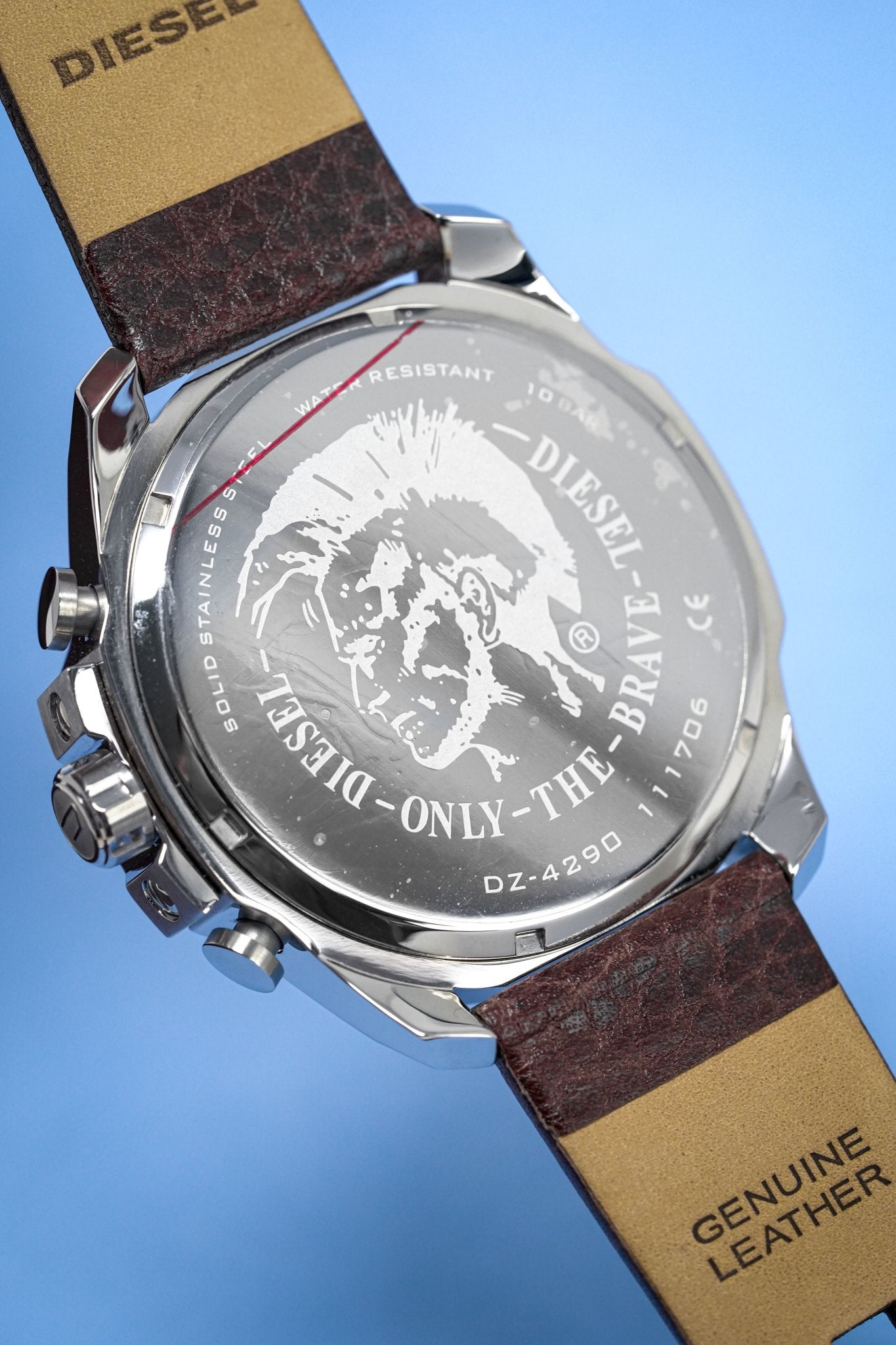 52mm x 12mm 316L Stainless Steel Case with a Polished and Brushed Finish - Fixed Stainless Steel Bezel with Diesel Engraved - Solid Stainless Steel Caseback - Scratch Resistant Mineral Crystal Glass.