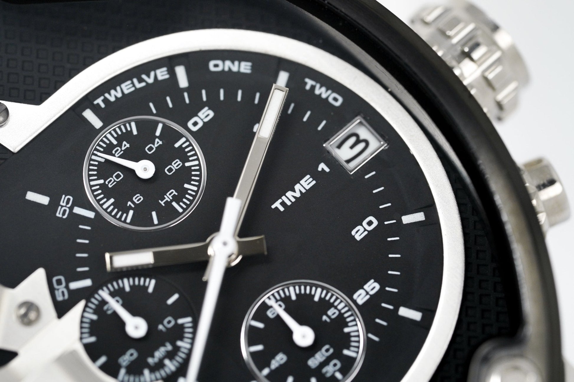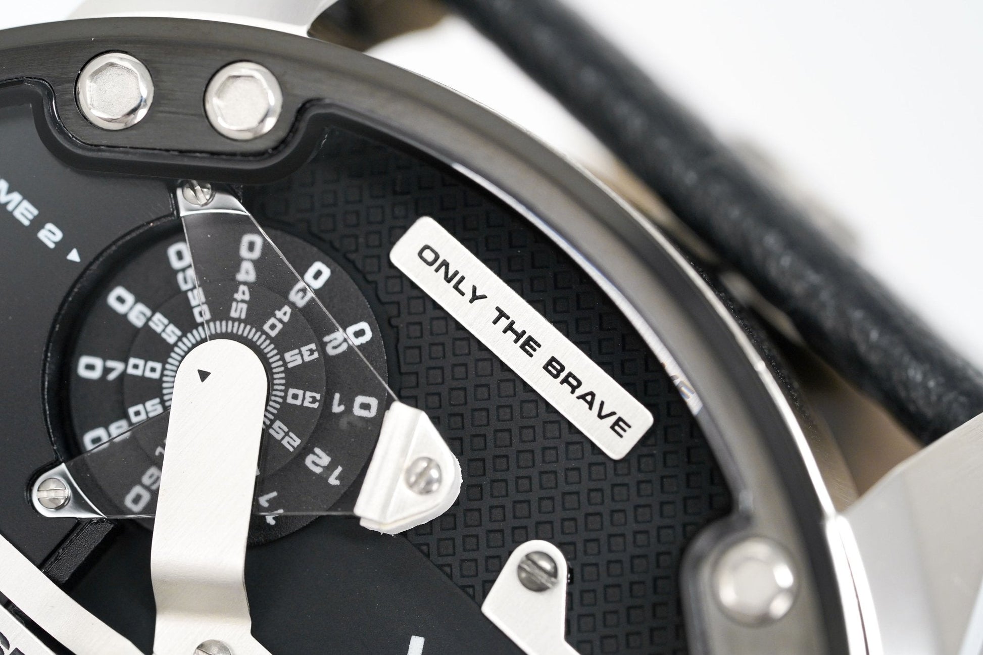 Black Two-Layer Dial with Black Indexes - Chronograph Movement with 4 Time Zones and Date - Black Hour, Minute and Seconds Hand - Date at 3 O'Clock - 1/10 Second, 60 Seconds, and 60 Minute Subdial at 3 O'Clock - Only the Brave Engraved at 12 O'Clock - 4 Push-Pull Crowns with Stopwatch Functions - Hour and Minute Discs at 7 and 11 O'Clock.