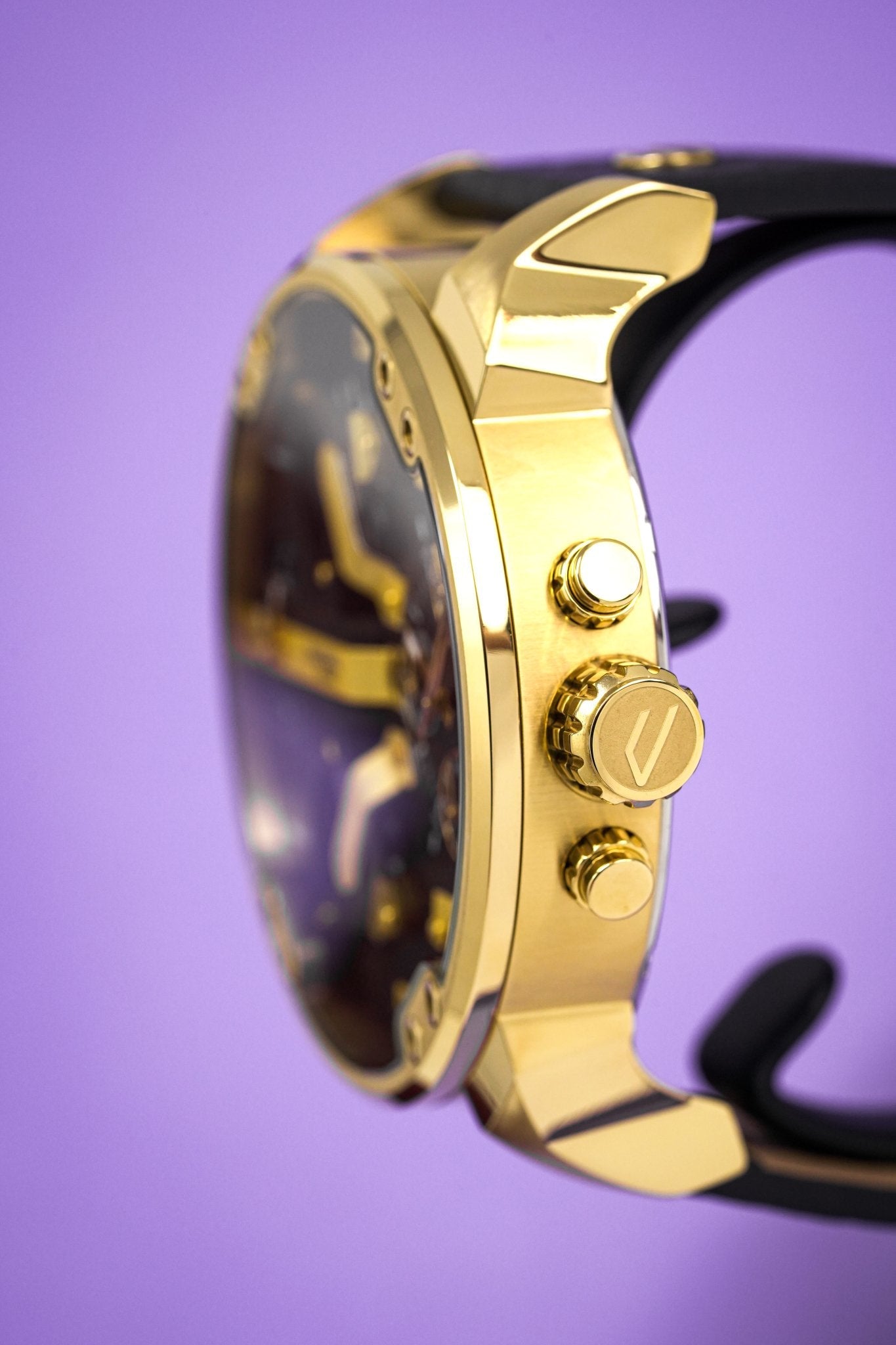 57mm x 14mm IP Gold 316L Stainless Steel Case with a Polished and Brushed Finish - Fixed IP Gold Stainless Steel Bezel with Bolt Accents - Solid Stainless Steel Caseback - Scratch Resistant Mineral Crystal Glass.
