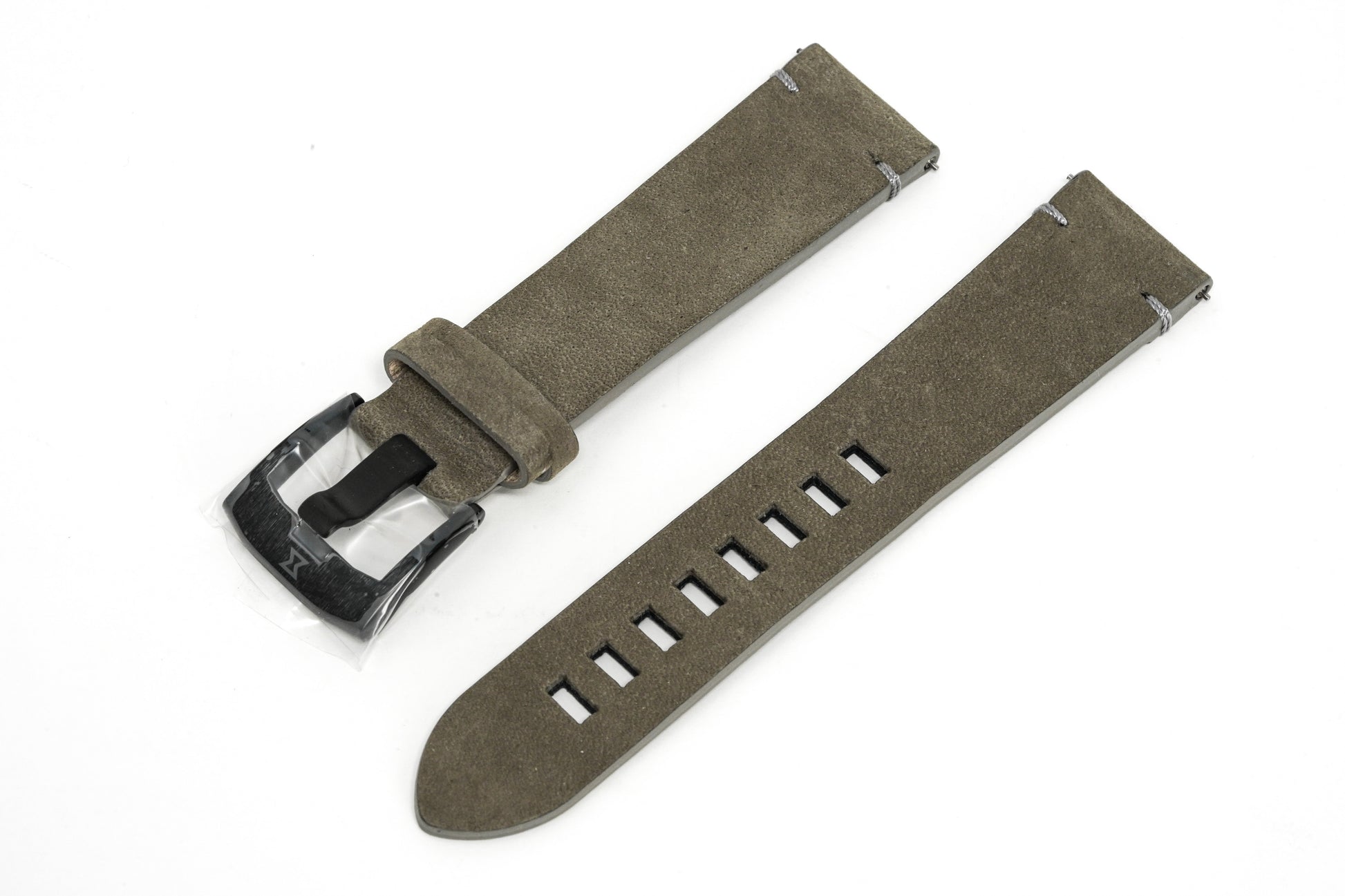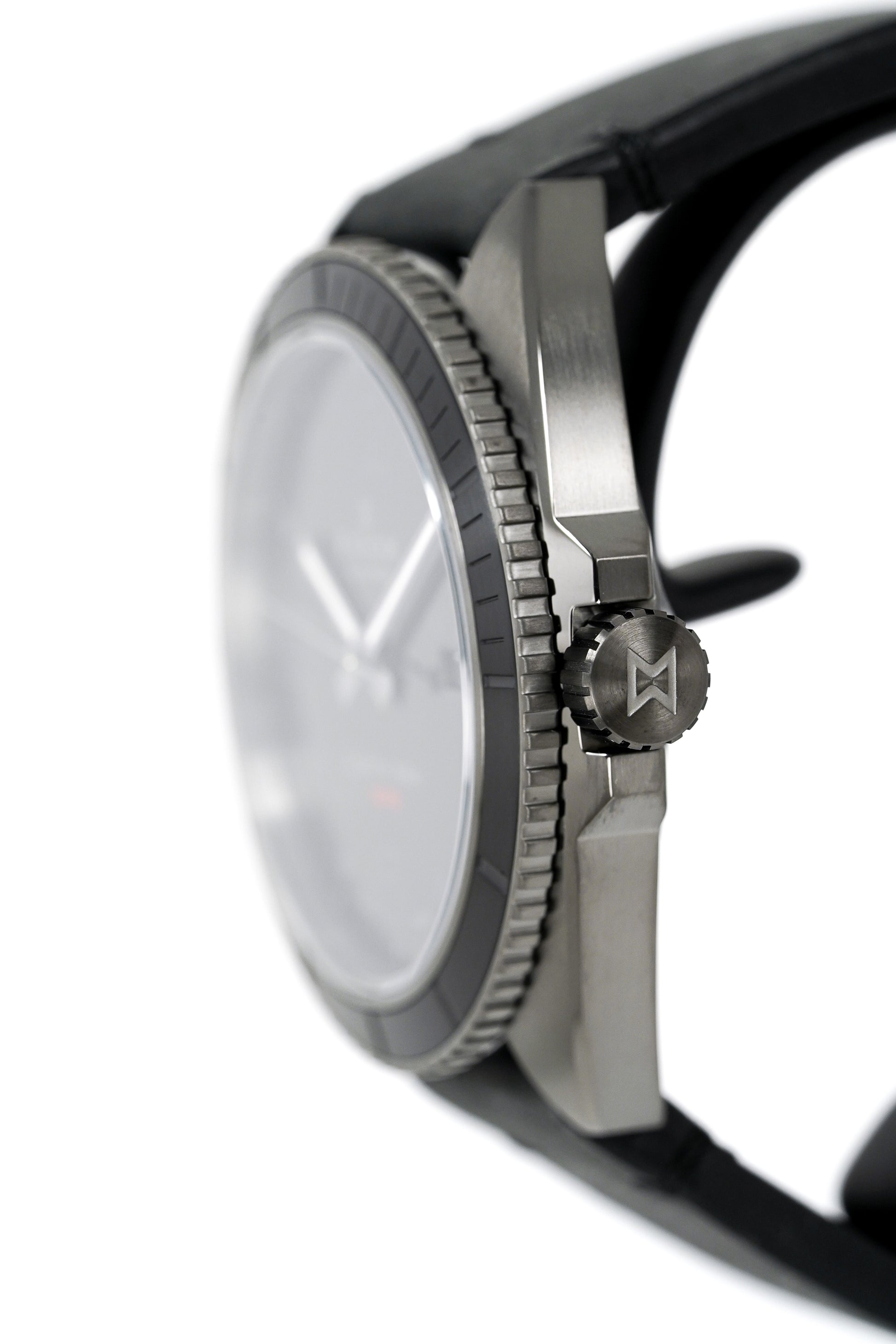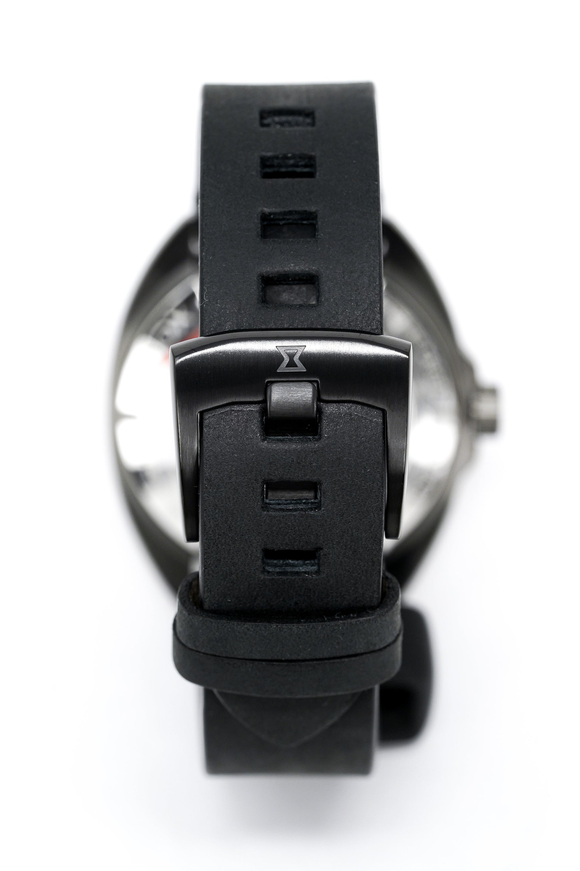 Black Leather Strap with Black PVD 316L Stainless Steel Buckle.