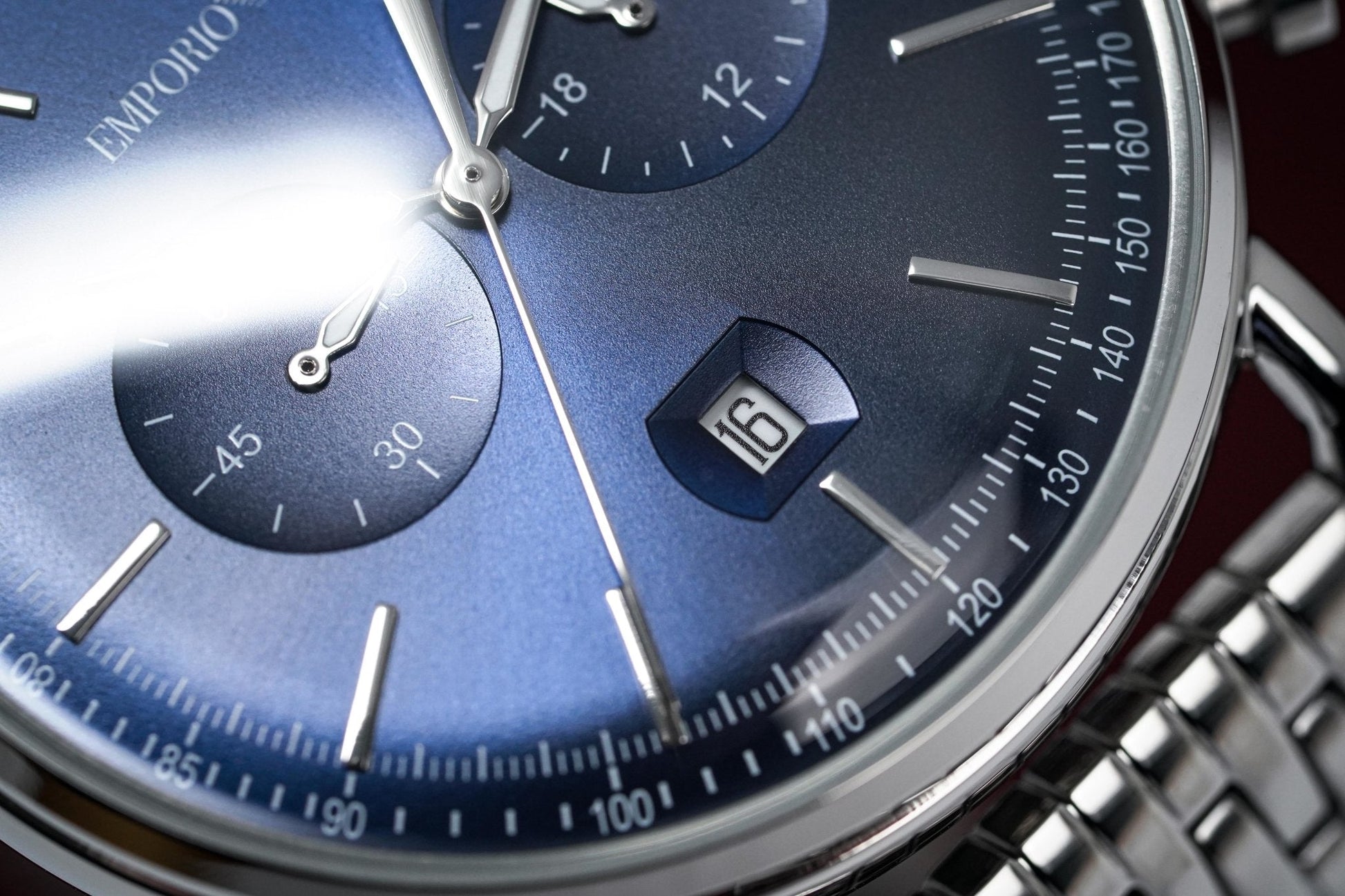 Blue Dial with Stainless Steel Hands and Indexes. Hour Counter at 3 O'Clock. 30 Minute Counter at 9 O'Clock. Date Window at 6 O'Clock