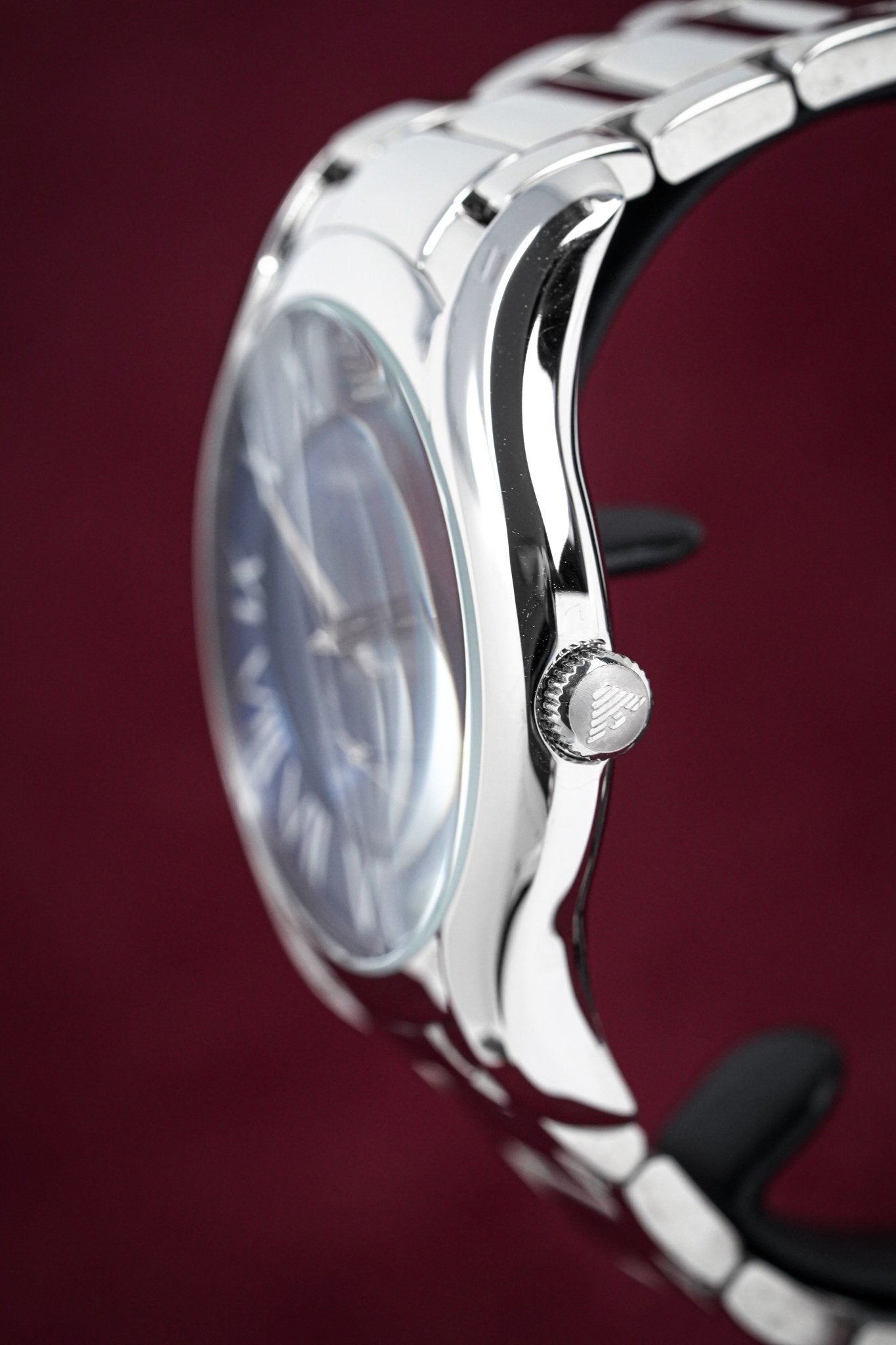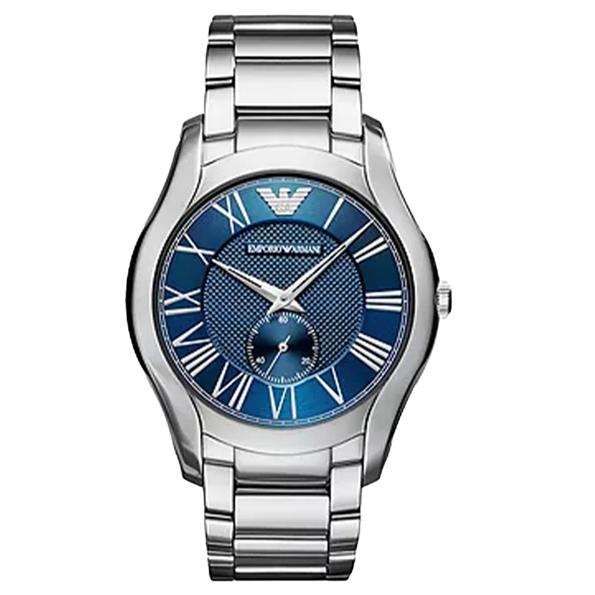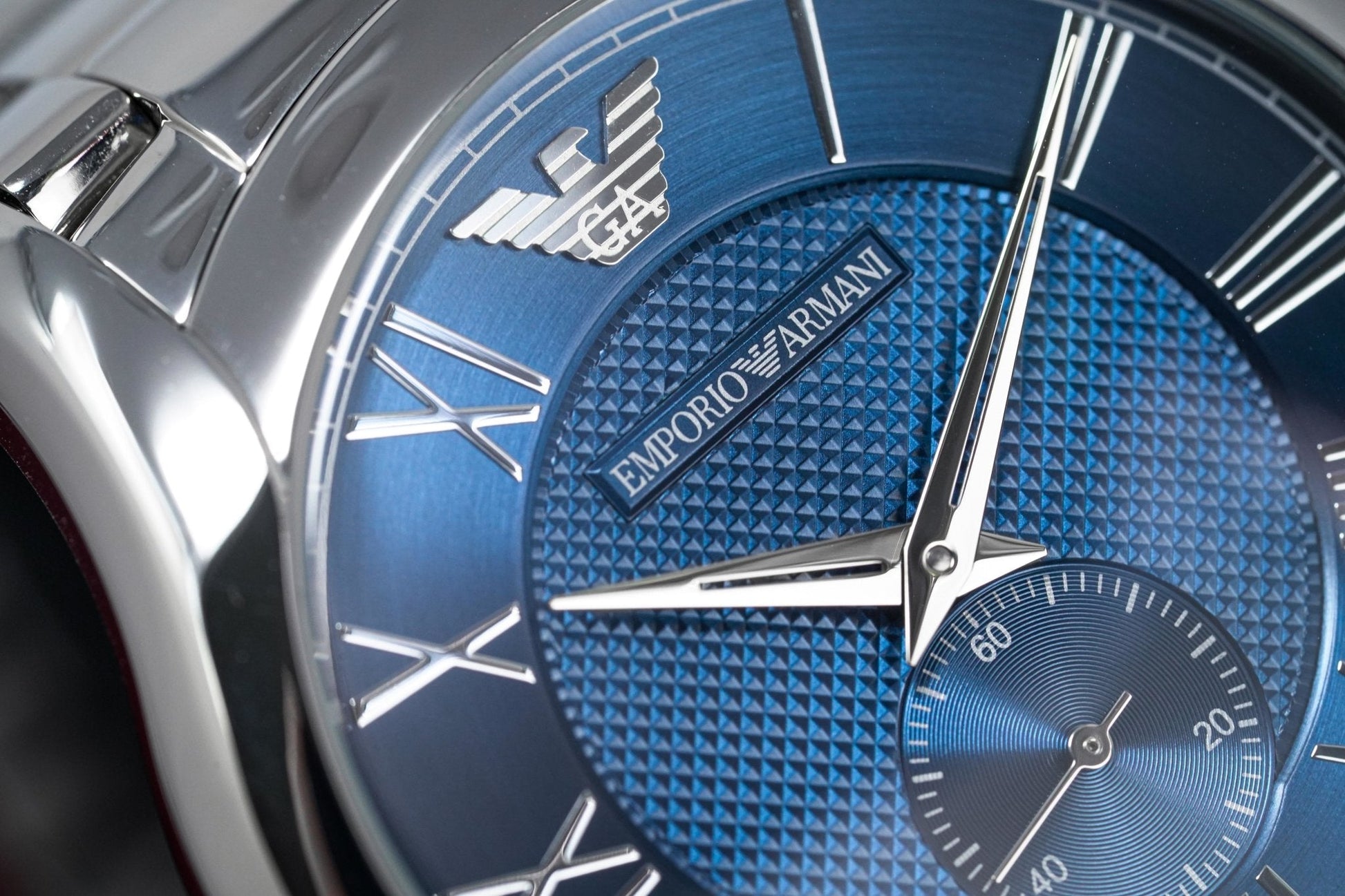Blue Textured Dial. Stainless Steel Hands and Indexes. Small Seconds at 6 O'Clock.
