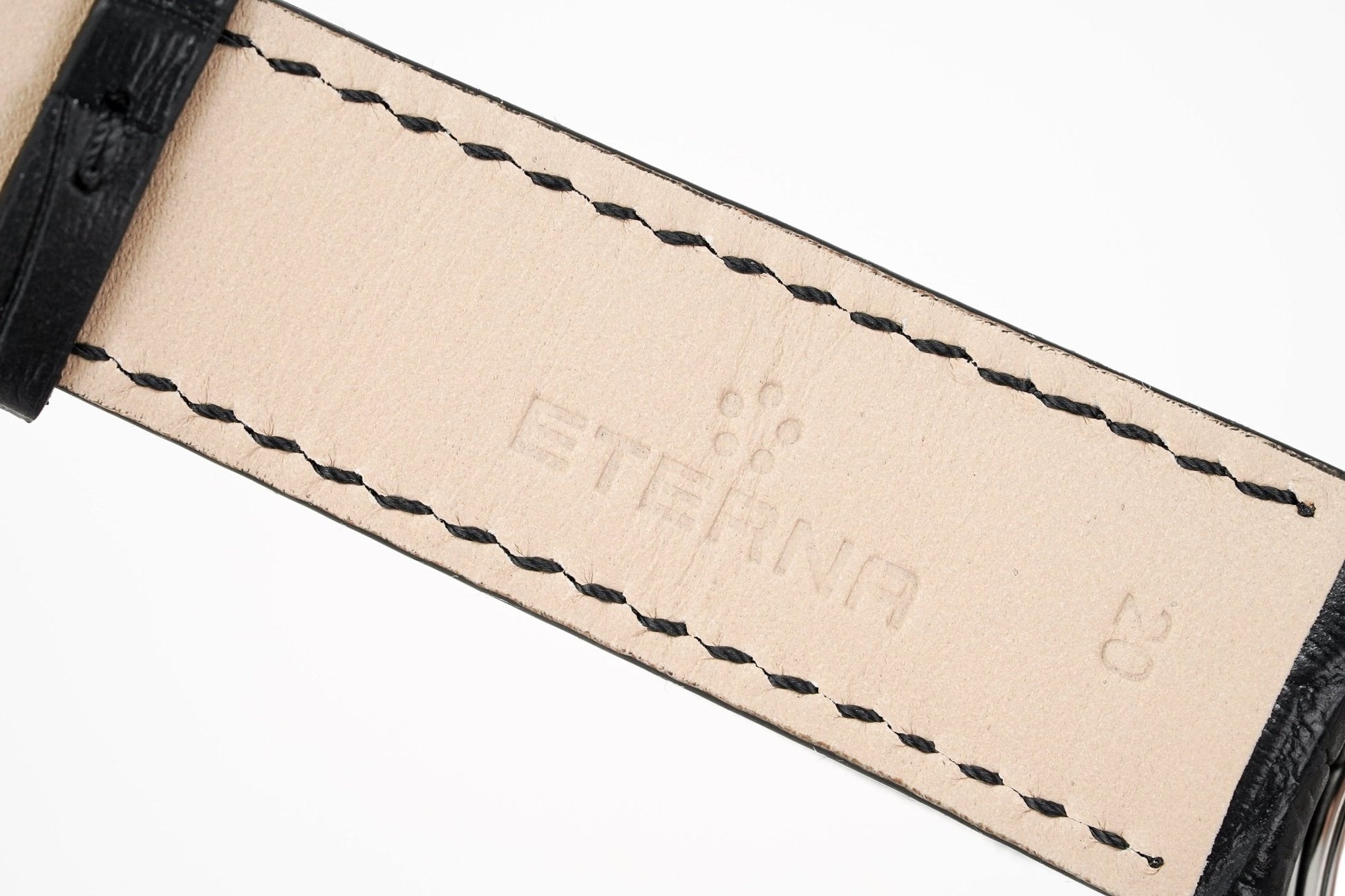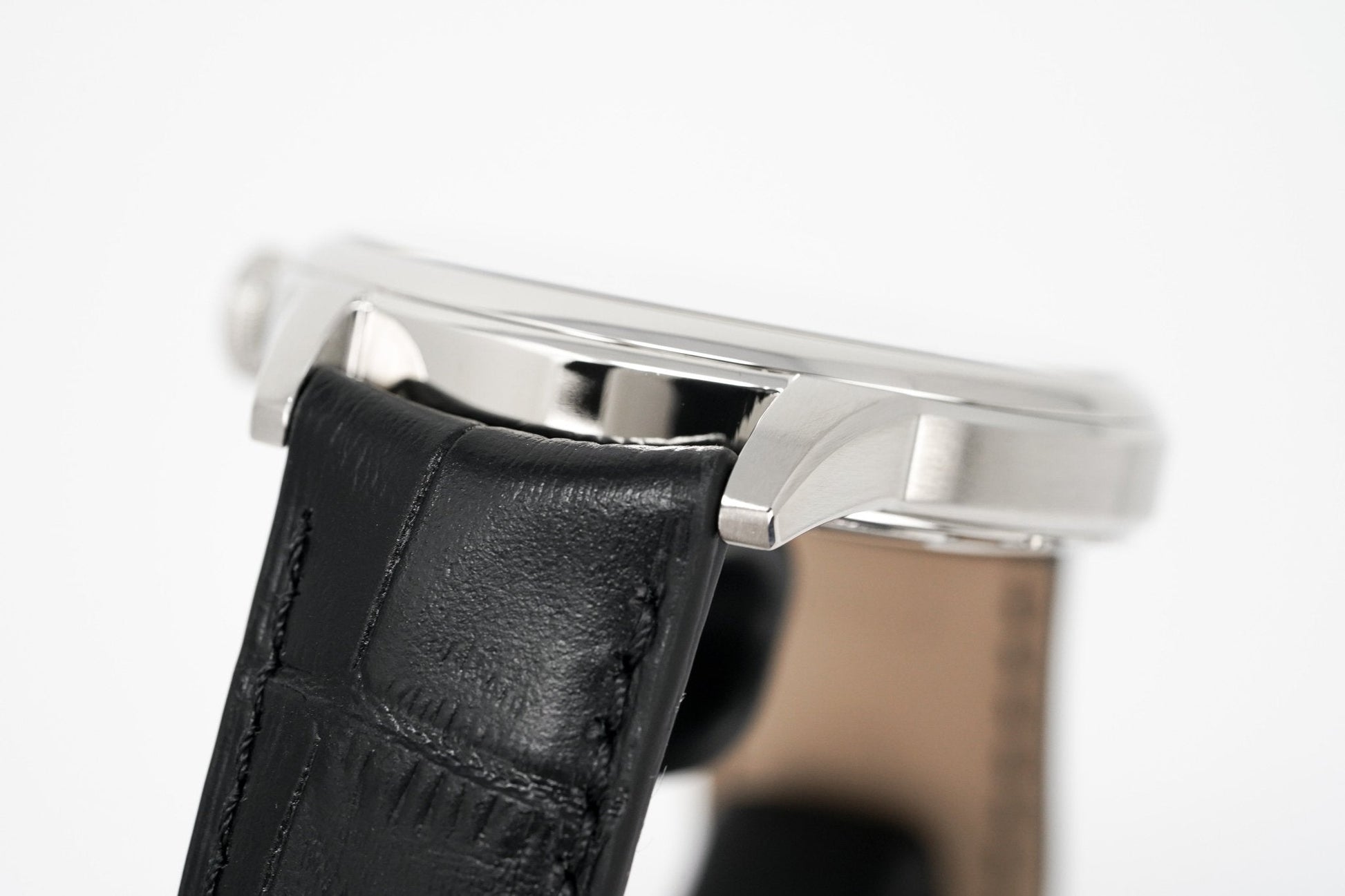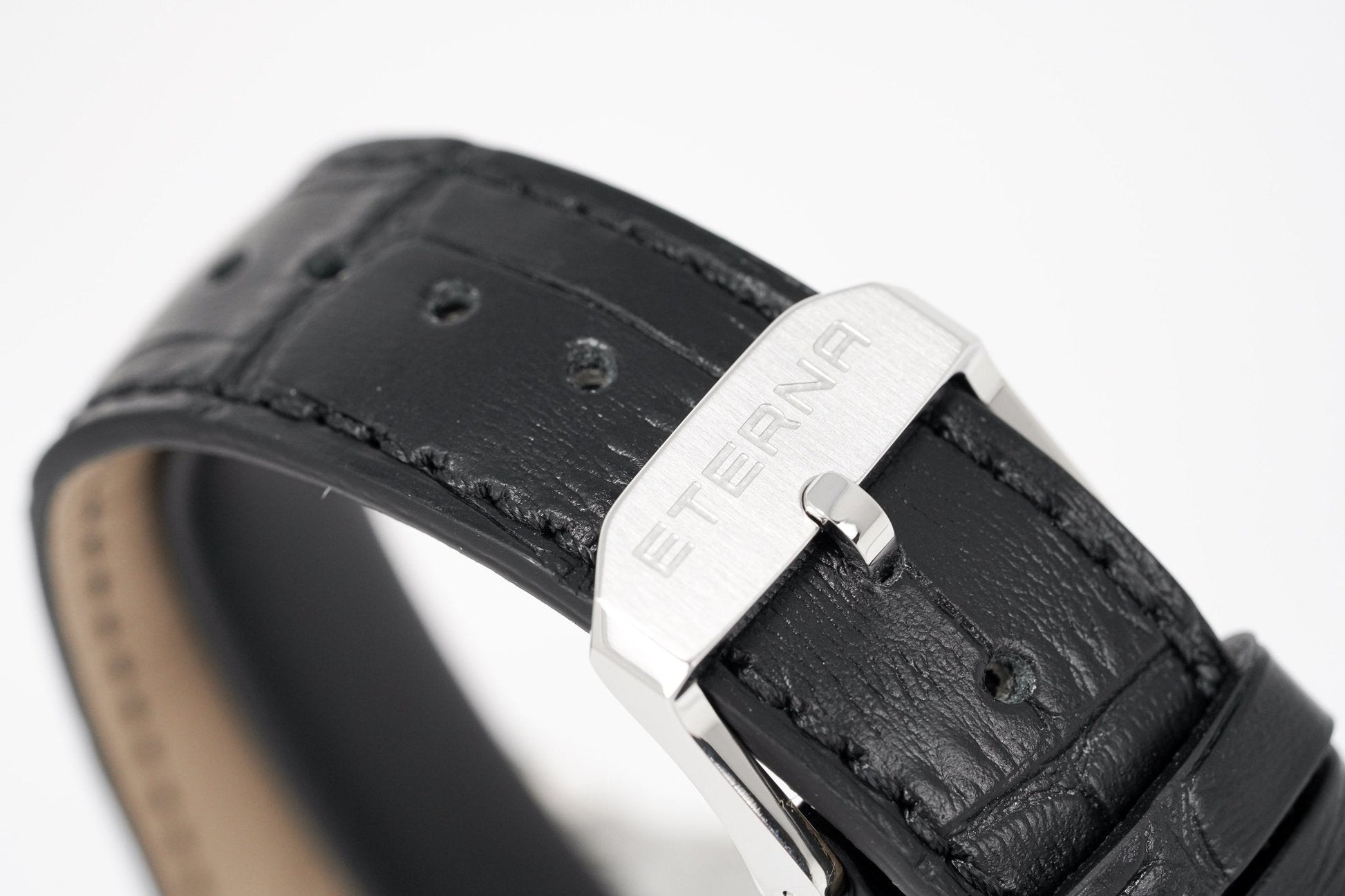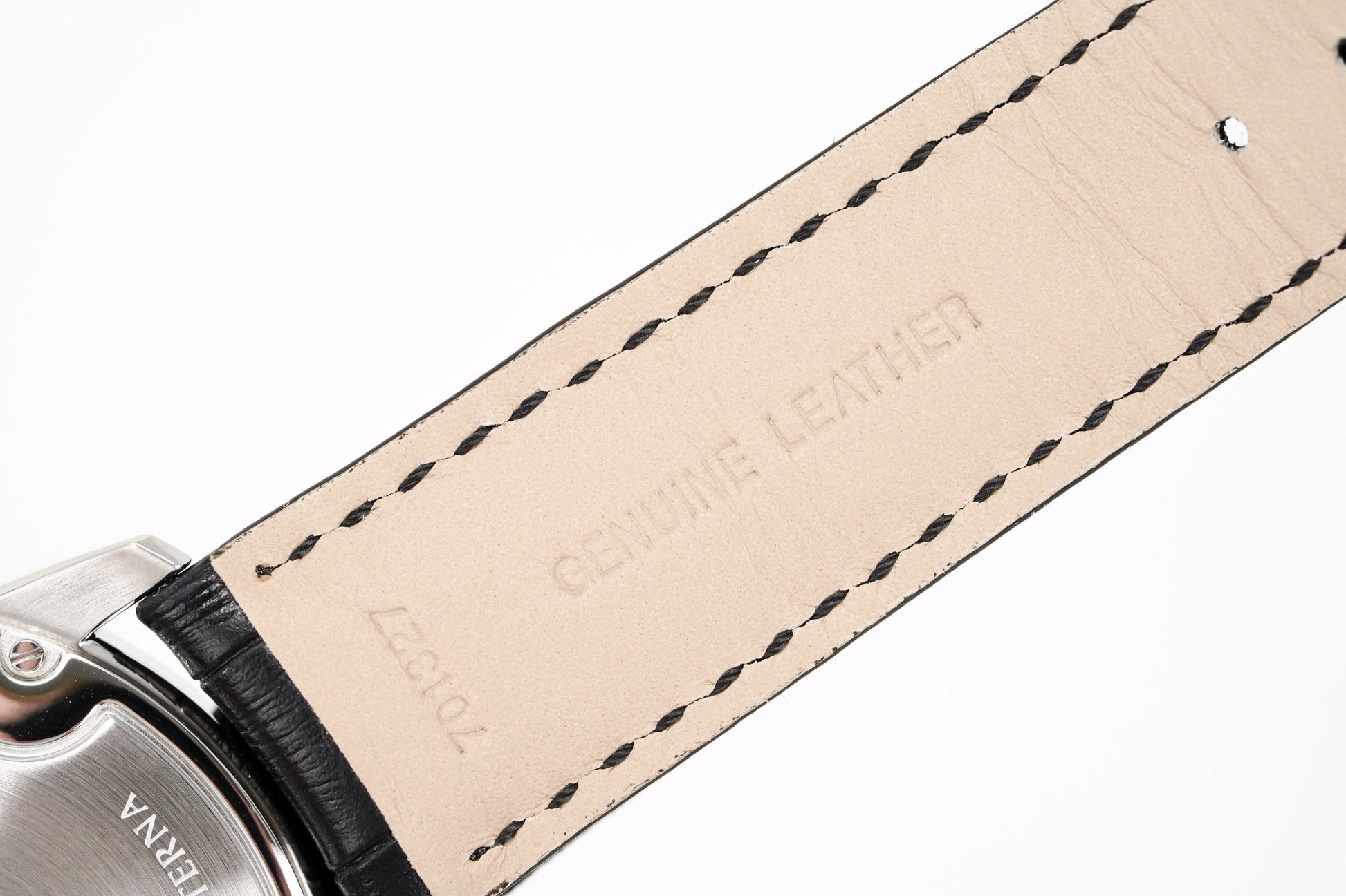 20MM Black Leather Strap with Black Stitching On A 316L Pin Buckle.