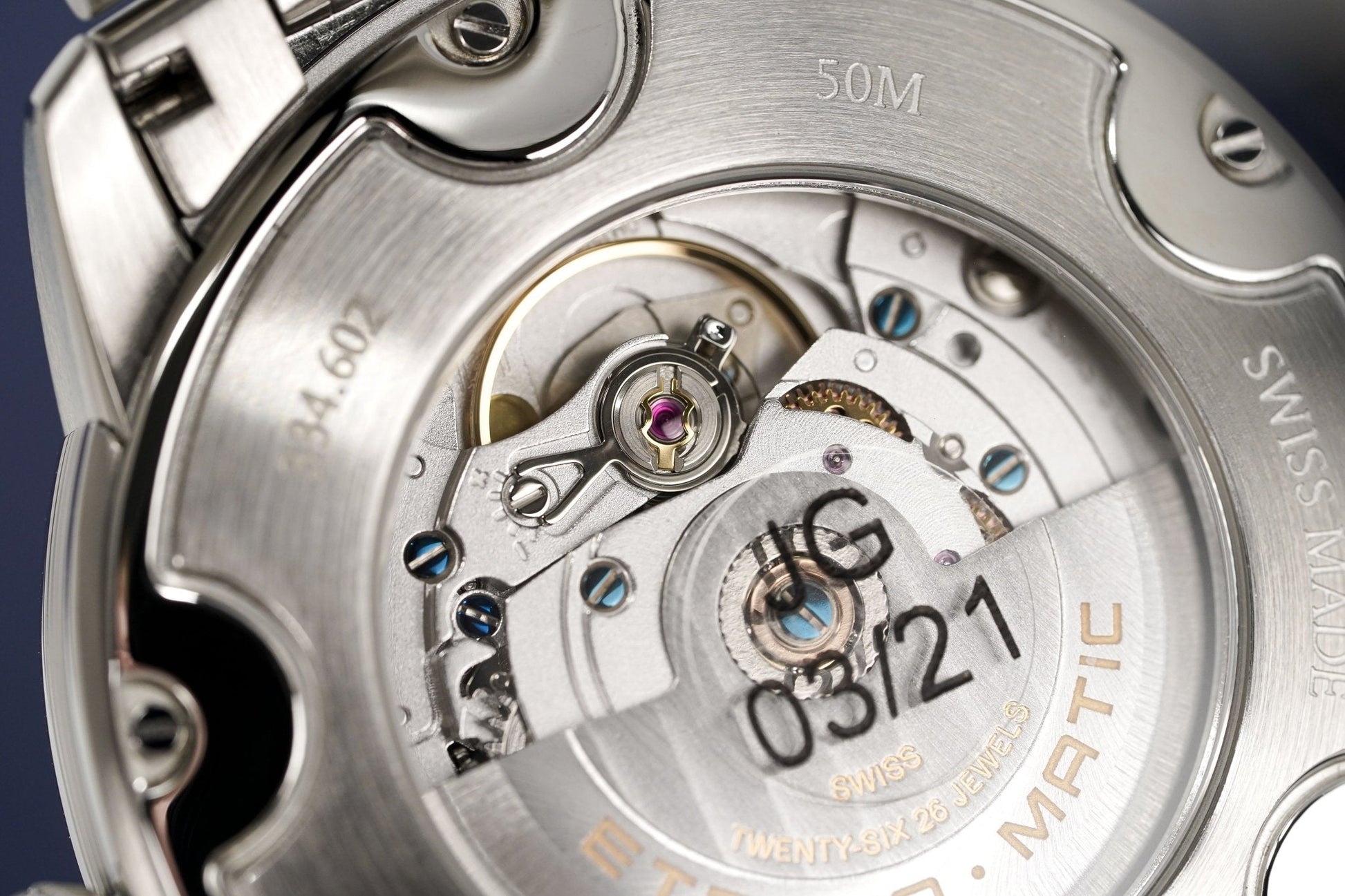 41mm 316L Stainless Steel Case, Exhibition Caseback, Smooth Bezel and Stainless Steel Crown. Sapphire Crystal.