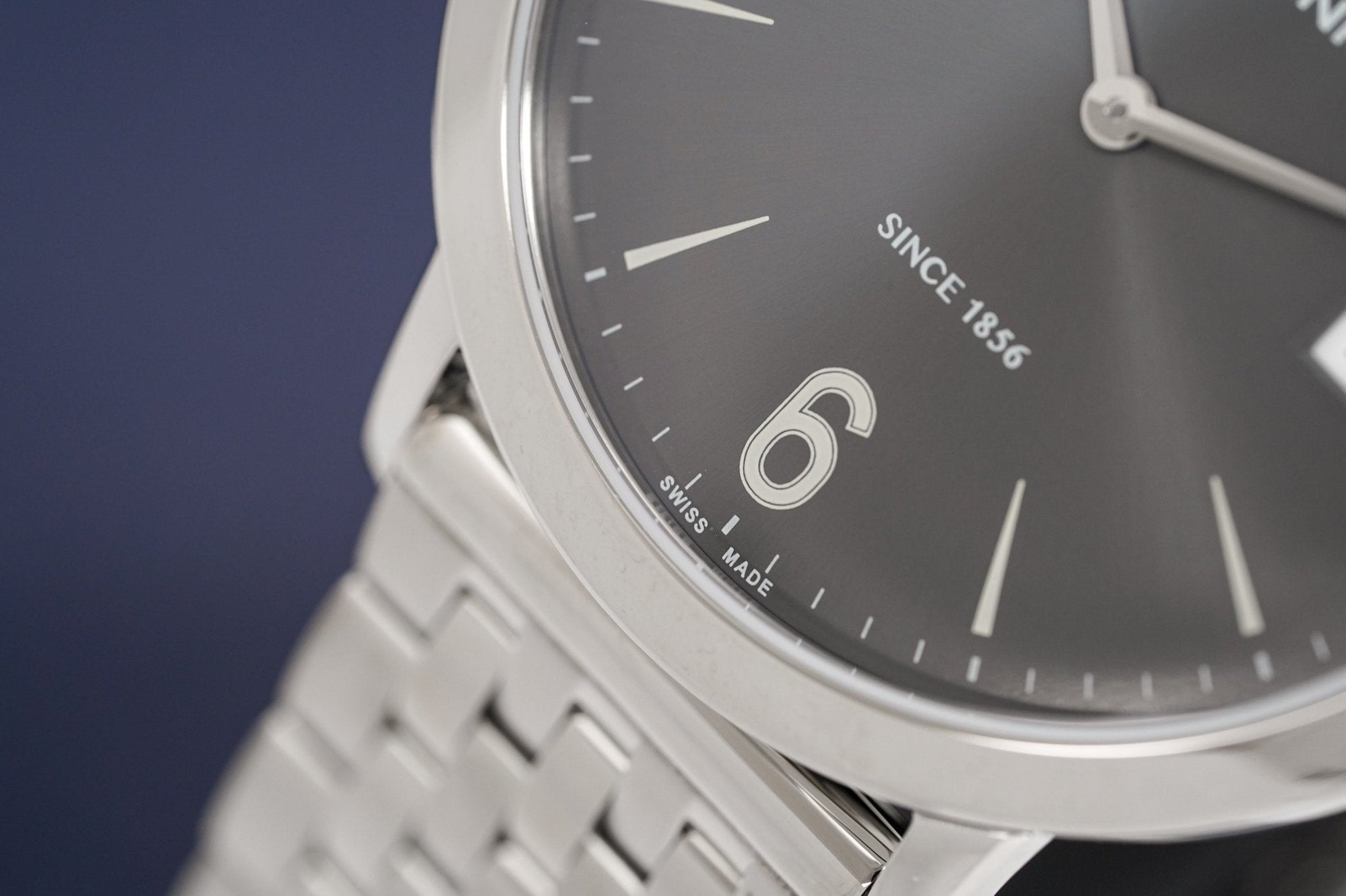 Grey Dial. Stainless Steel Hands and Arabic And Stick Luminous Markers.