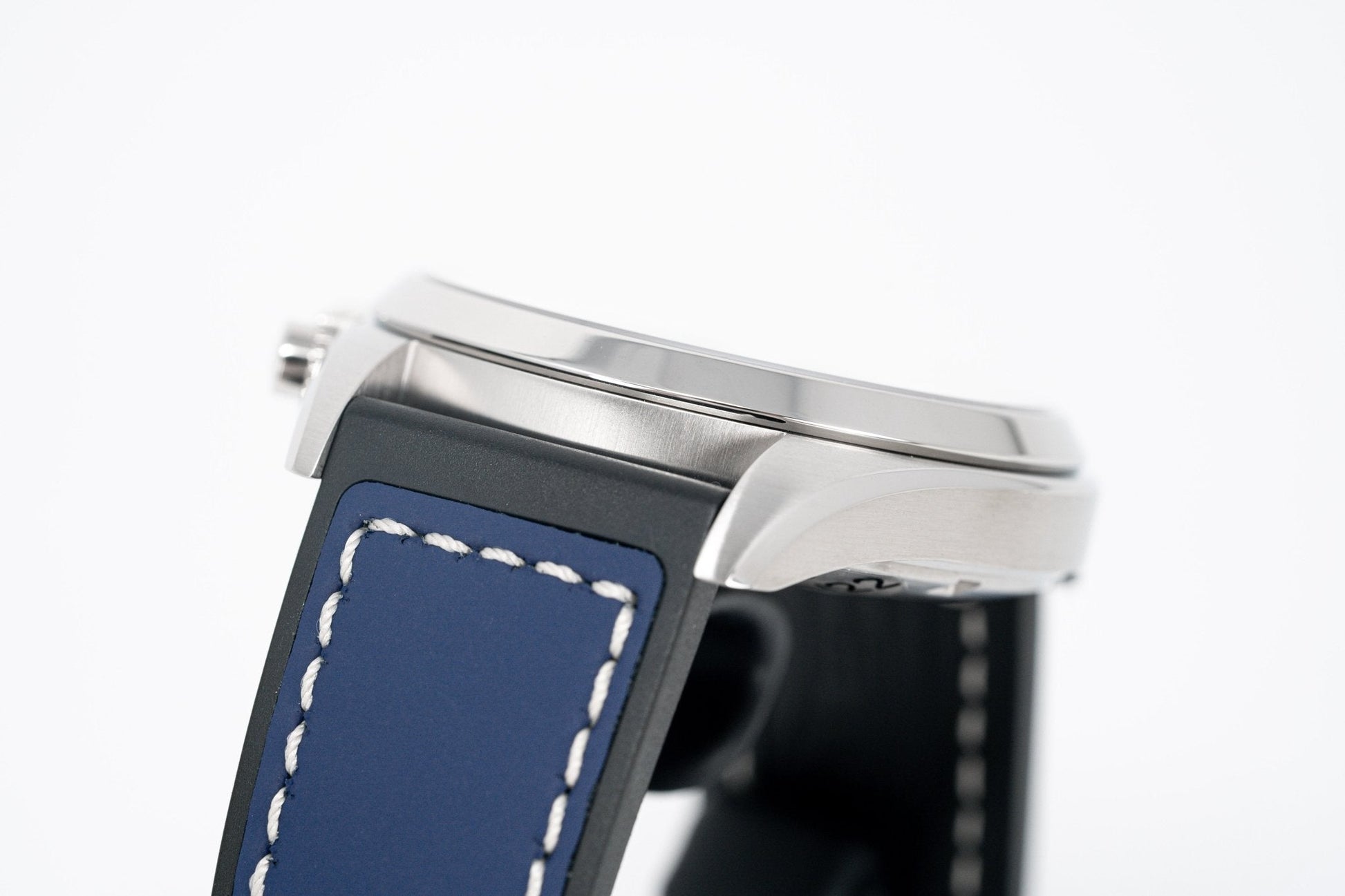 22MM Blue Leather Strap With Rubber Inlay and White stitching And 316L Stainless Steel Buckle.