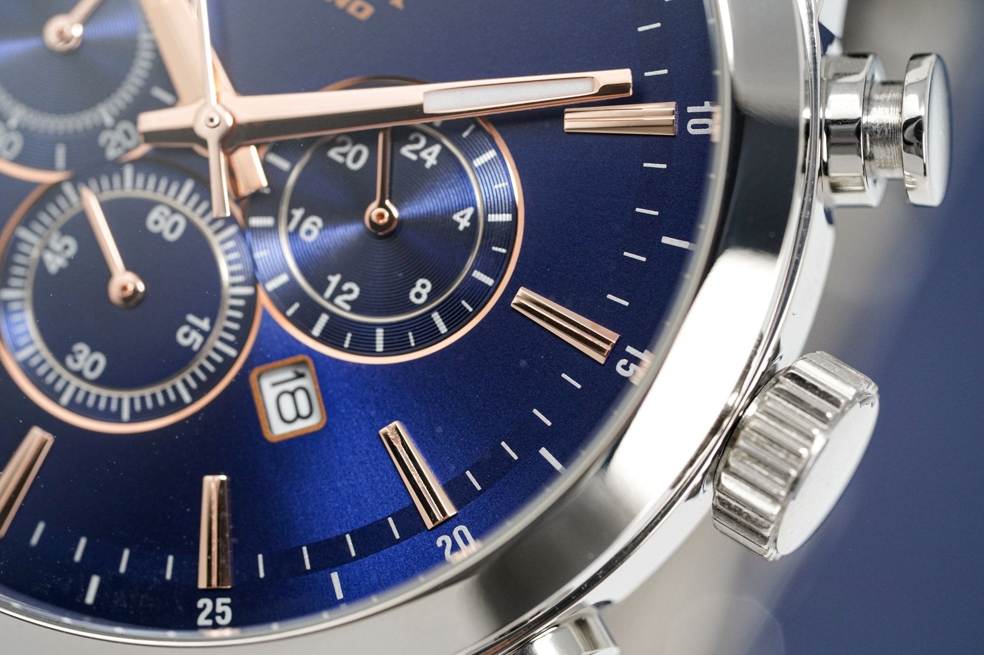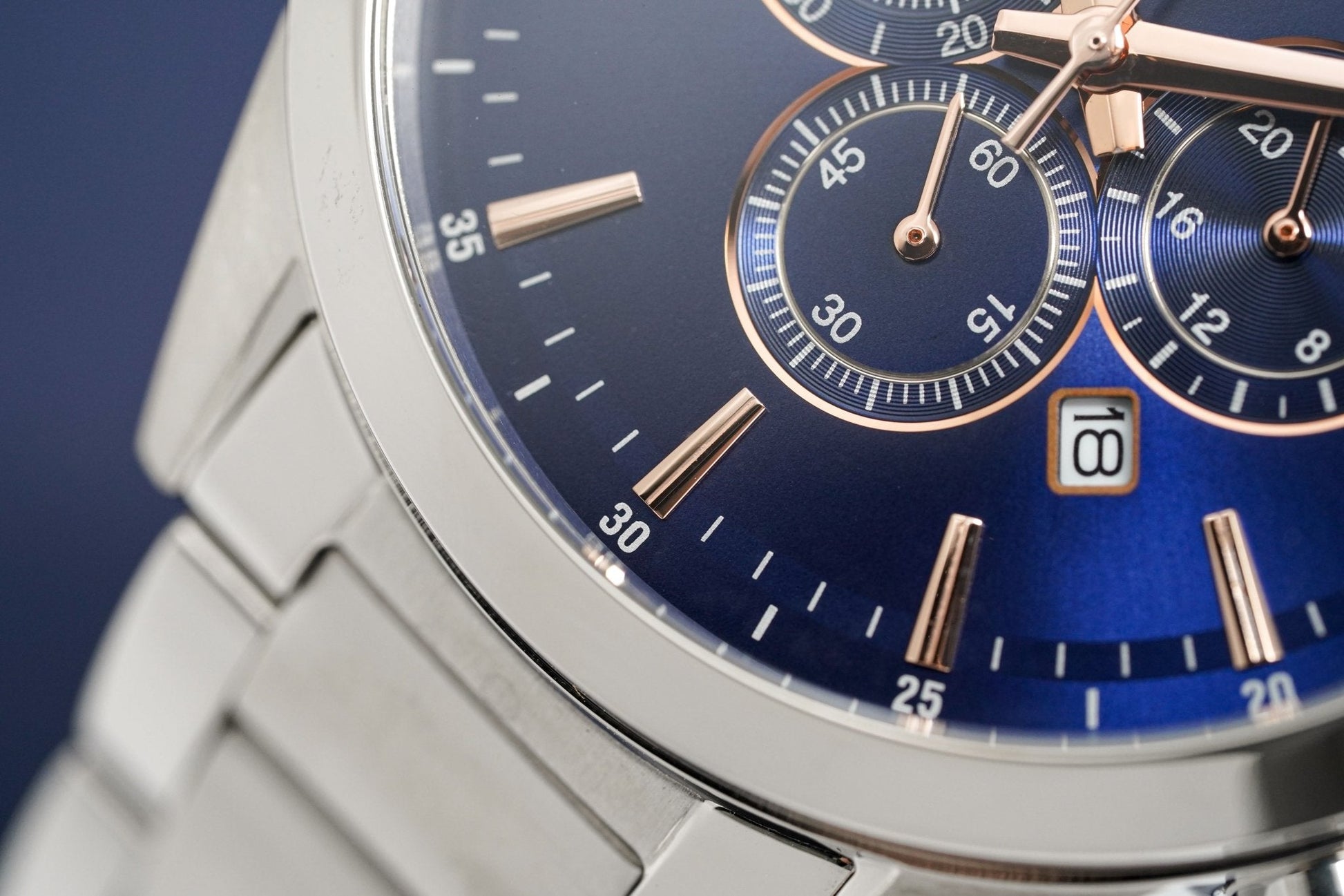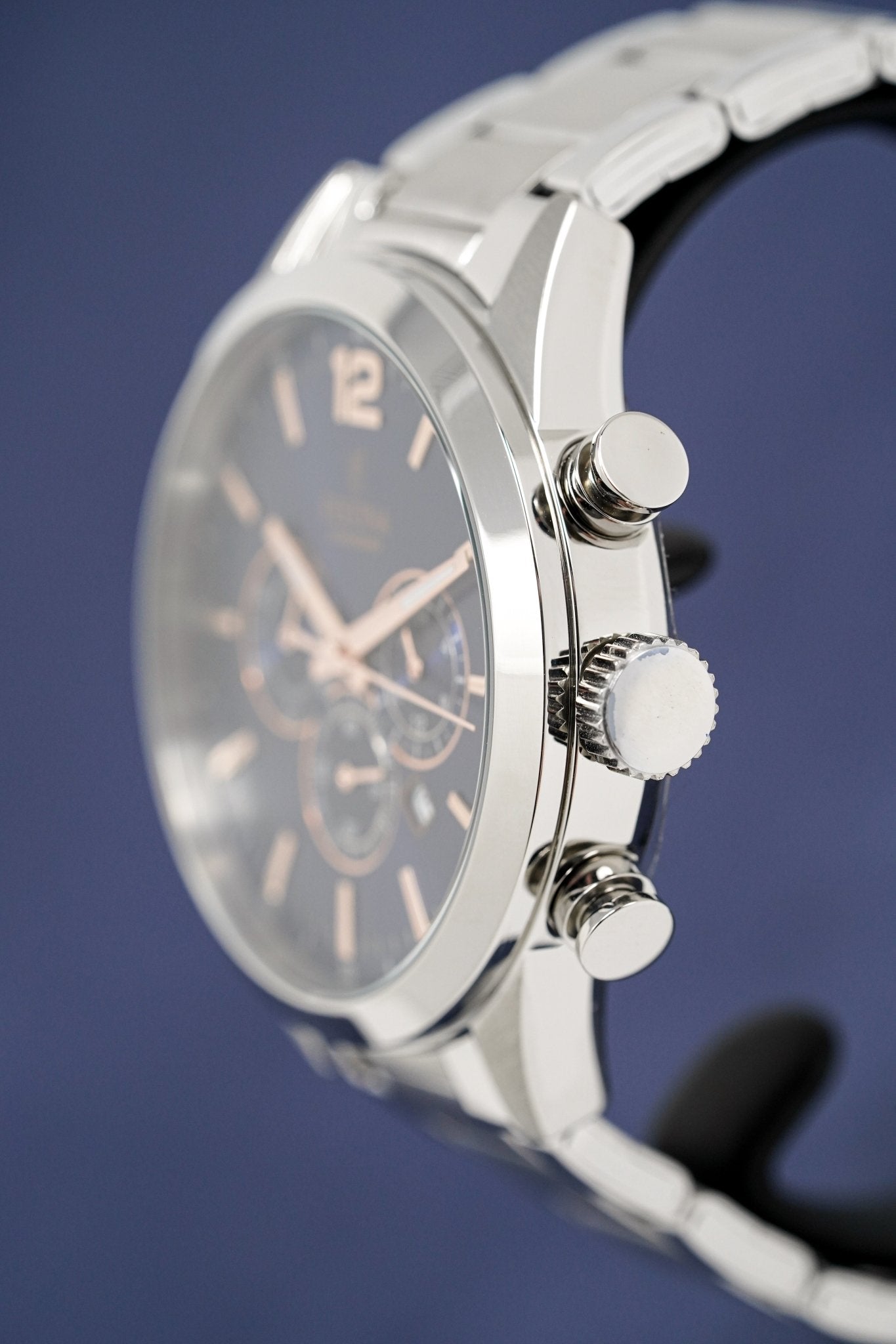 Blue Dial With Logo At 12 O'Clock. Rose Gold Plated Baton Markers and Hands. 3 Sub Dial Timer Function. Date At 4 O'Clock