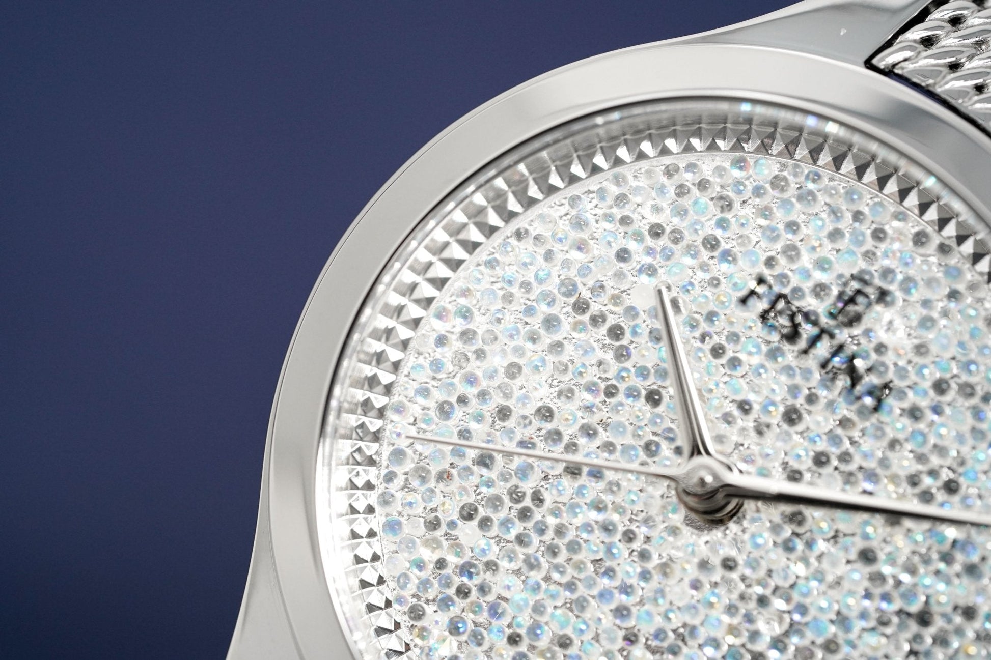 Silver Crystal Dial With Logo At 12 O'Clock. Silver Hour, Minute And Seconds Hands.