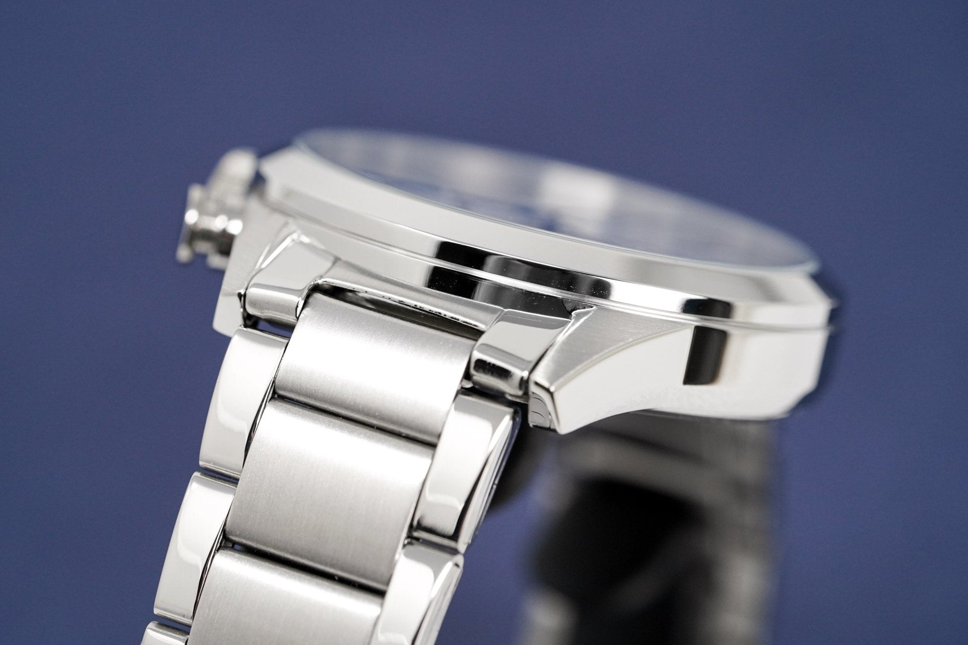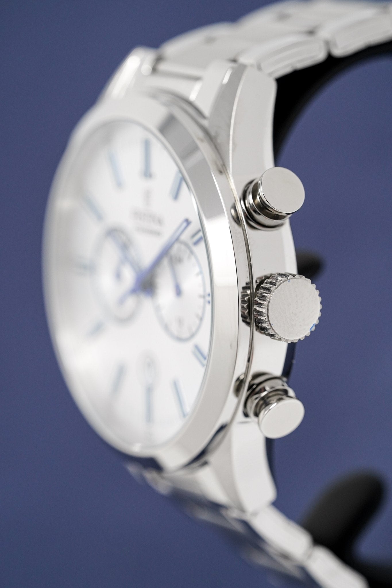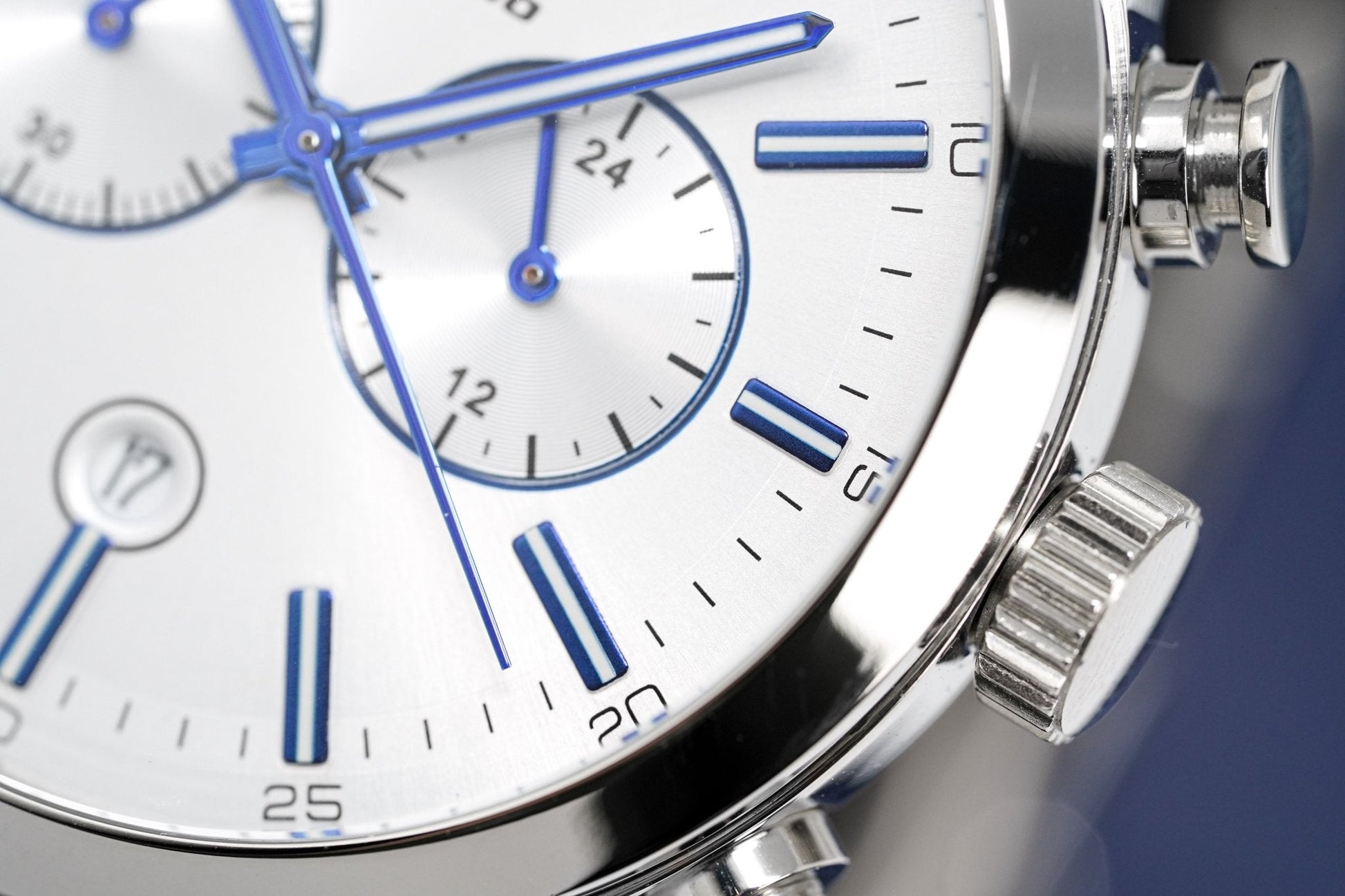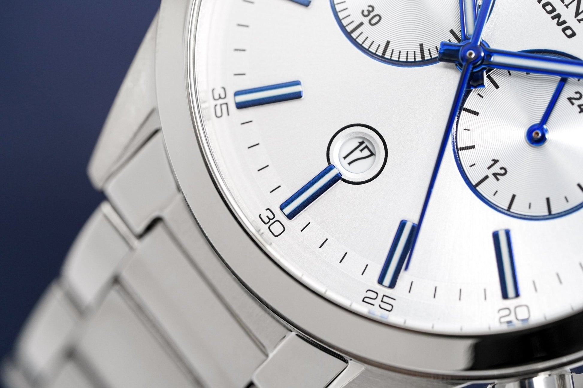 Silver Dial With Logo At 12 O'Clock. Blue Baton Markers and Hands. 2 Sub Dial Timer Function. Date At 6 O'Clock