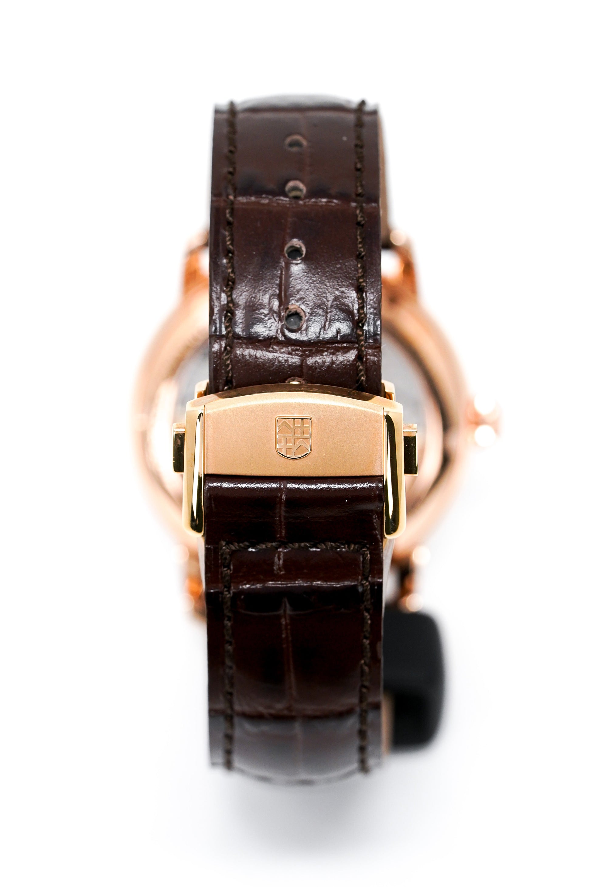 Brown Calfskin Leather Strap with Rose Gold Plated Stainless Steel Deployment Buckle.