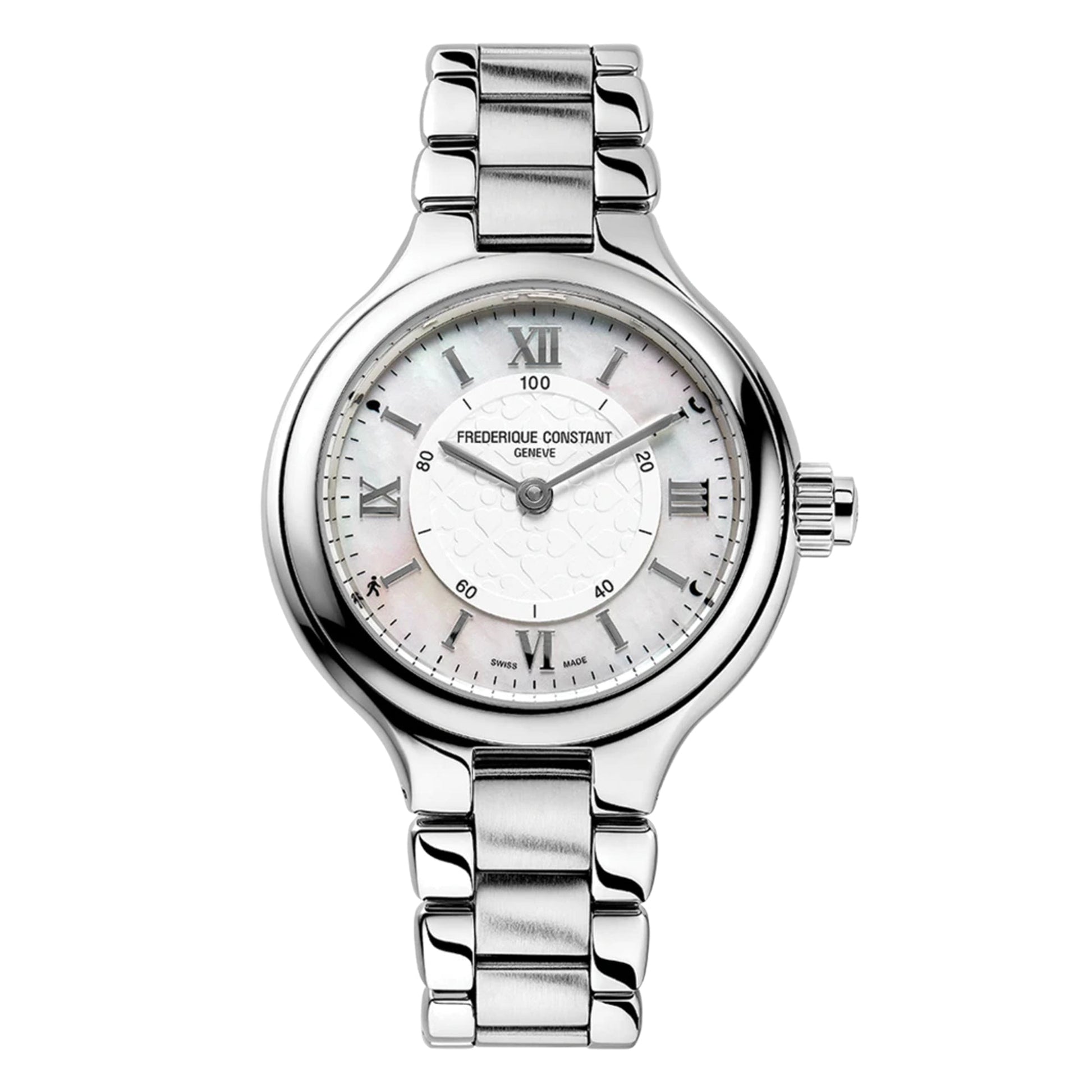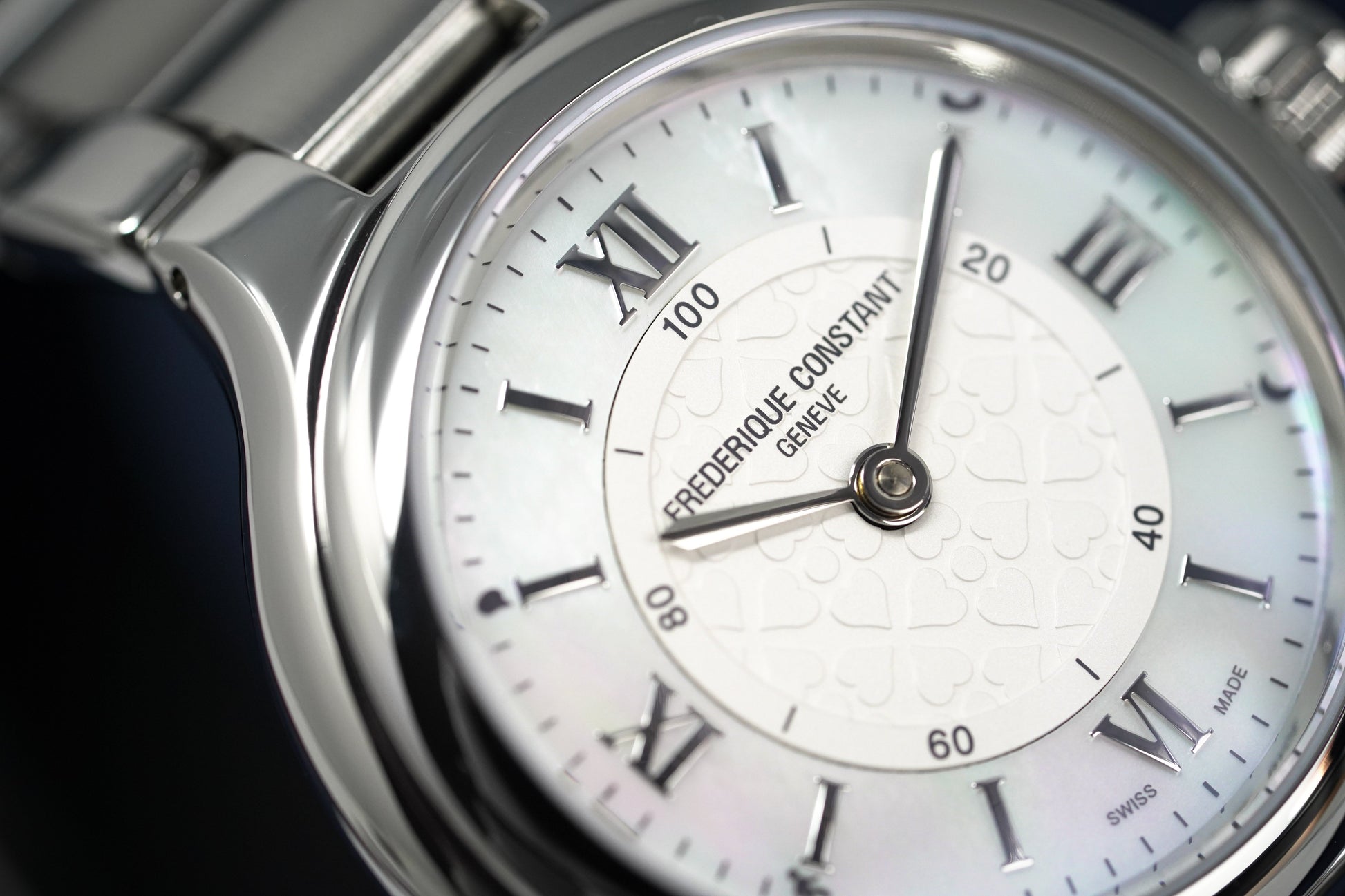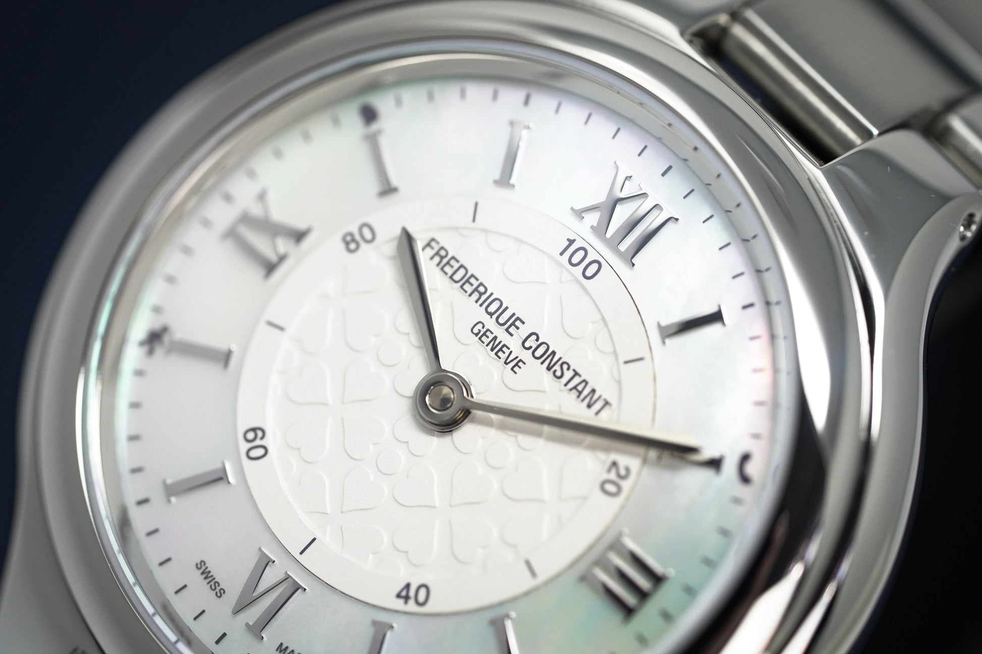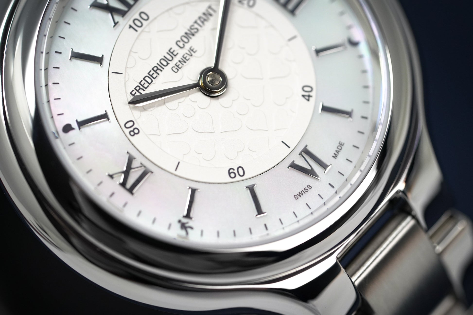 White Heart Motif Central Dial - Mother of Pearl Outer Ring with Silver Roman Numeral Hour Indexes - Stainless Steel Steel Hour and Minute Hands.