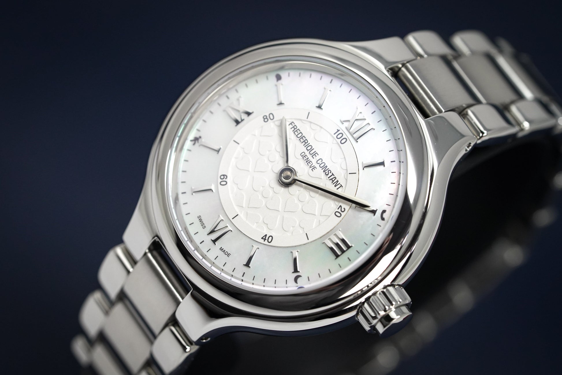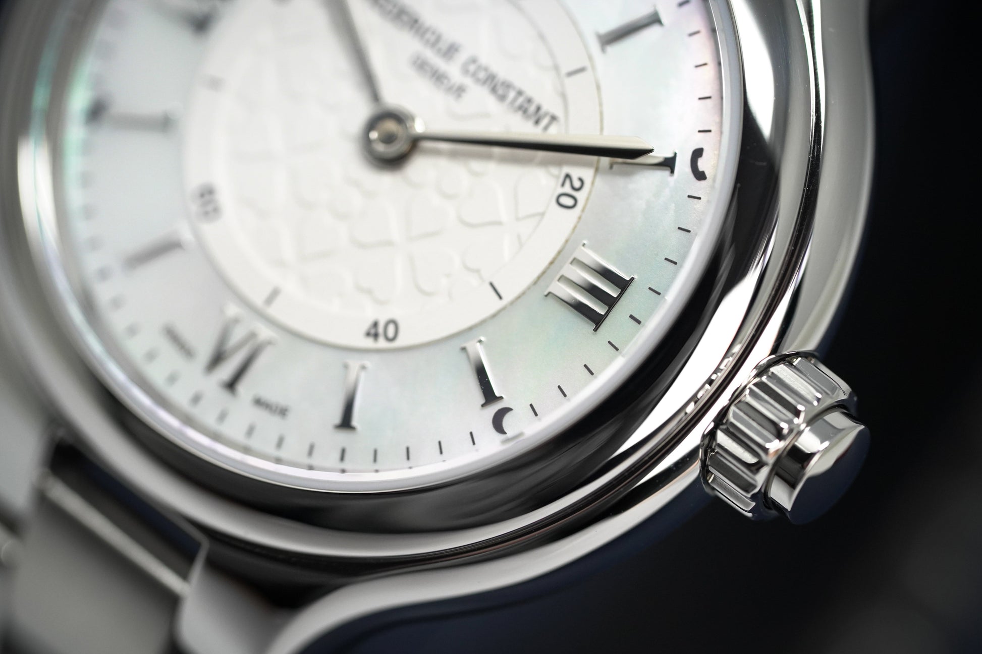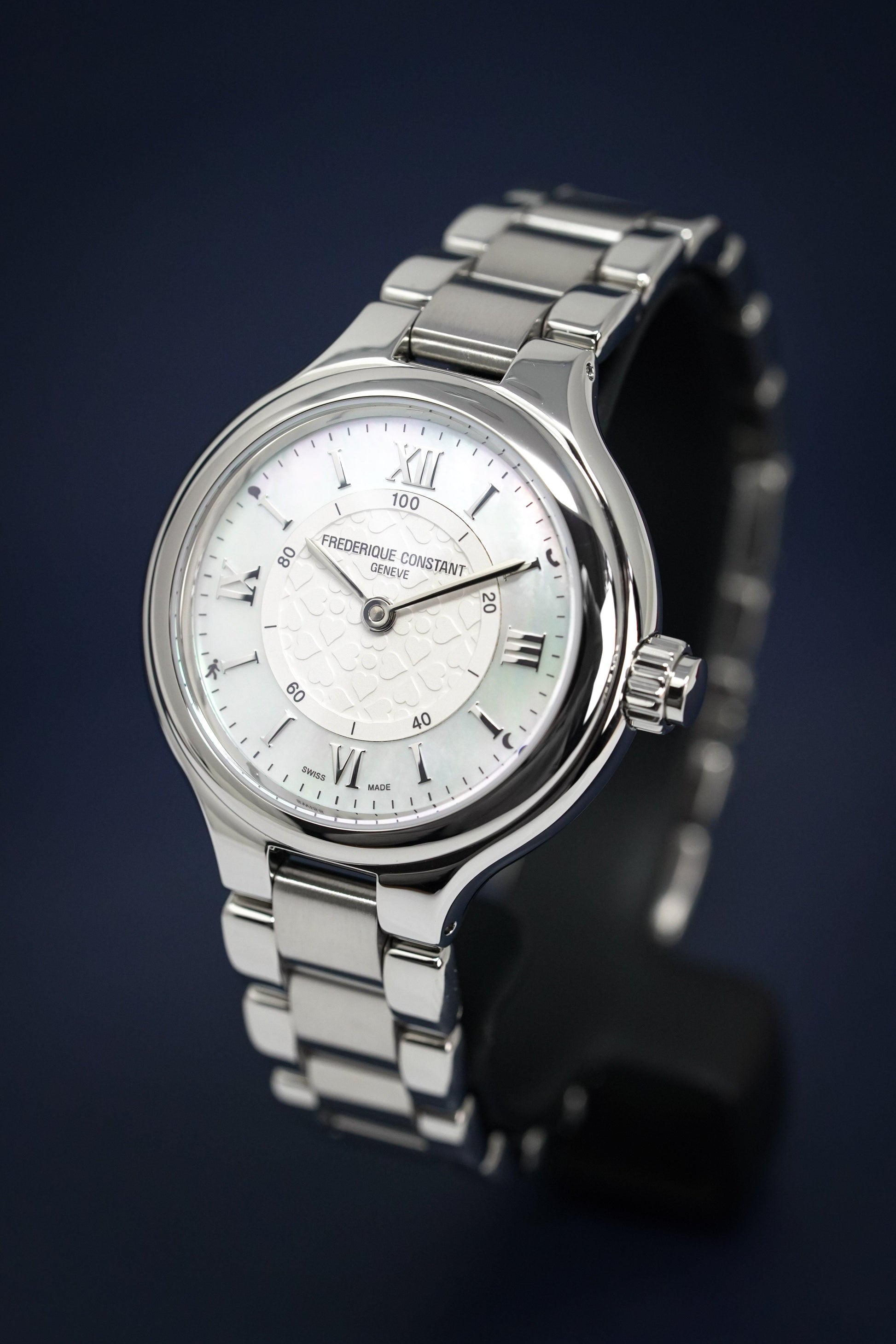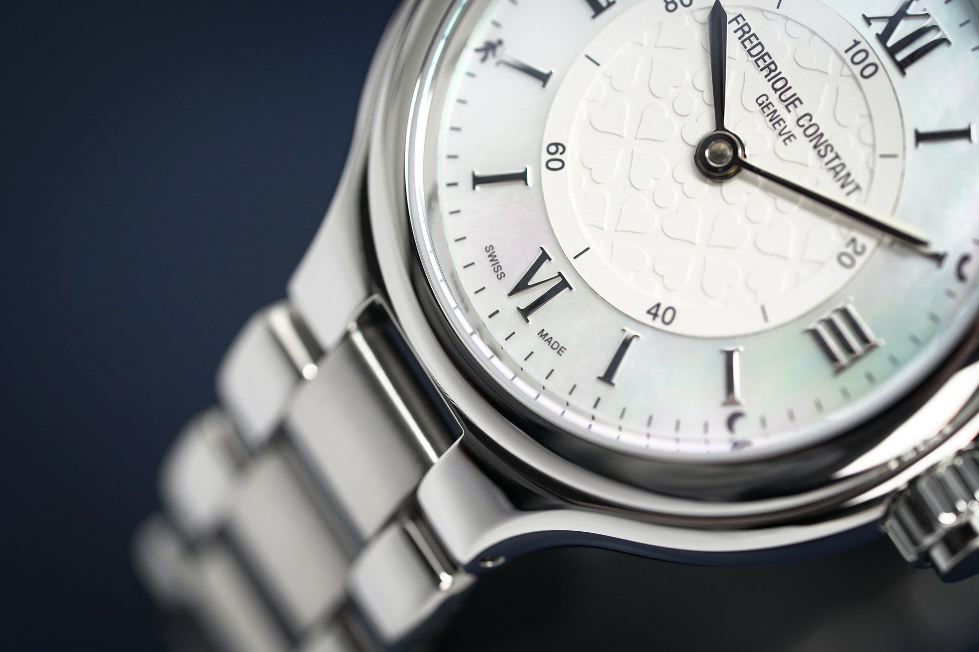 White Heart Motif Central Dial - Mother of Pearl Outer Ring with Silver Roman Numeral Hour Indexes - Stainless Steel Steel Hour and Minute Hands.