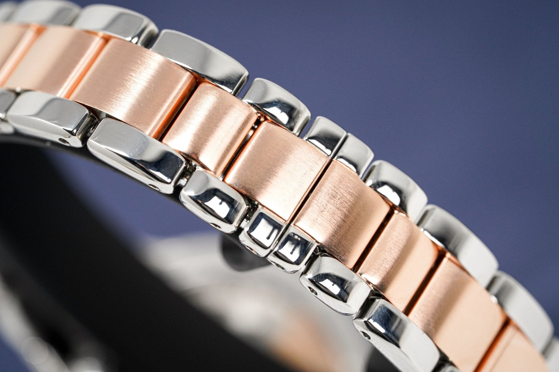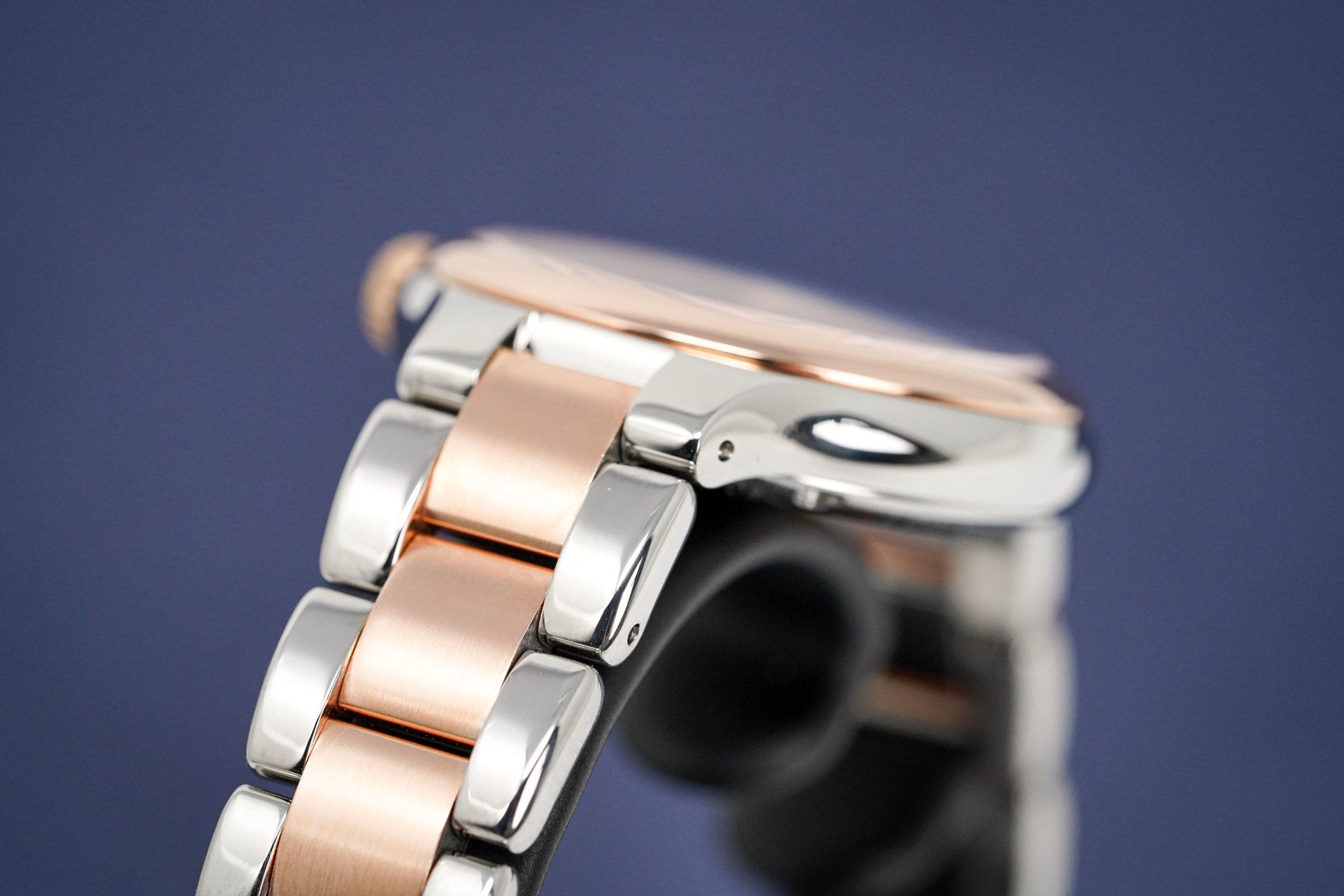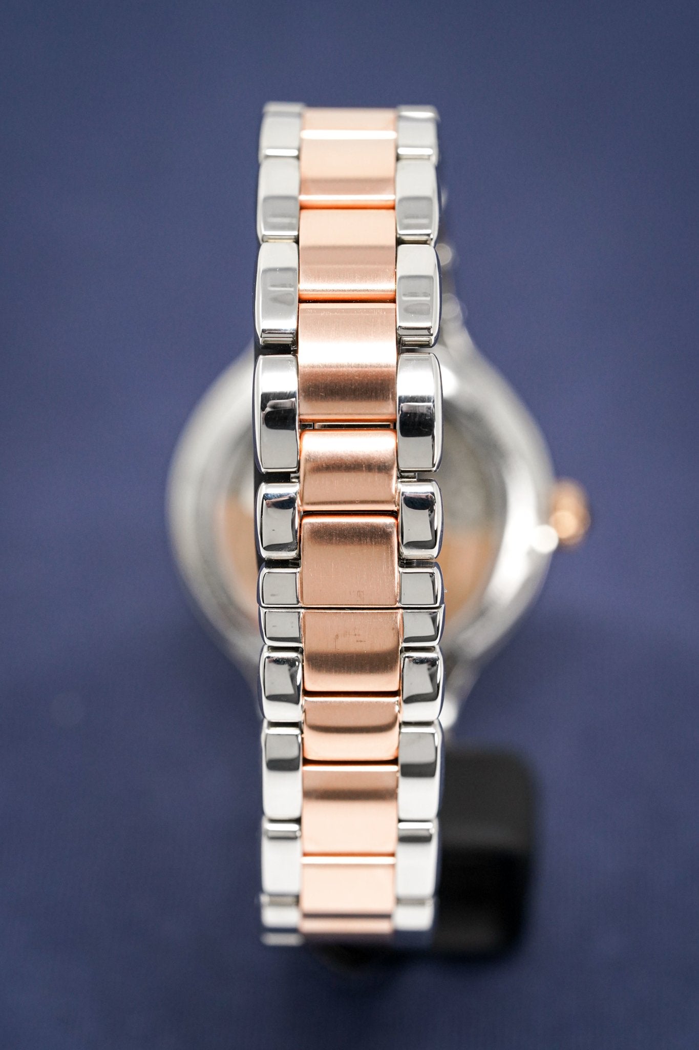 Mother of Pearl Dial. 8 Applied Diamond Indexes and 3 Silver Roman Numeral Indexes. Rose Gold Plated Steel Hands. Date Window at 6.