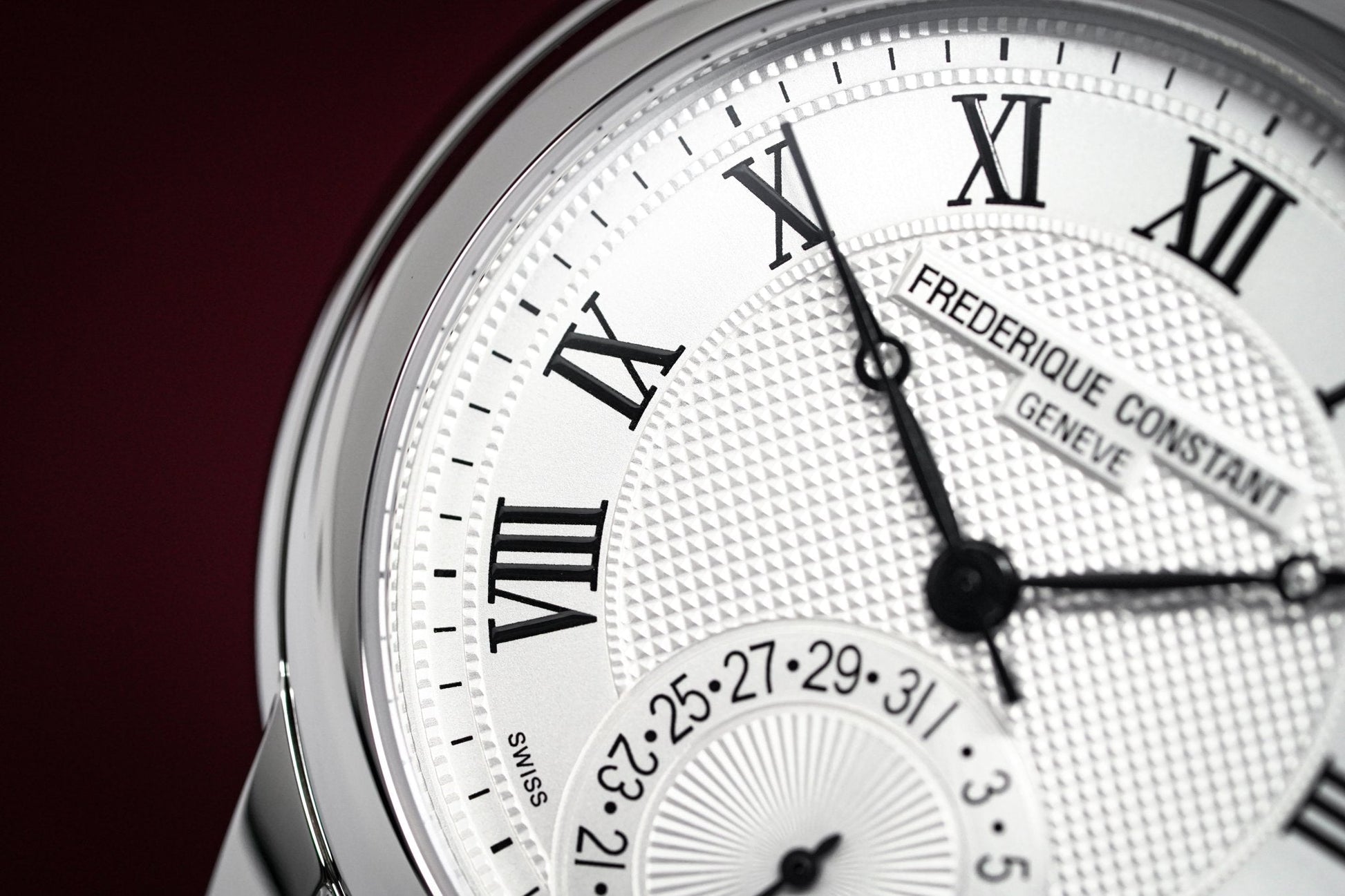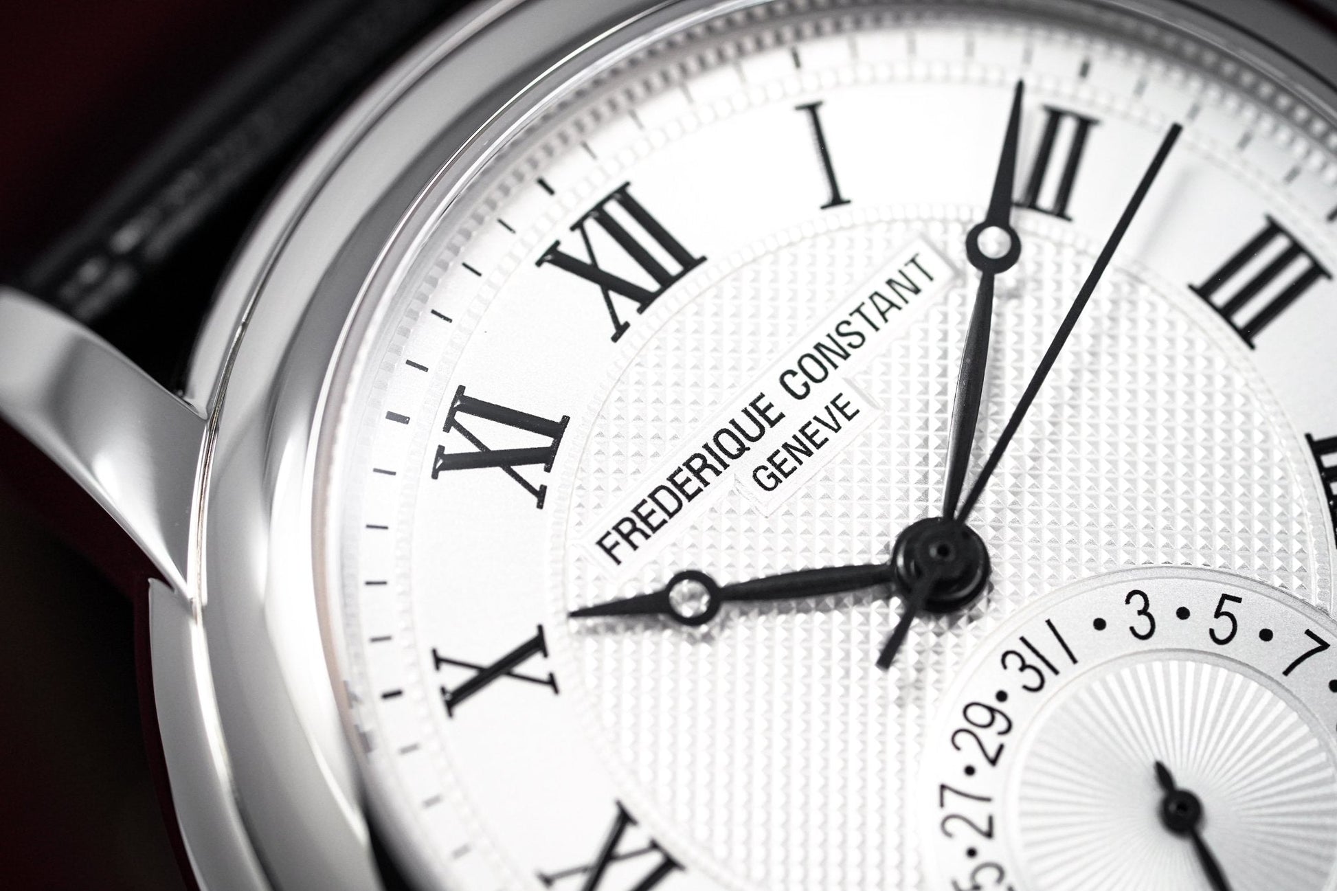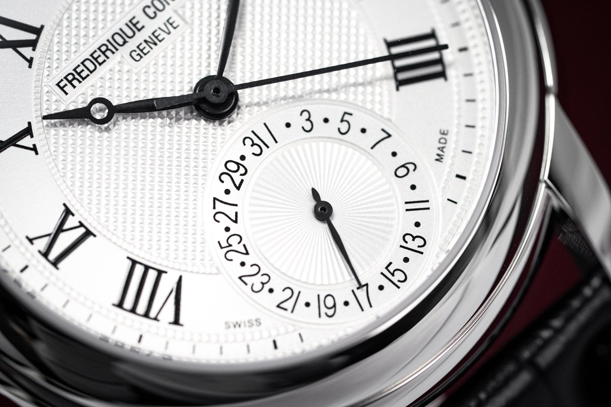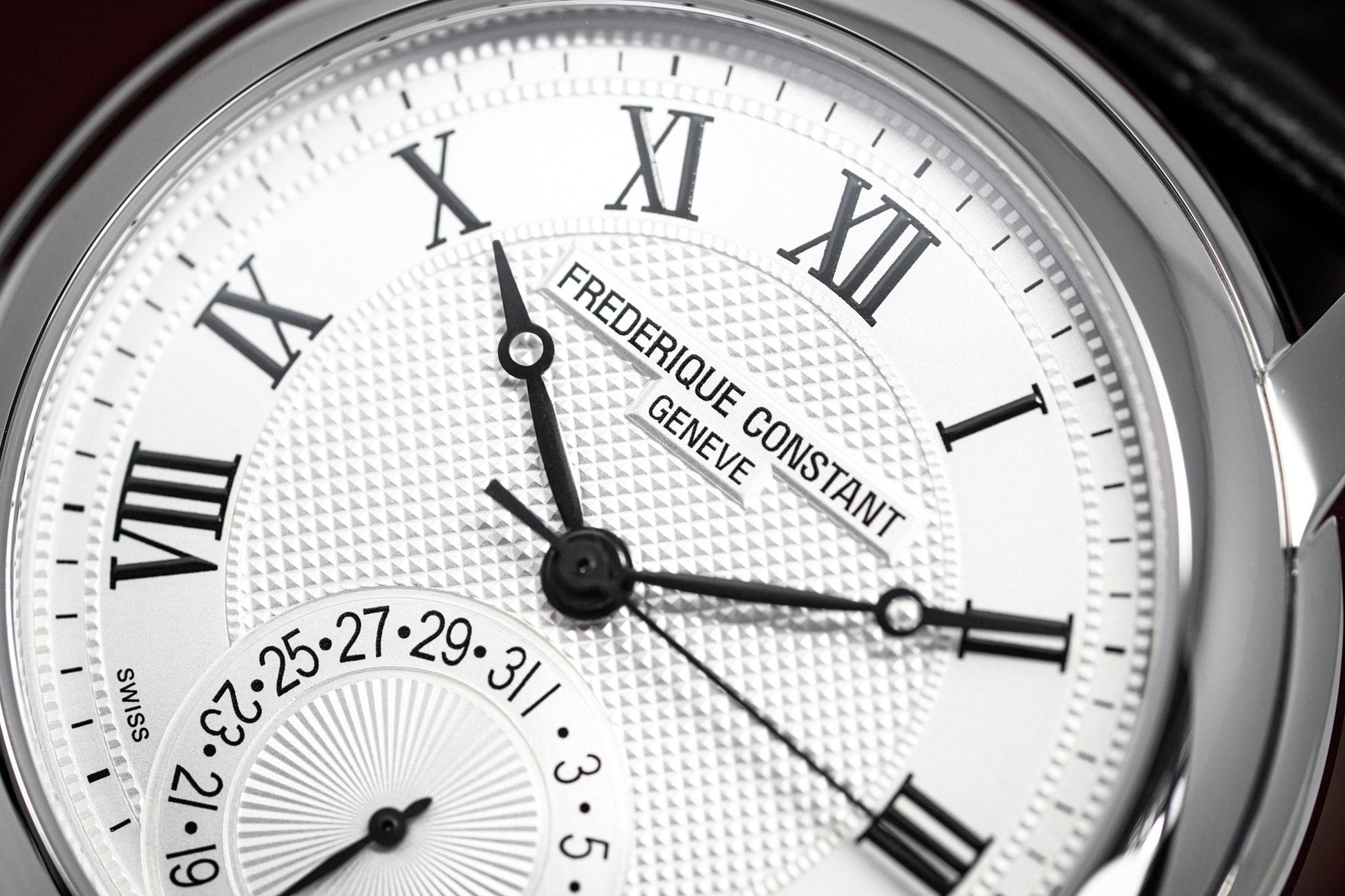 Silver Guillochè Dial. Printed Roman Numeral Indexes. Black Stainless Steel Hands.