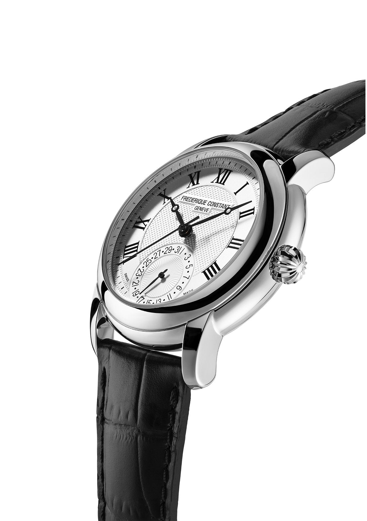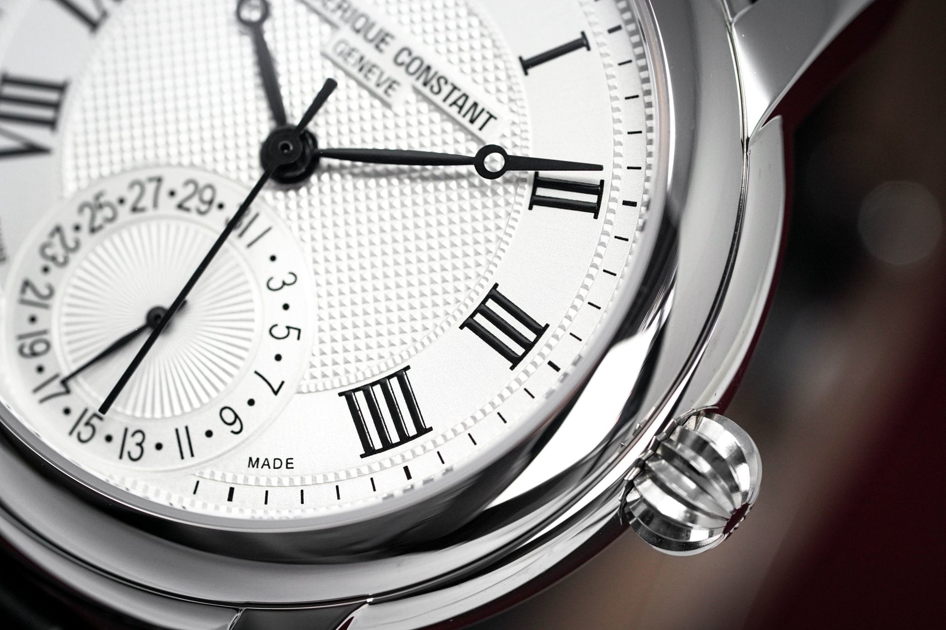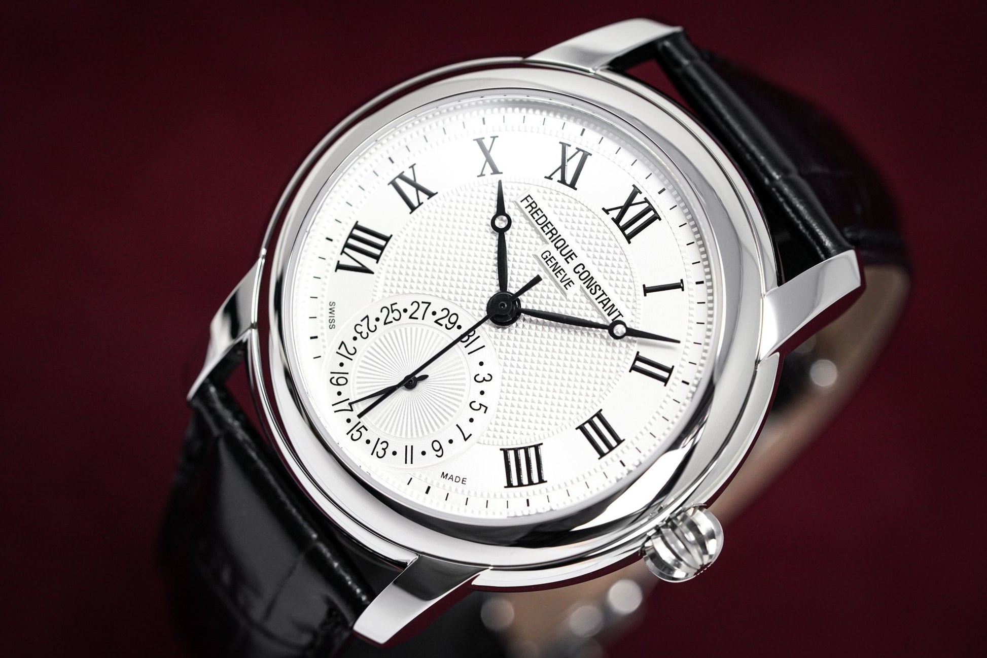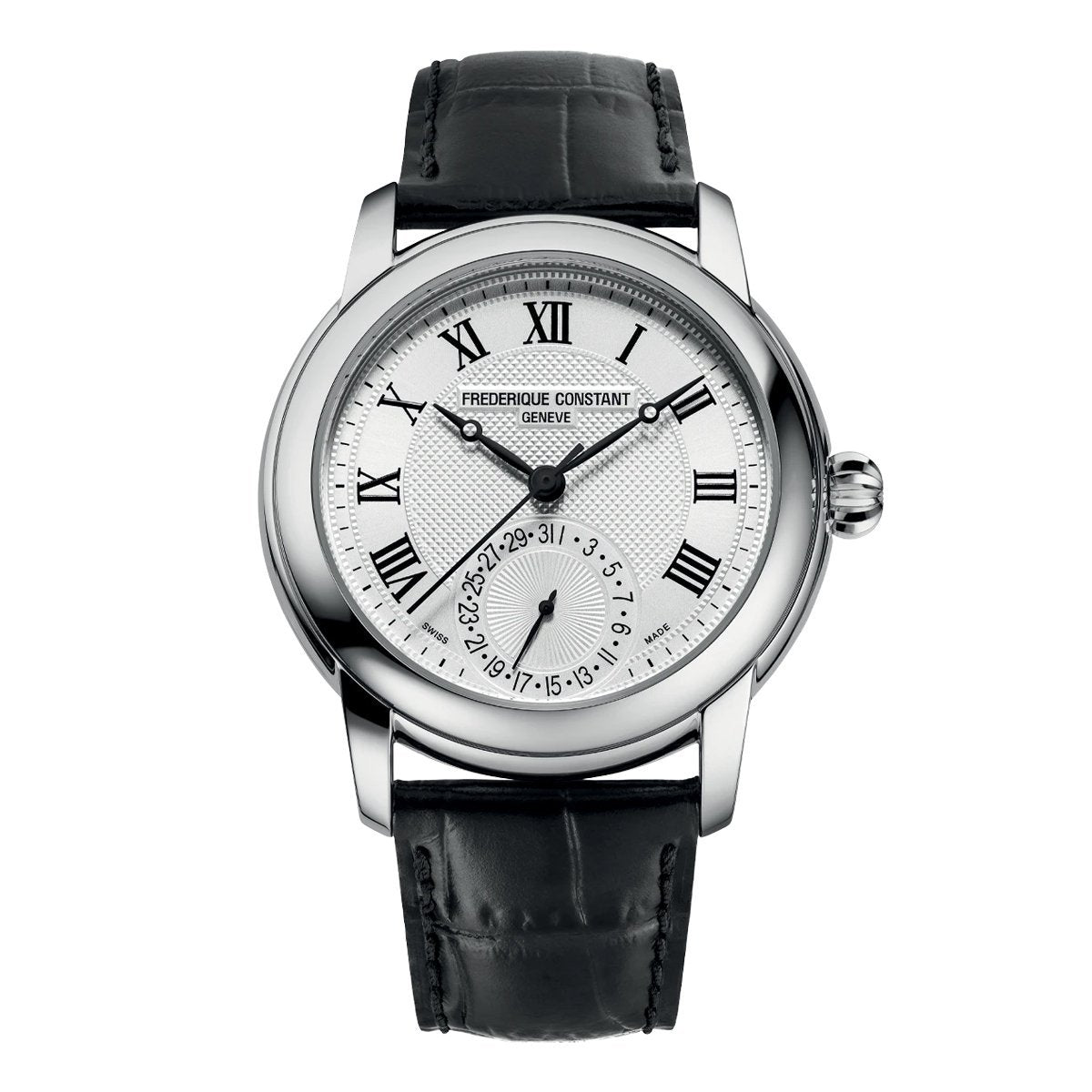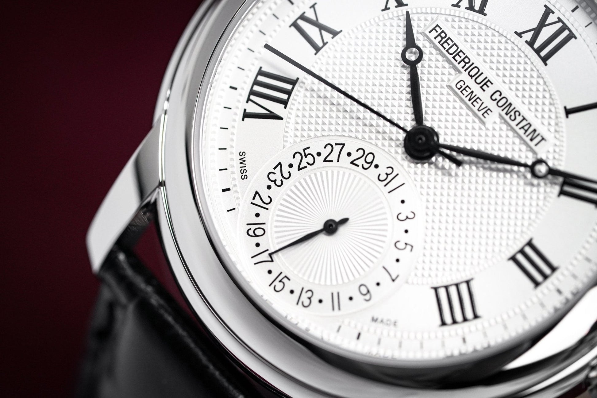 Silver Guillochè Dial. Printed Roman Numeral Indexes. Black Stainless Steel Hands.