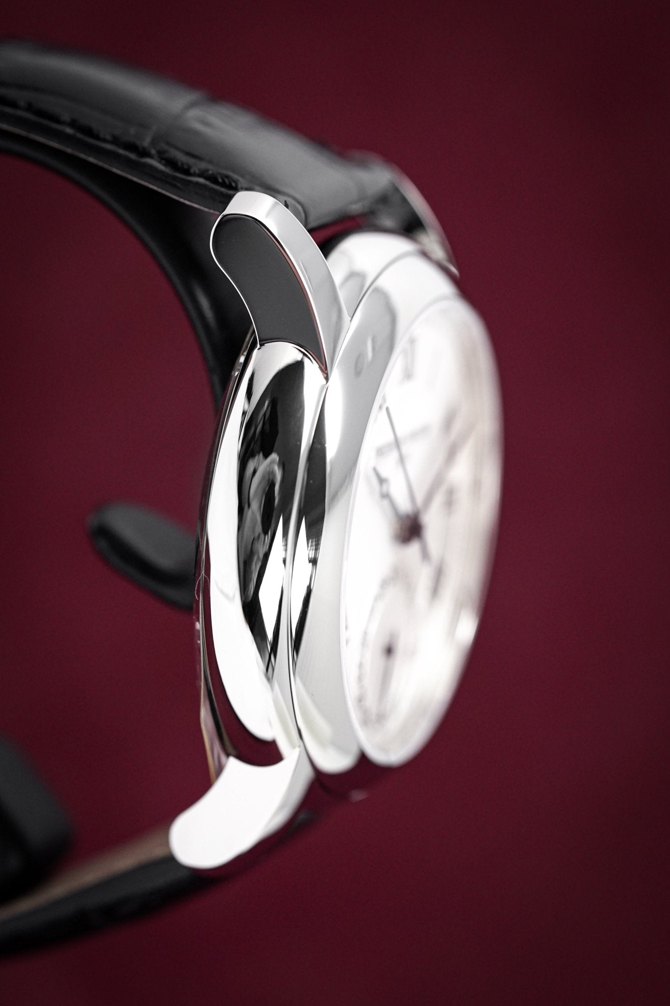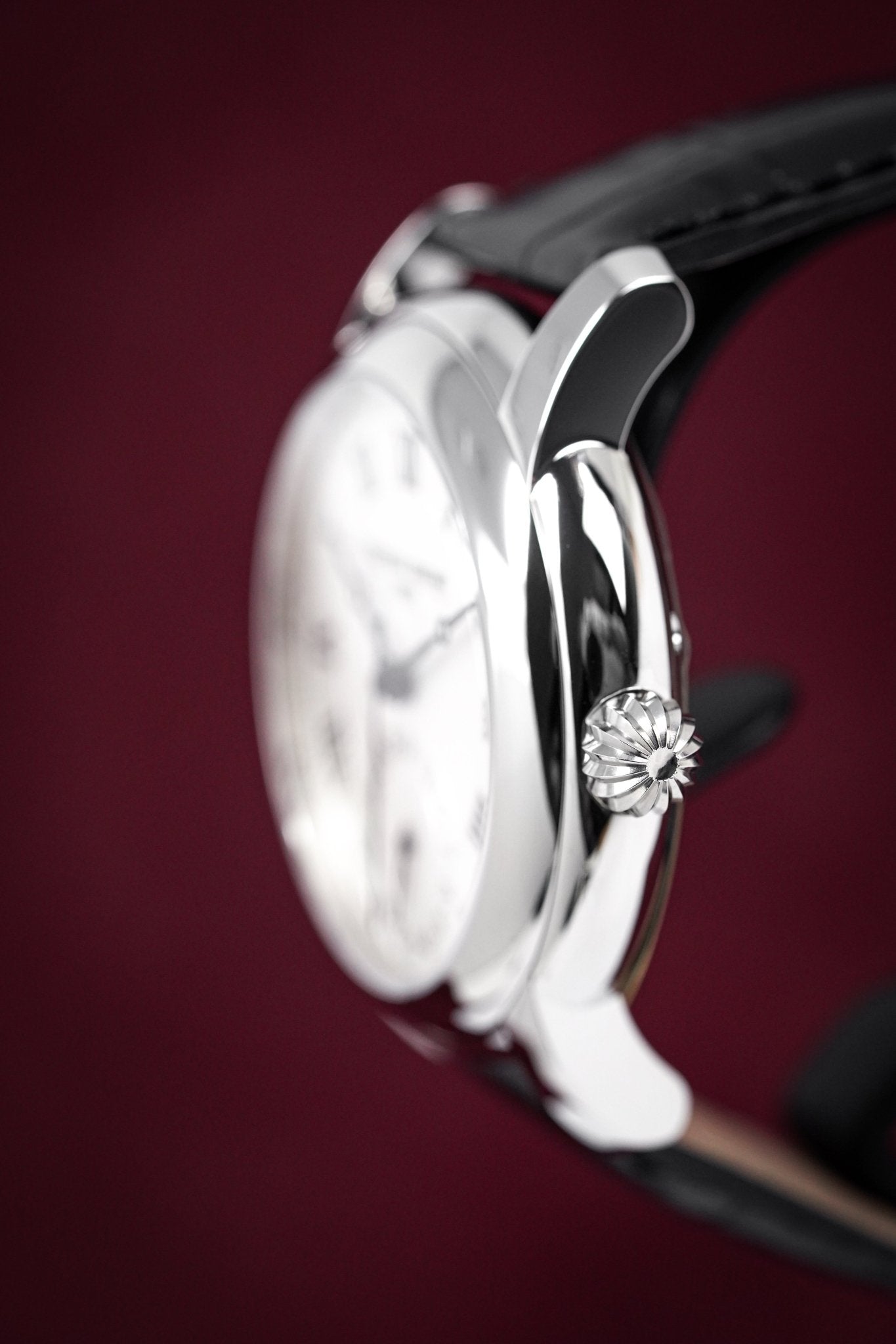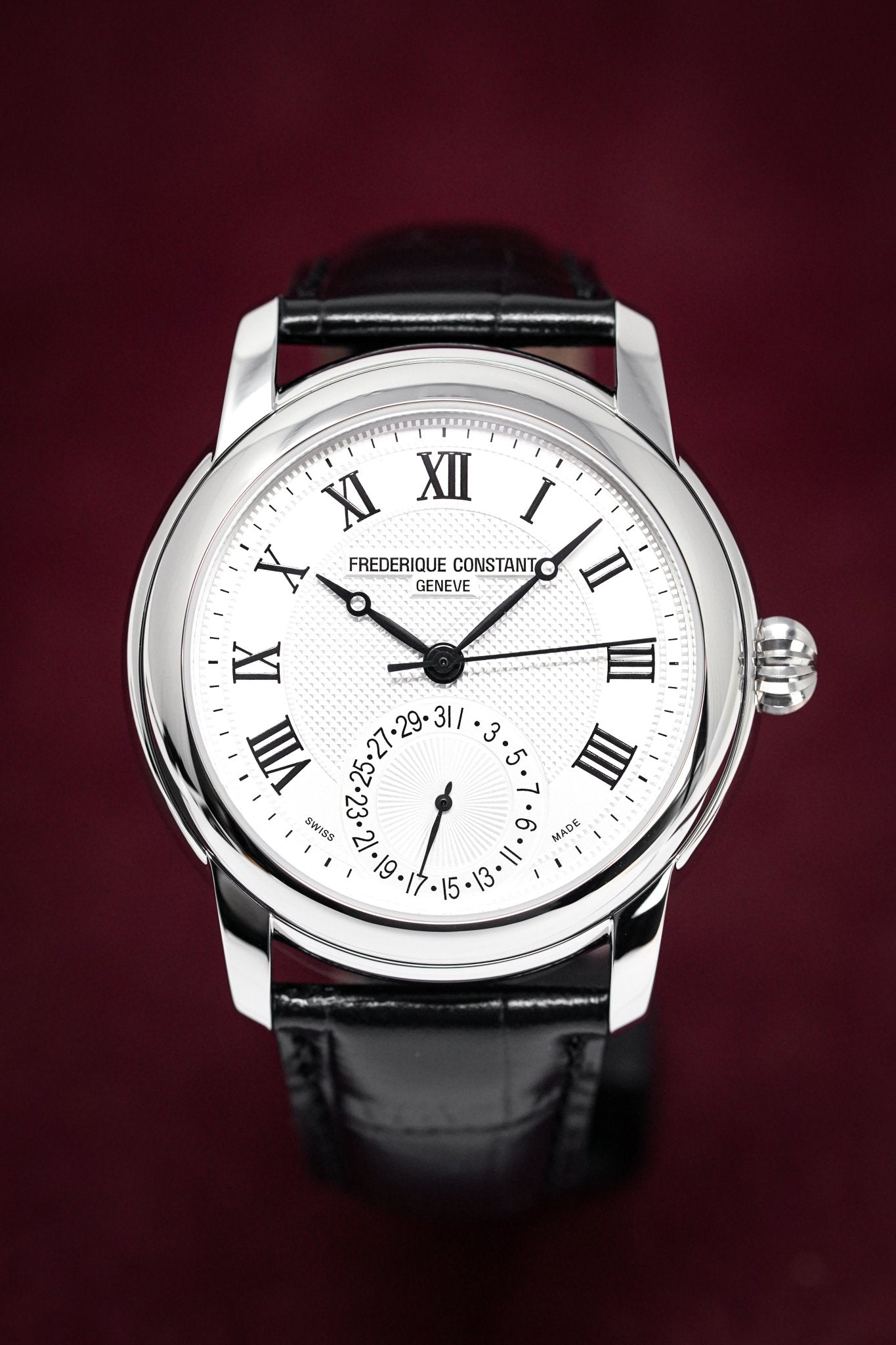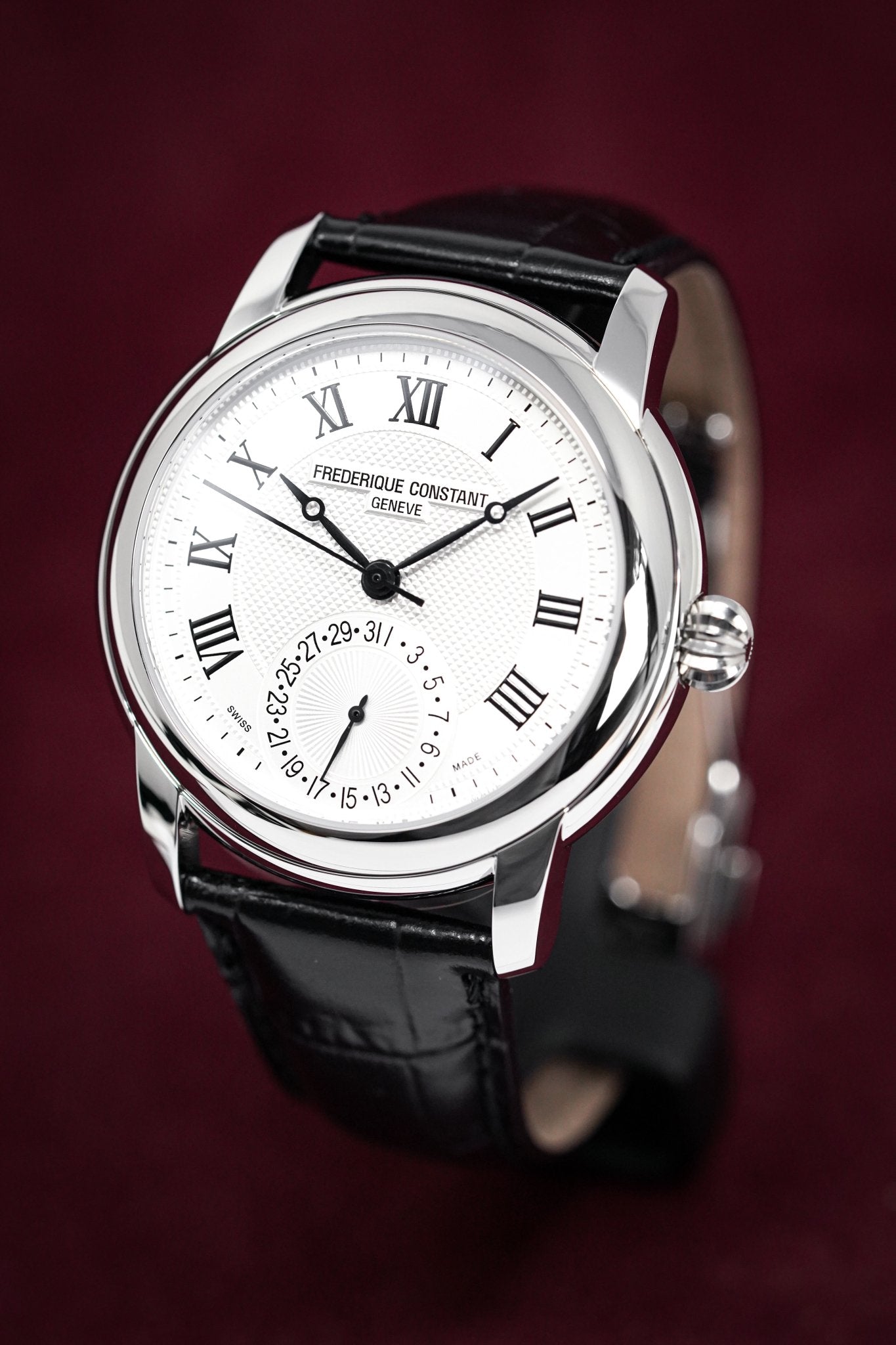 Silver Guillochè Dial. Printed Roman Numeral Indexes. Black Stainless Steel Hands.