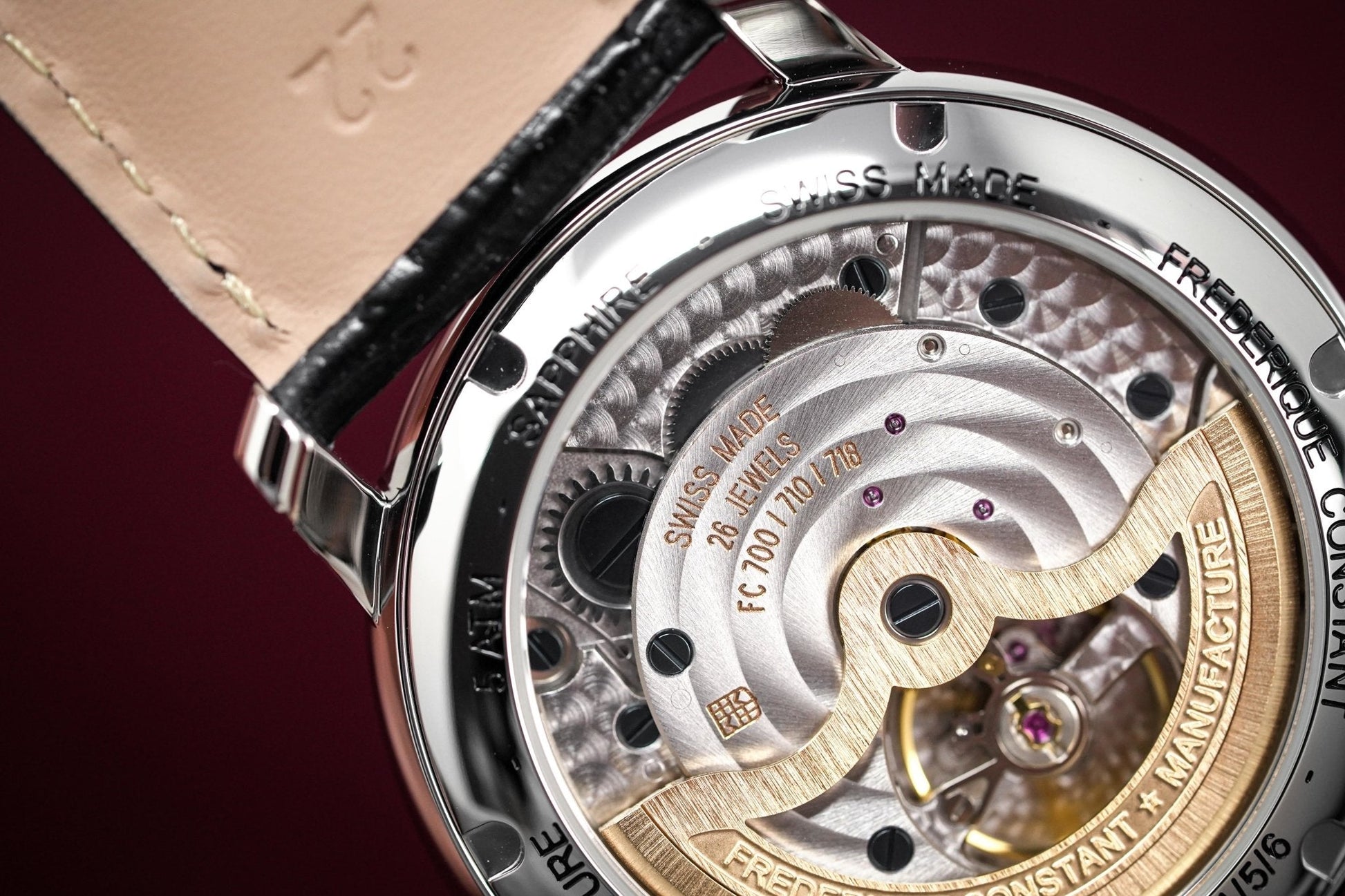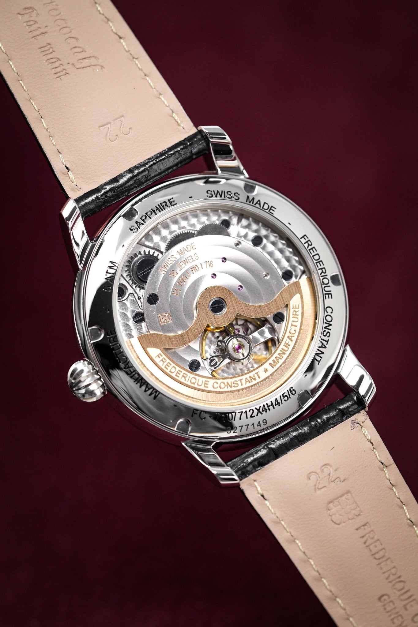 Swiss Made In House Automatic Movement. Caliber FC-710. Power Reserve of 38 Hours. 26 Jewels. 28,800bph. Date Pointer. Côtes de Geneve finishing.