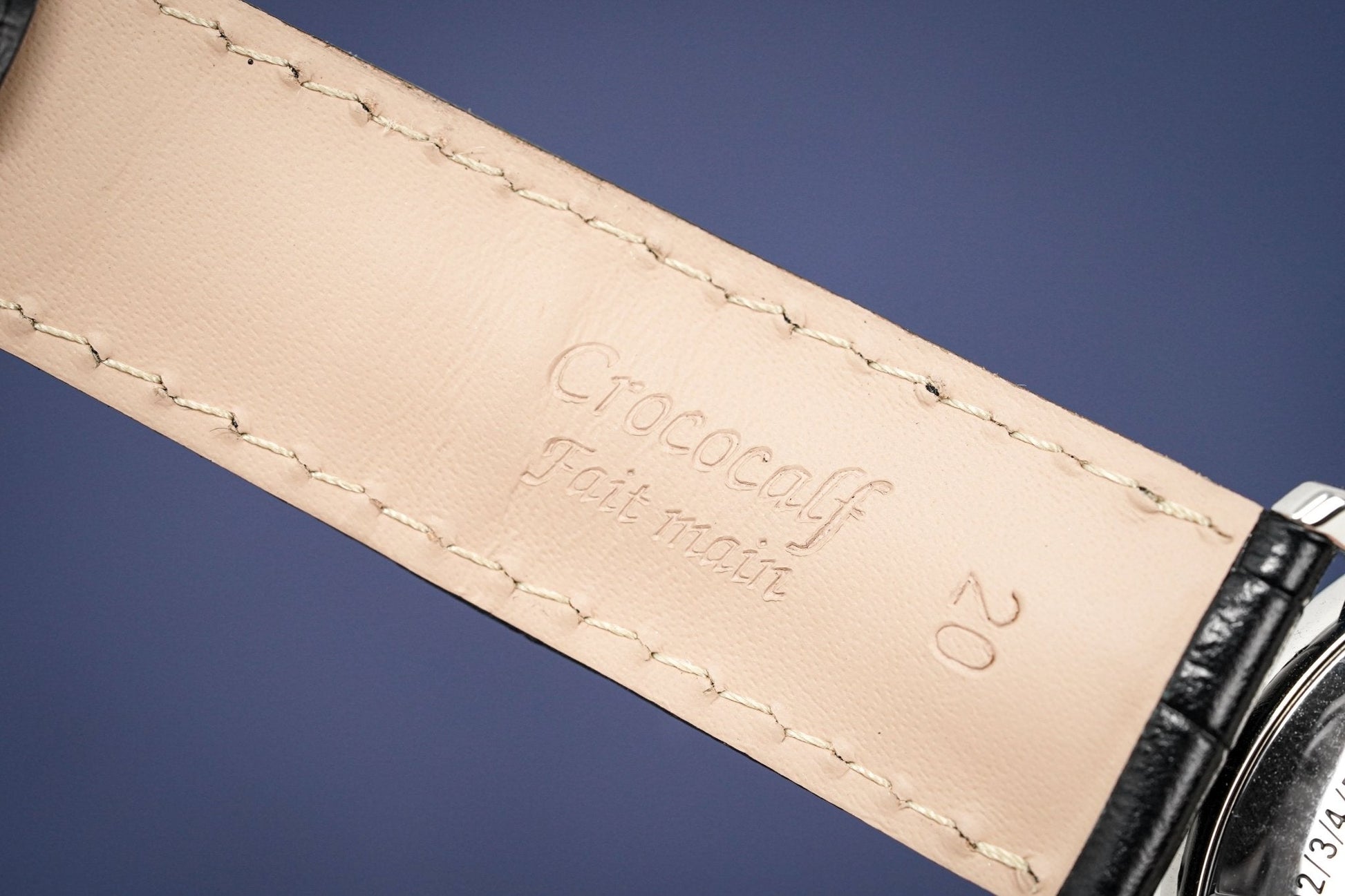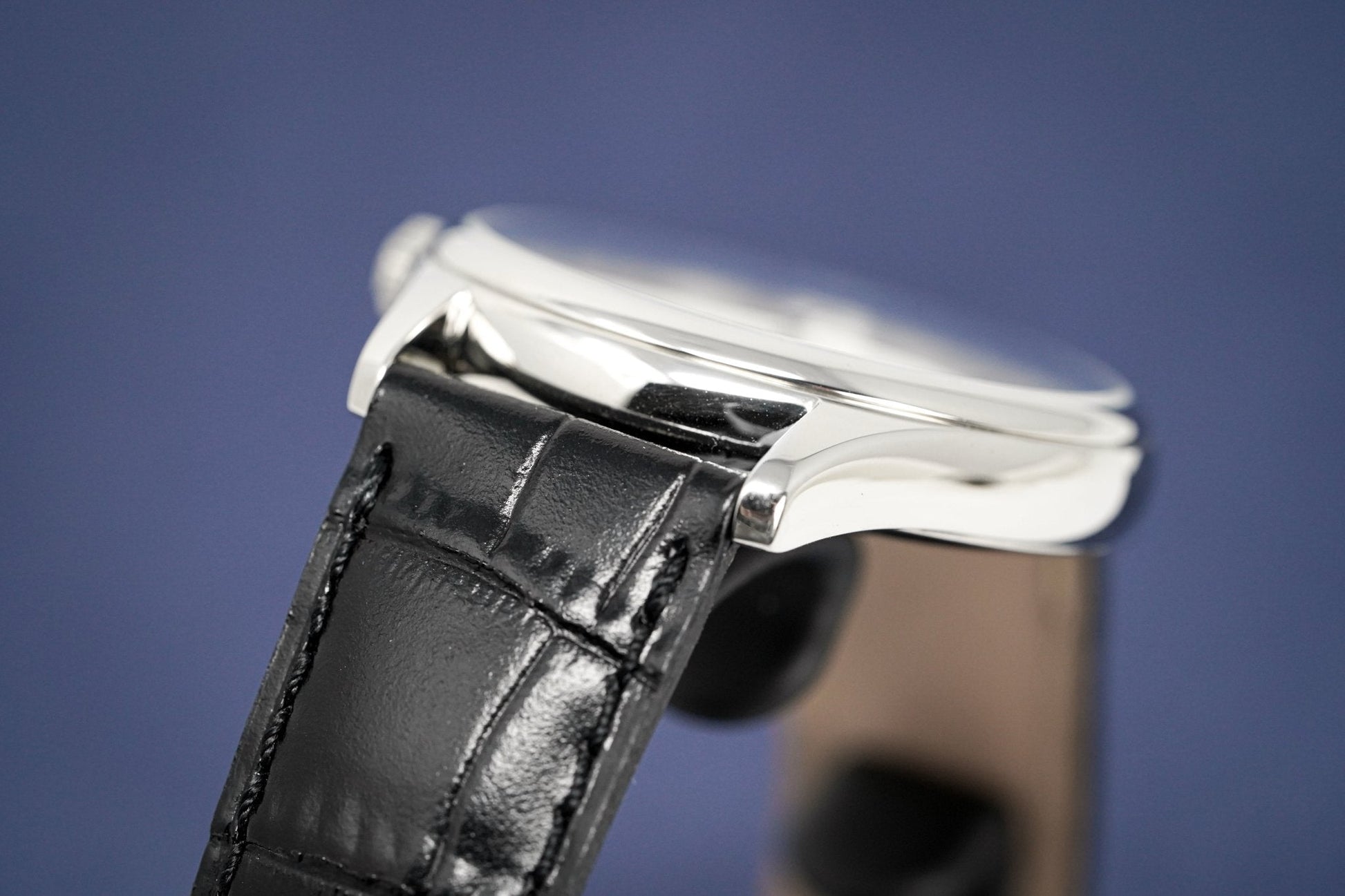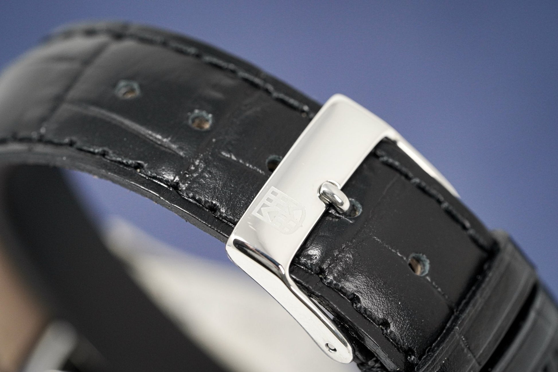 Black Calfskin Leather Strap with Stainless Steel Folding Buckle.