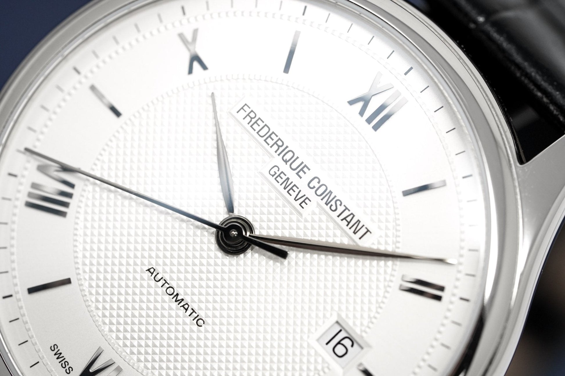 Silver Guillochè Dial. Applied Stainless Steel Roman Numeral Indexes & Hands. Date Window at 3.