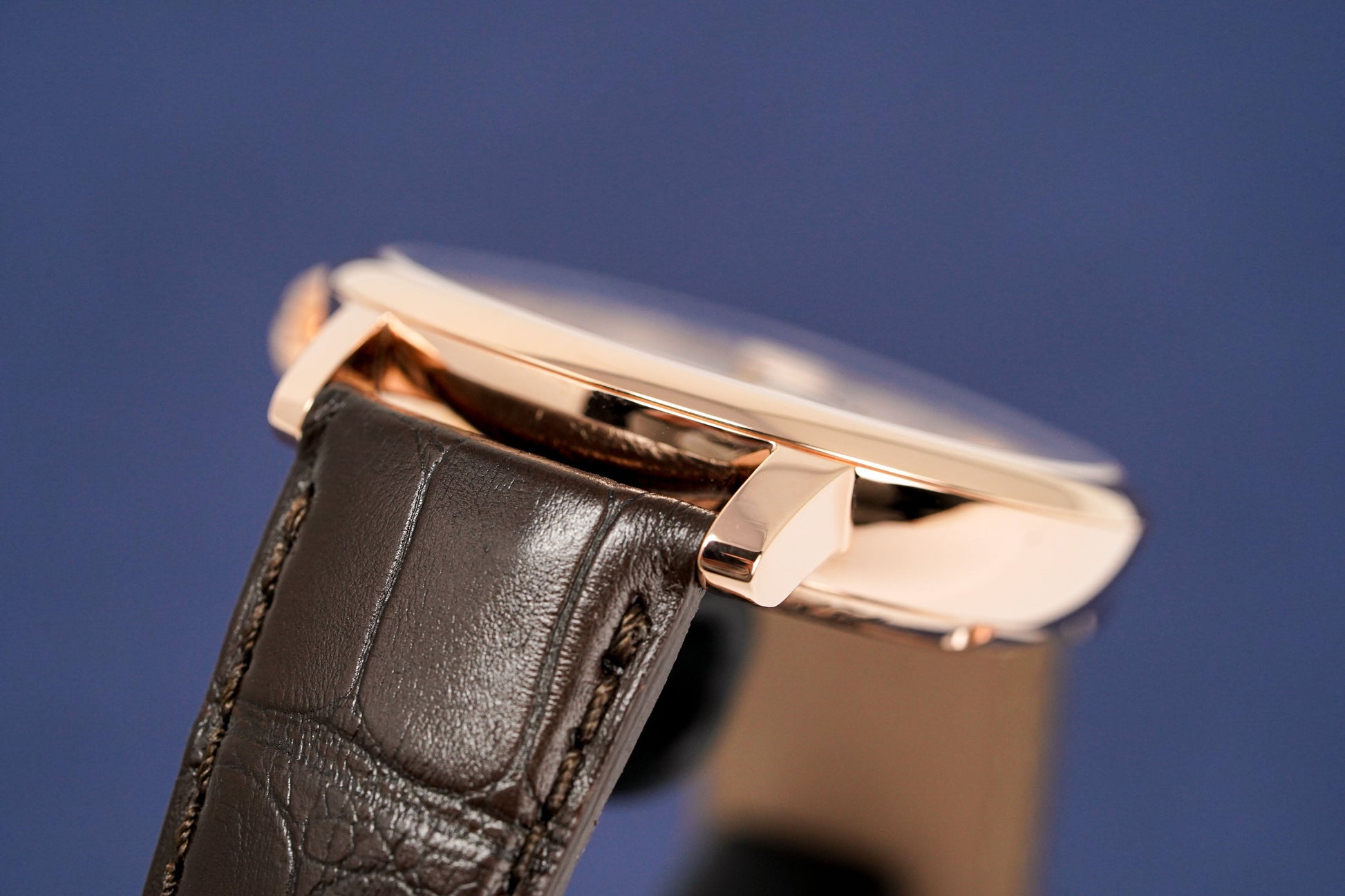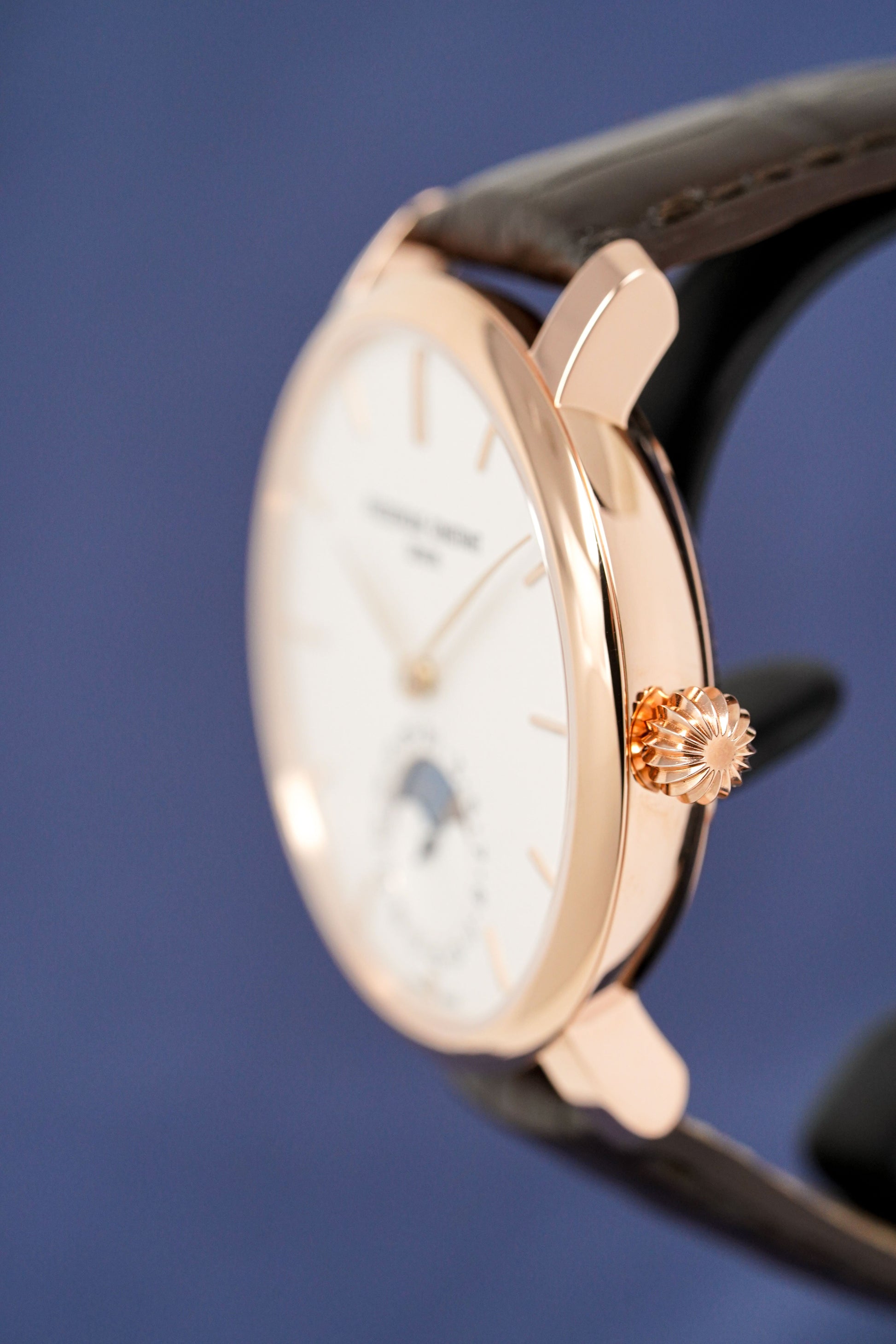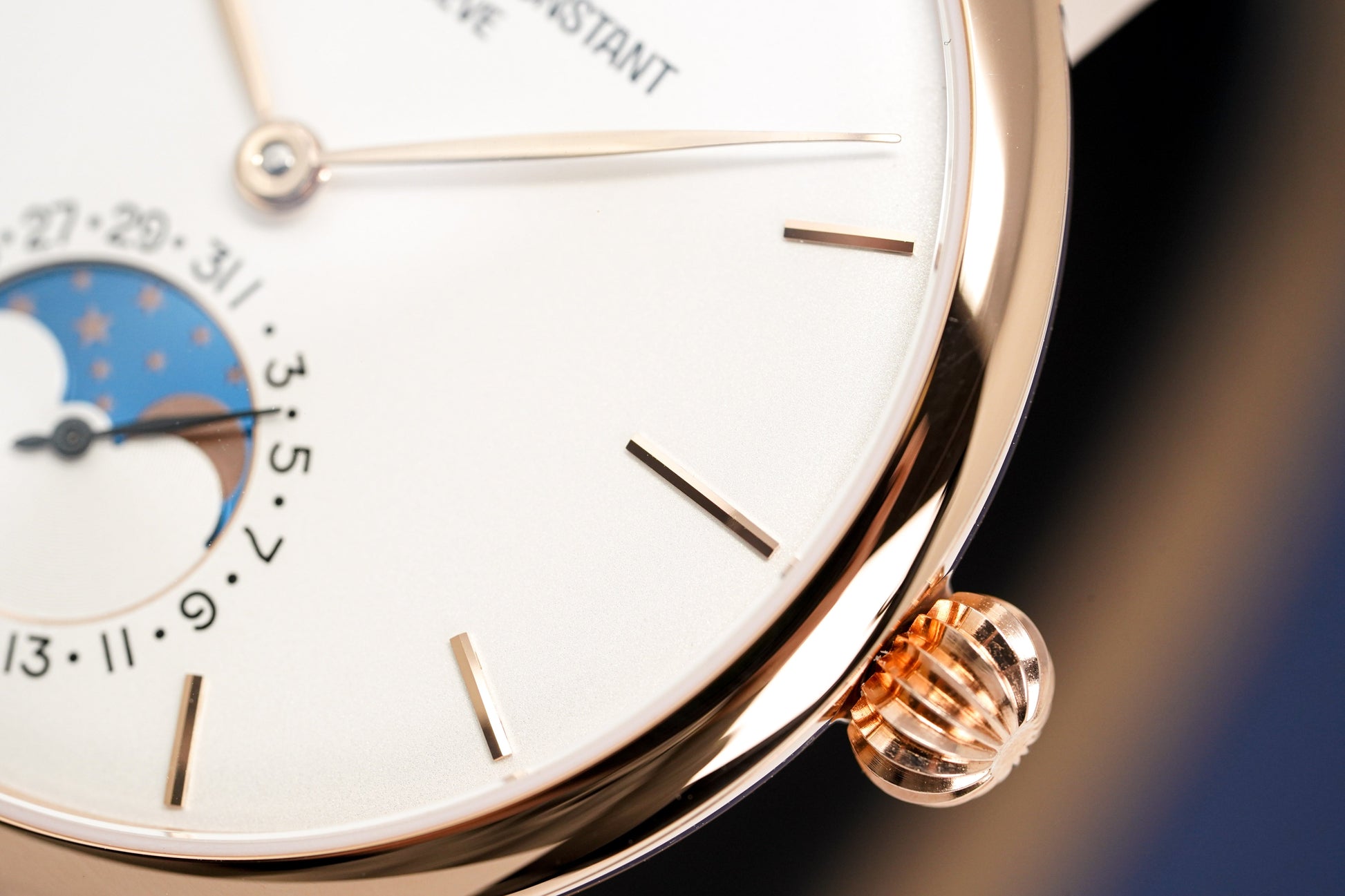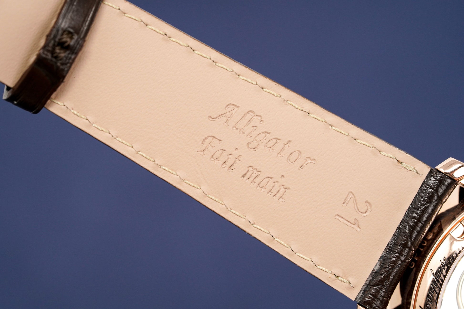Silver Dial. Rose Gold Plated Stainless Steel Stick Indexes. Rose Gold Plated Stainless Steel Hands. Moonphase at 6 O'Clock with Pointer Date Indicator.