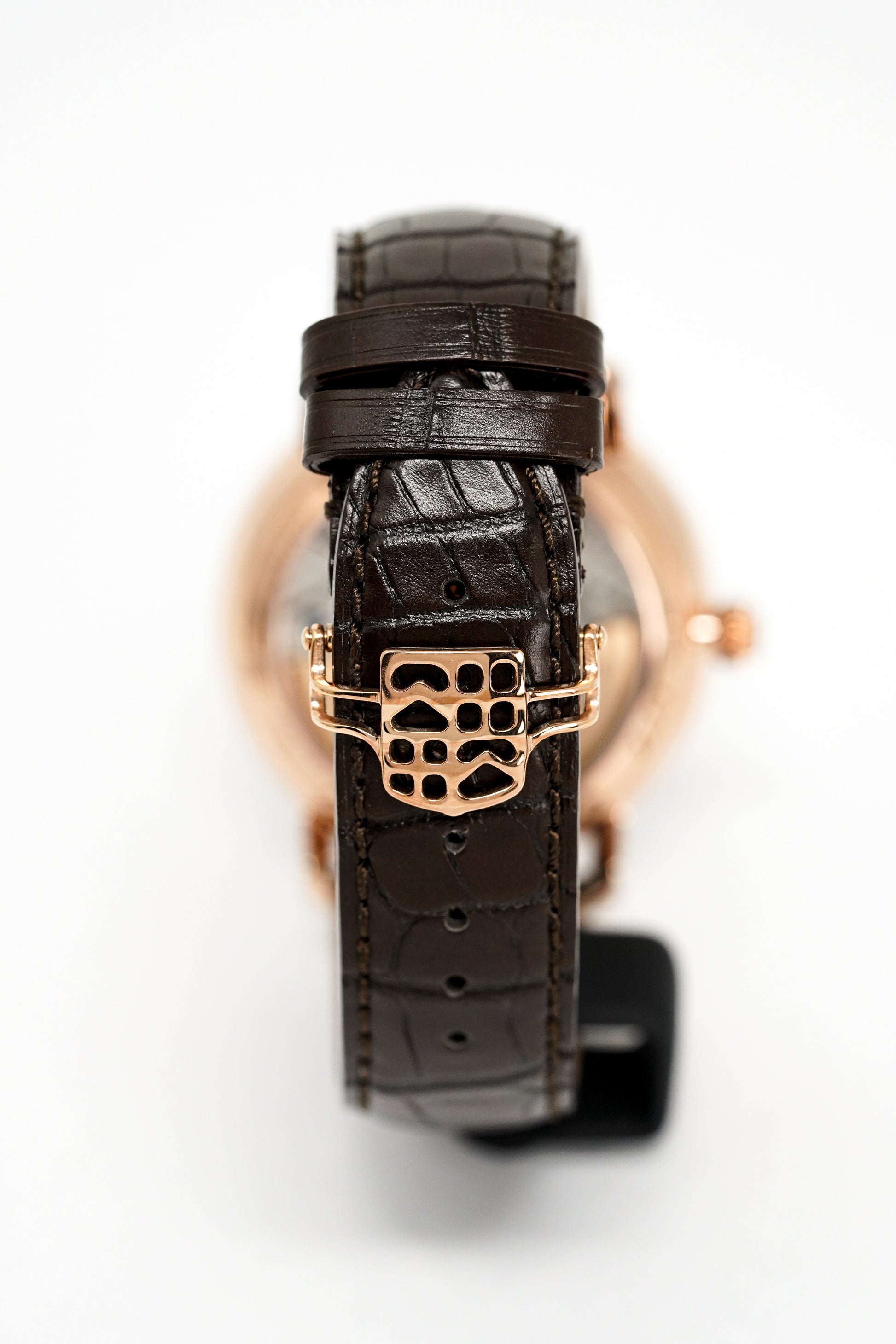 42mm x 11mm Rose Gold Plated 316L Stainless Steel Case. Open Caseback.