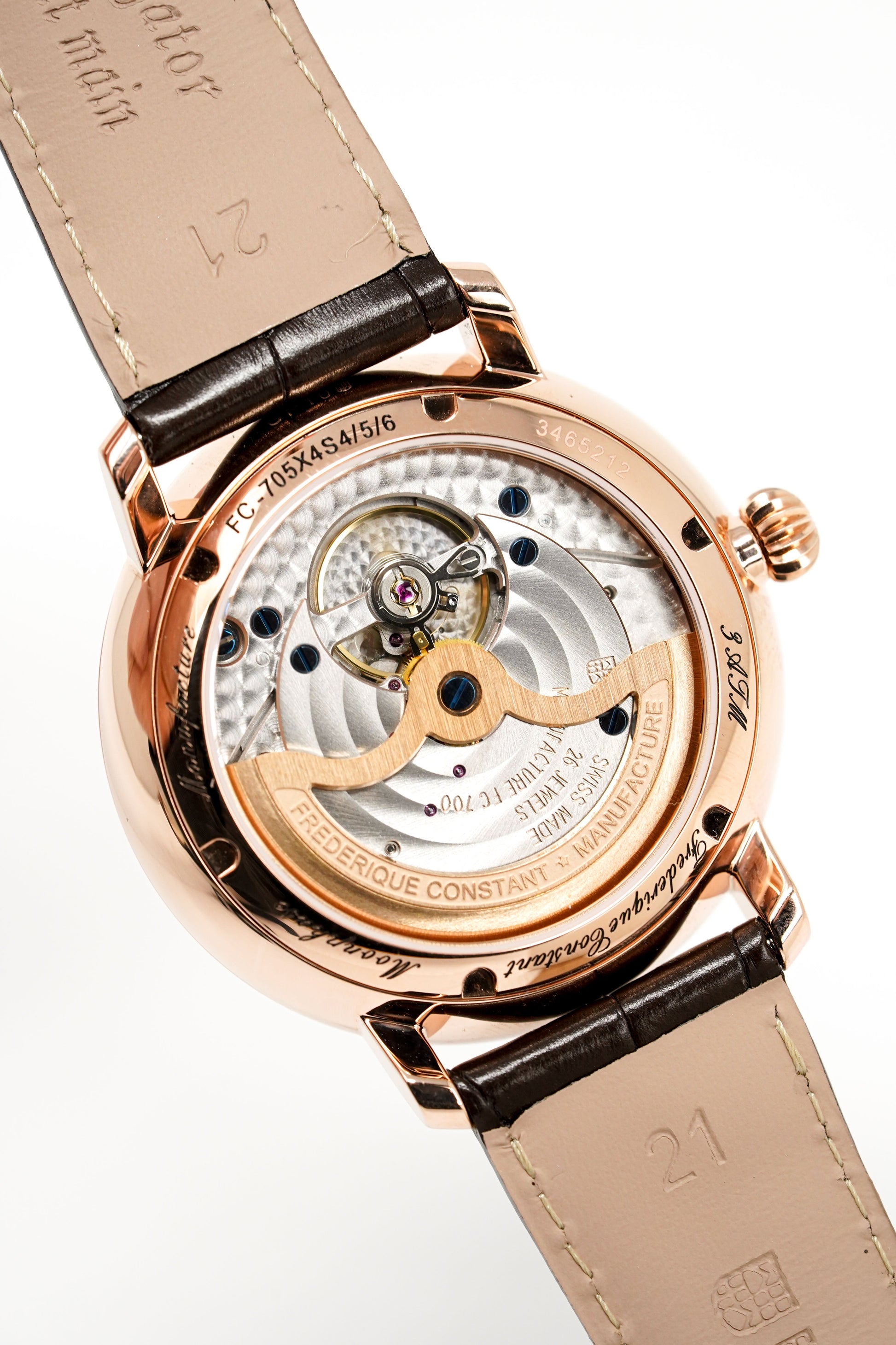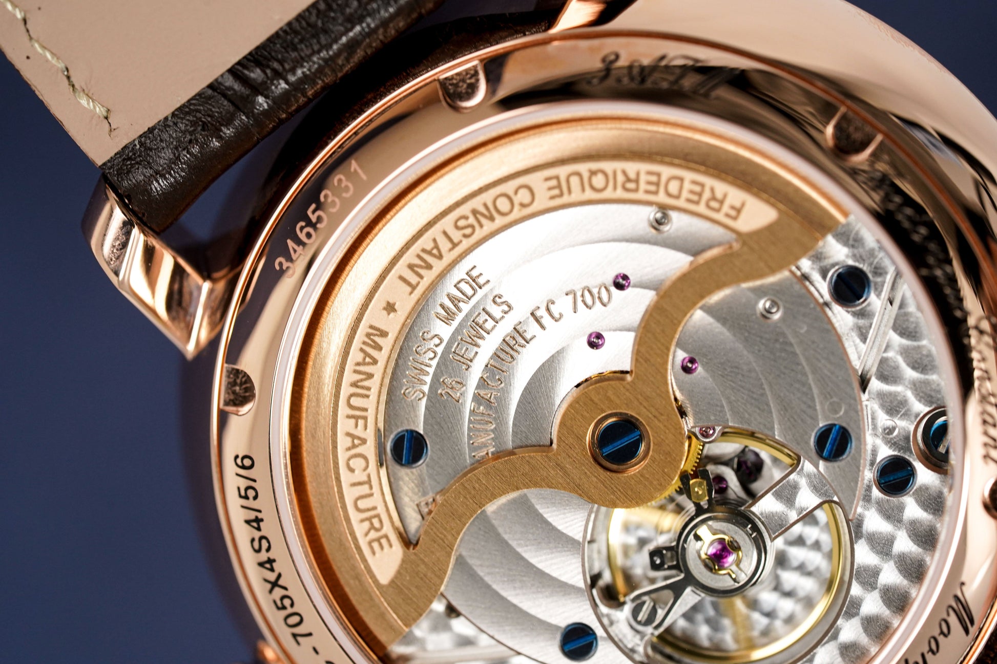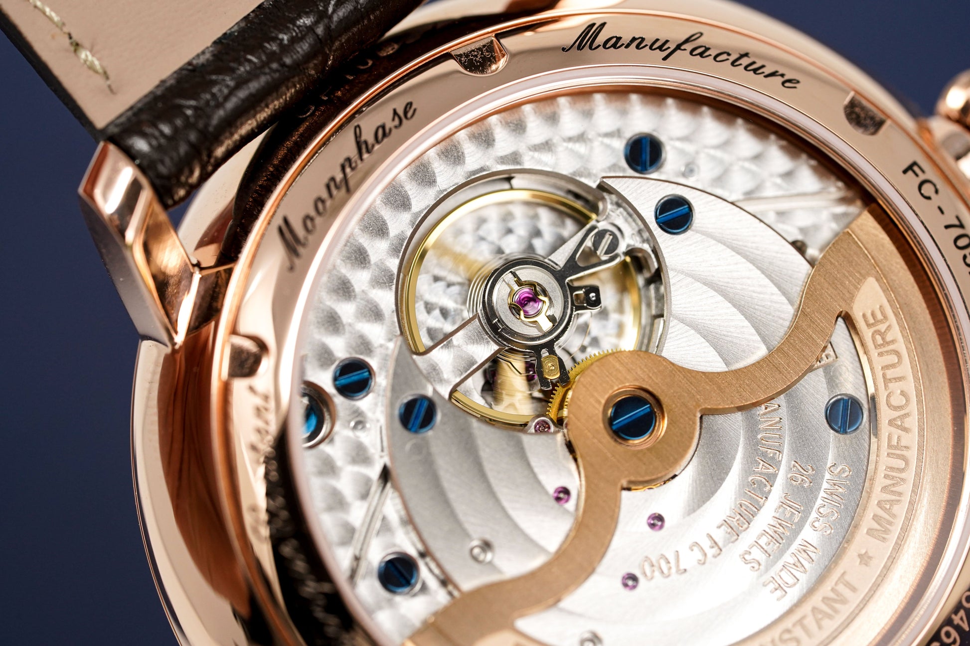 Swiss Made Automatic Movement. Caliber FC-705. 26 Jewels. 28,800bph. Power Reserve of 42 Hours. Moonphase & Date Display.