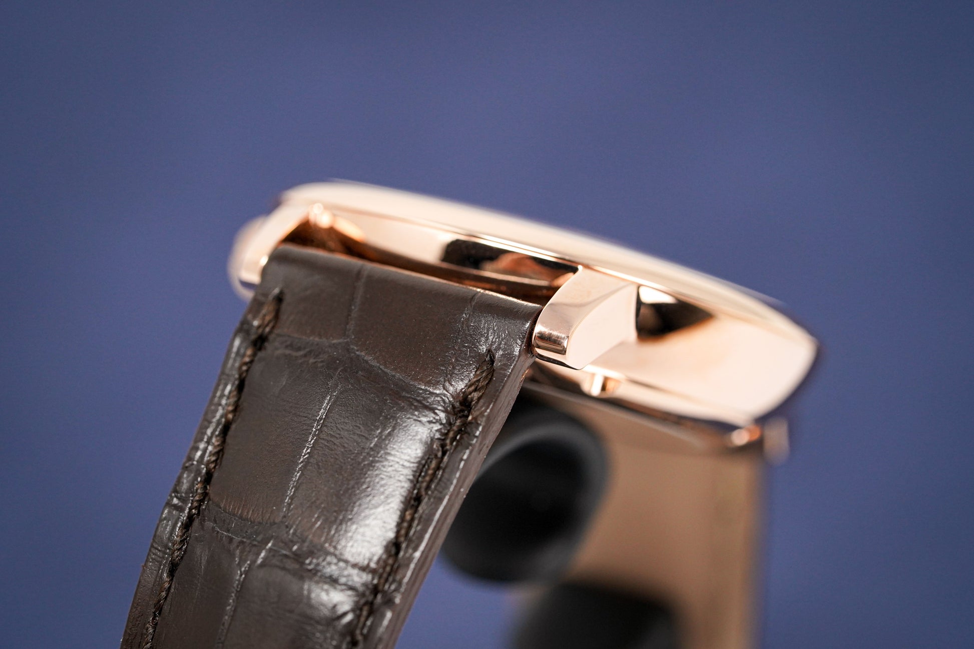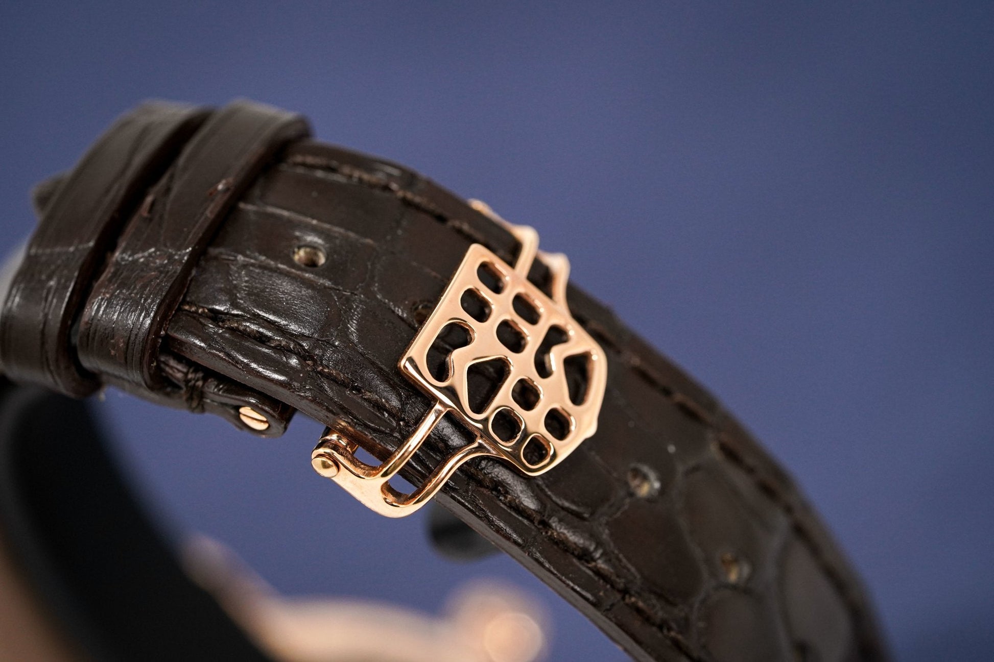 Black Alligator Strap with Rose Gold Plated 316L Stainless Steel Folding Clasp.
