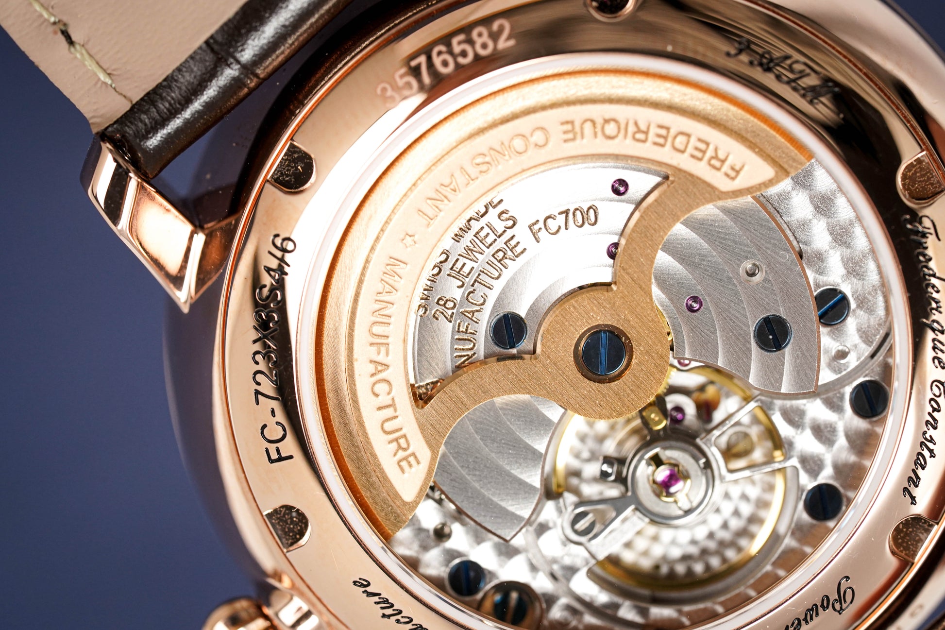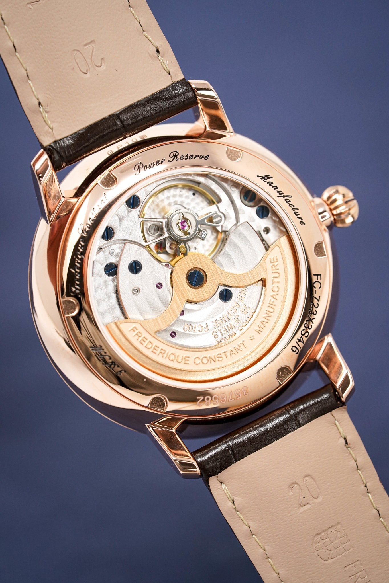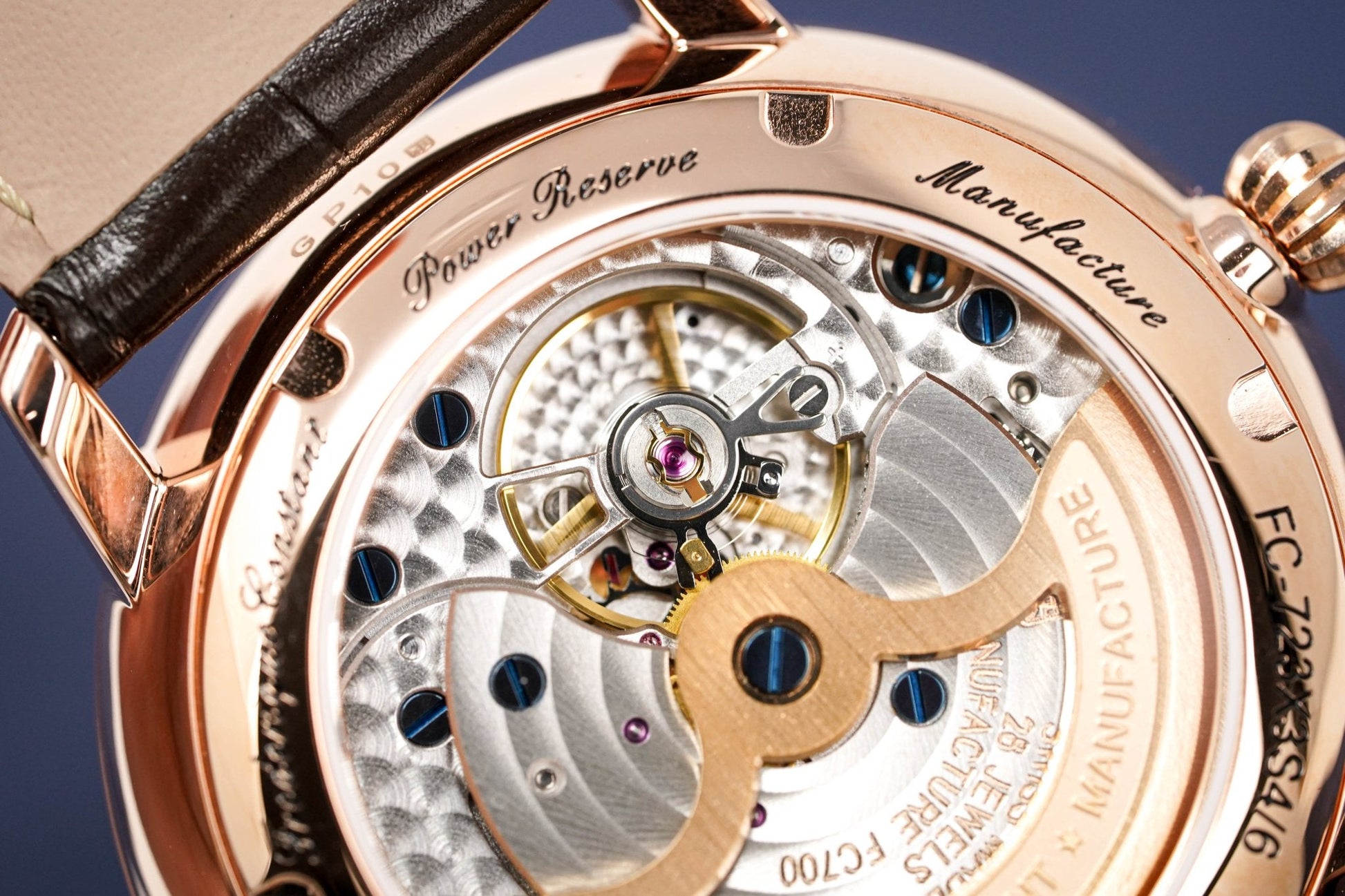 In House Automatic Frederique Constant Manufacture Movement. Caliber FC-723. 28 Jewels. 28,800bph. Power Reserve of 50 Hours. Power Reserve & Date Display. Decorated Movement.
