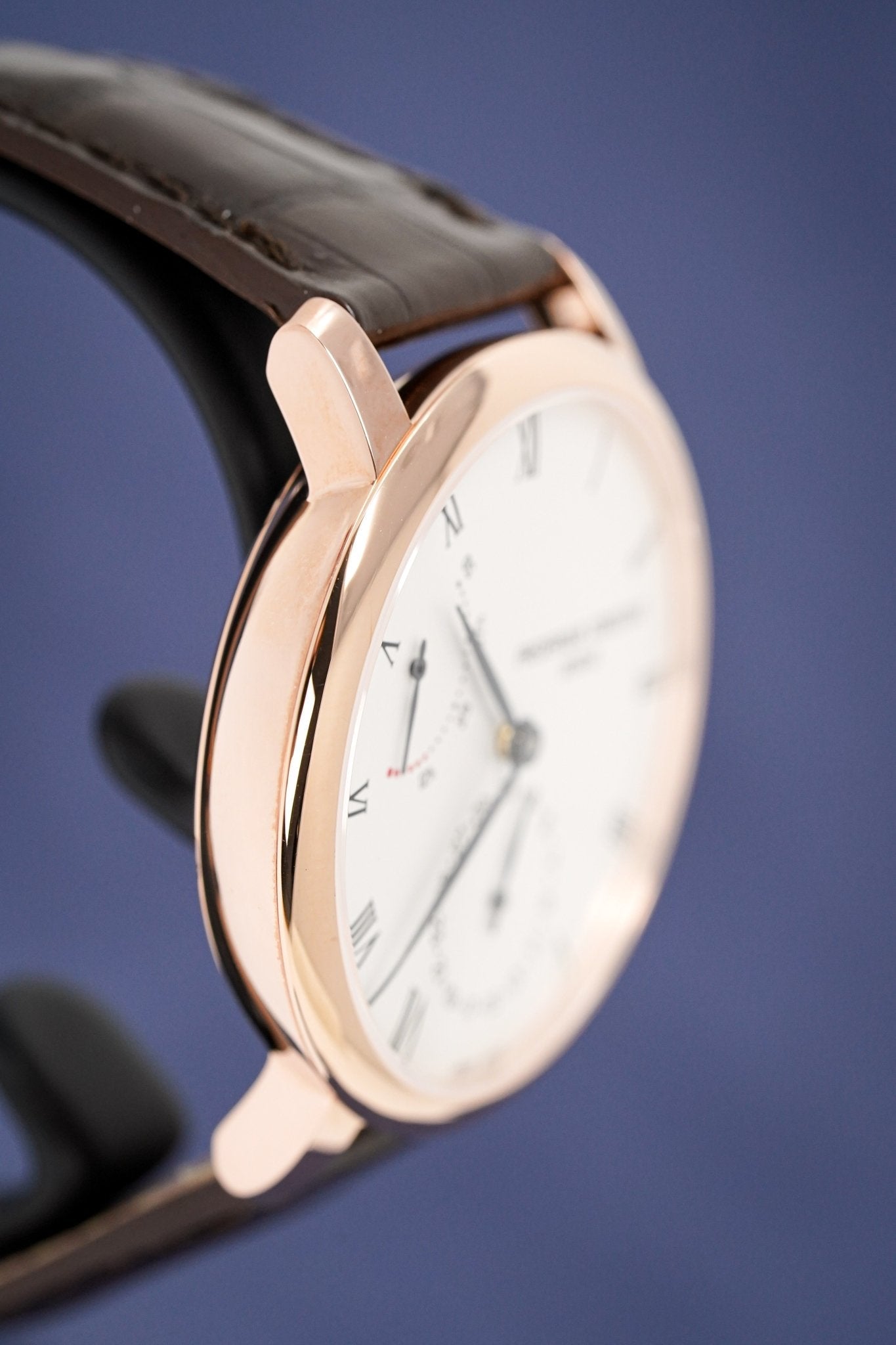 Silver Dial. Hand Polished Black Coated Steel Hands. Printed Black Roman Numeral Indexes. Date Pointer at 6 O'Clock. Power Reserve Indicator at 10.