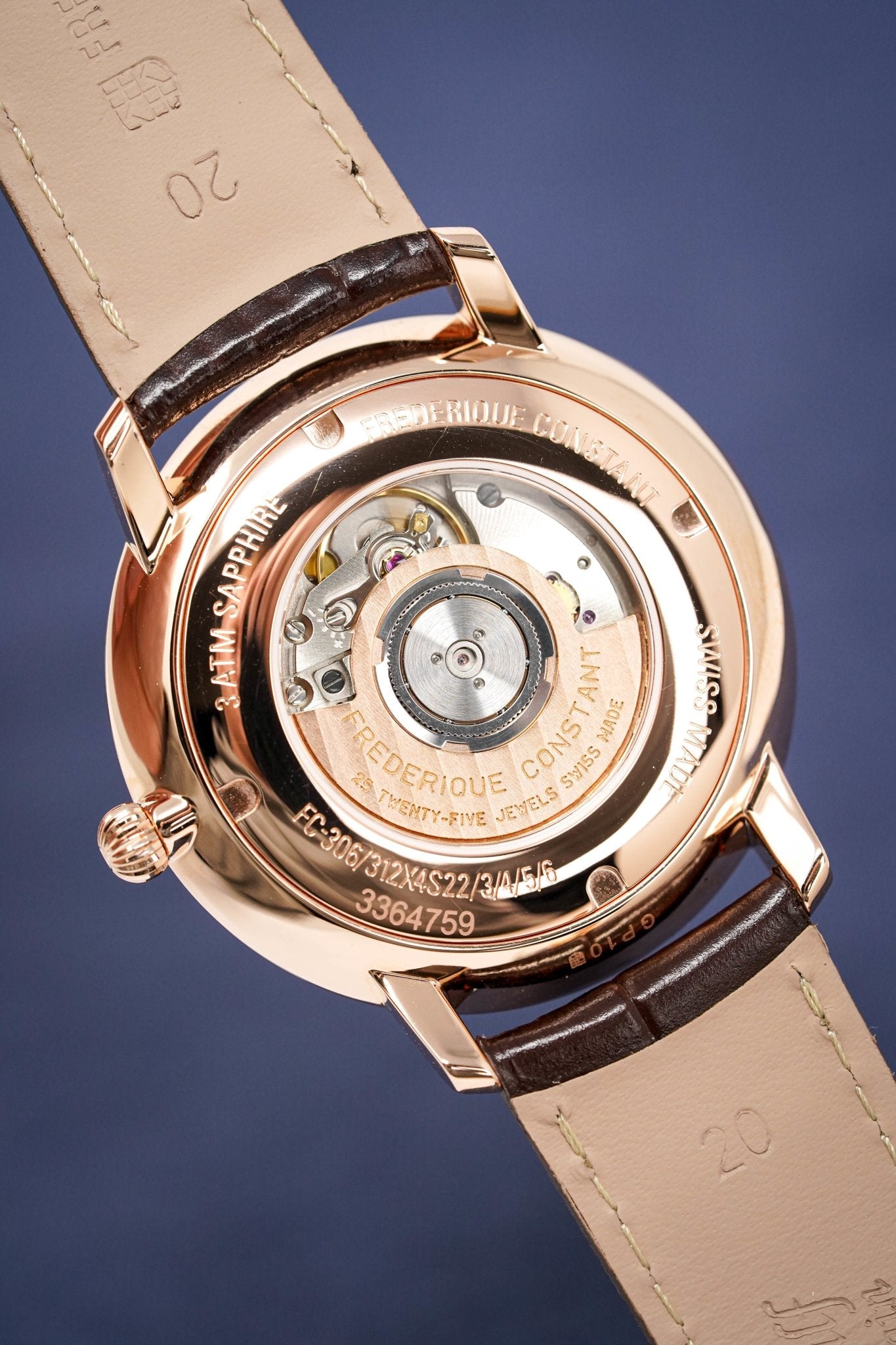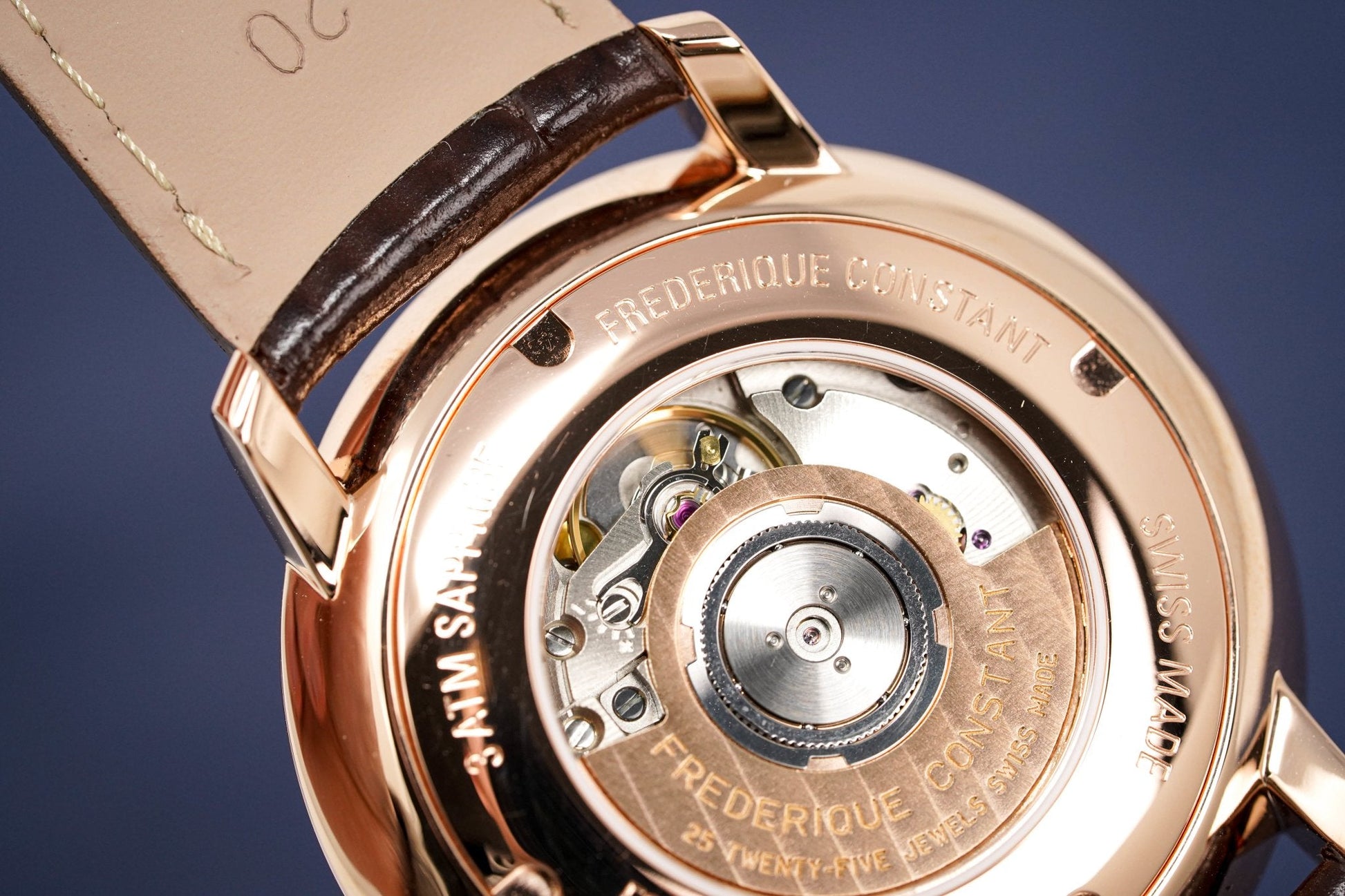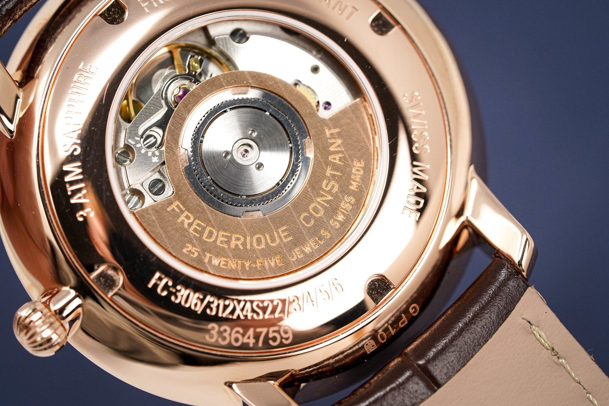 40mm x 8mm Rose Gold Plated Stainless Steel Case. Sapphire Crystal Open Caseback.
