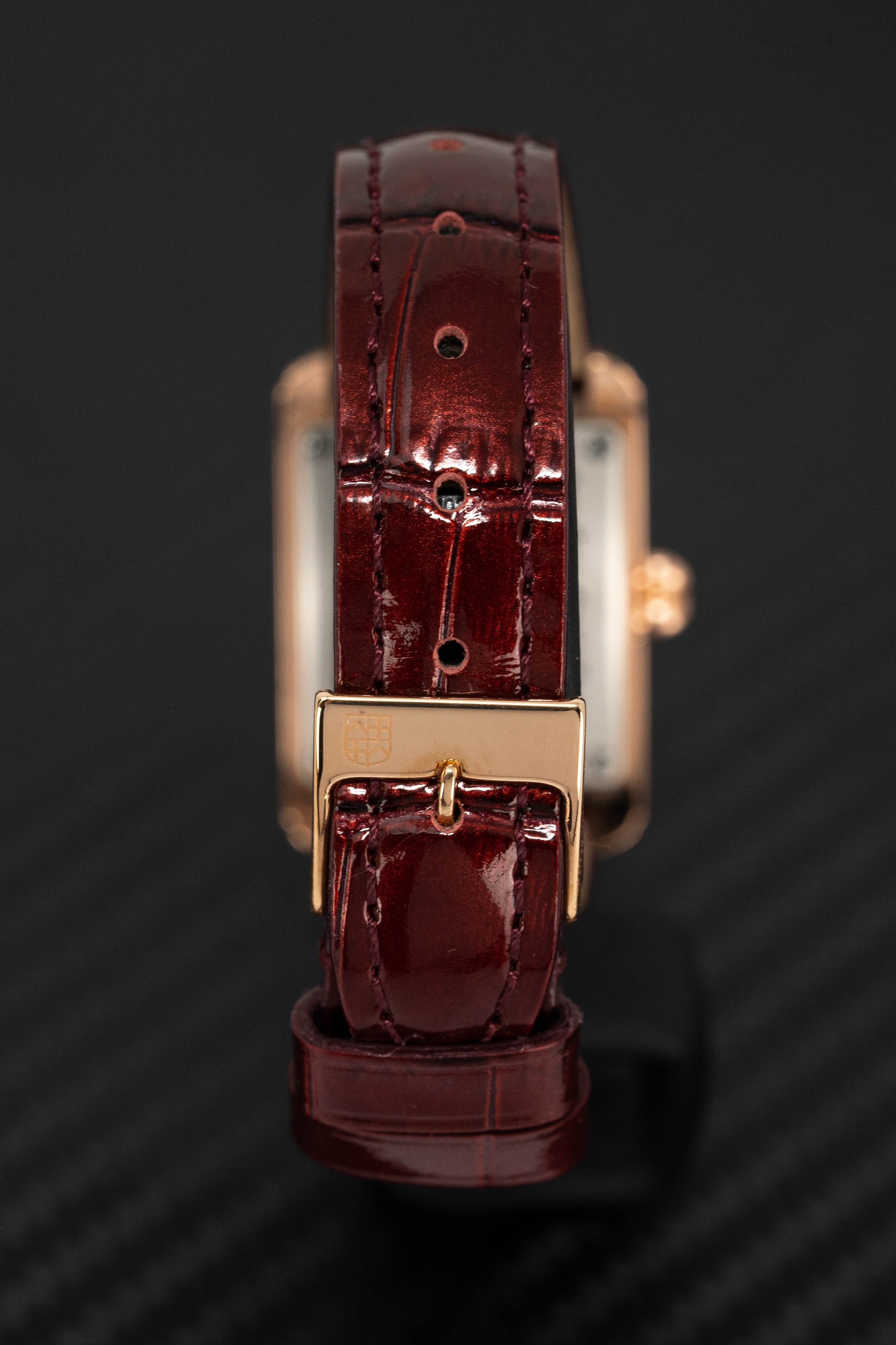 15mm Lug Width Burgundy Croco Calf Leather Strap with Rose Gold PVD Stainless Steel Pin Buckle.