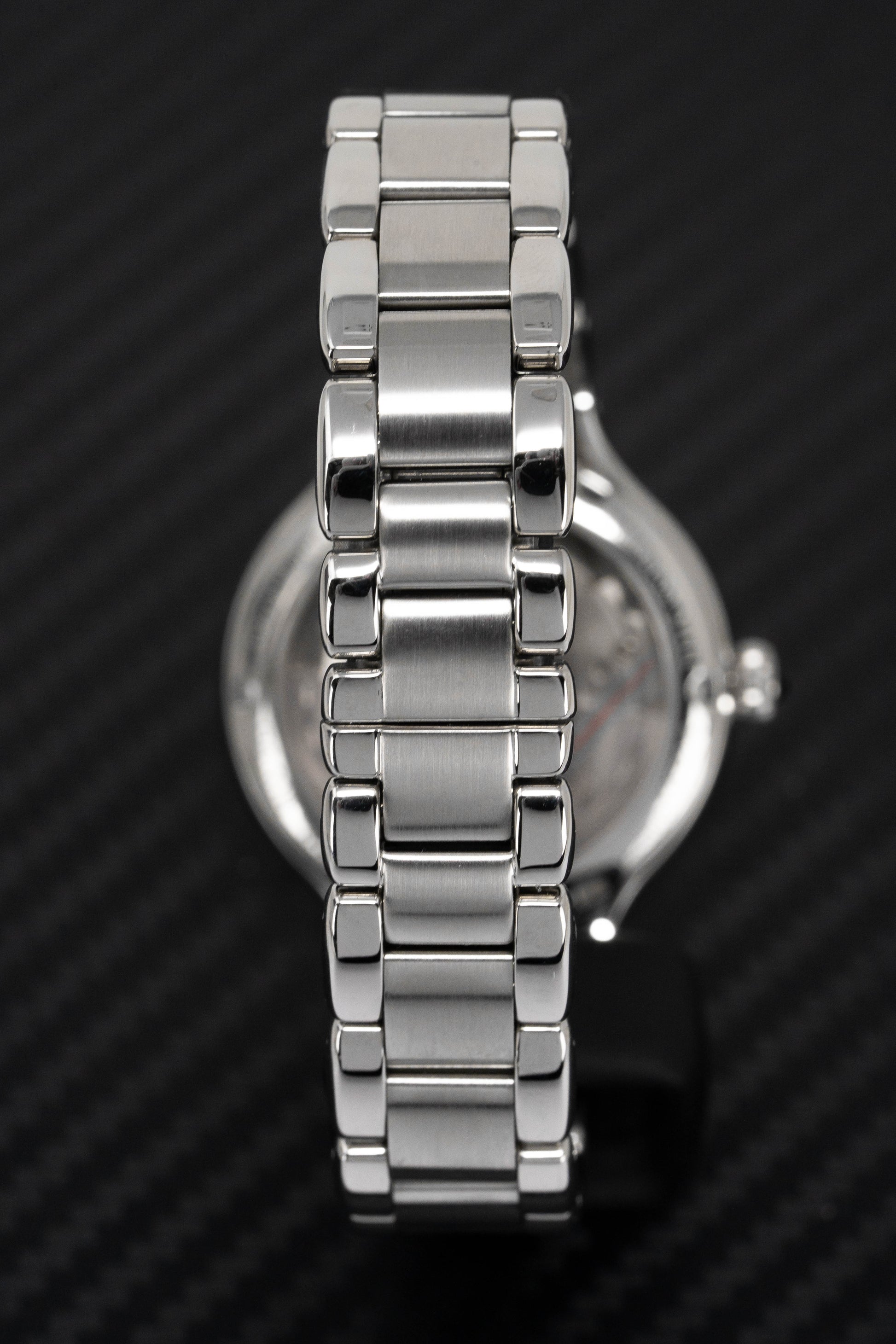 White Mother of Pearl Dial with Heart Pattern - Stainless Steel Roman Numeral and Diamond Set Hour Indexes - Stainless Steel Hour and Minute Hands - Date at 6 O'Clock.