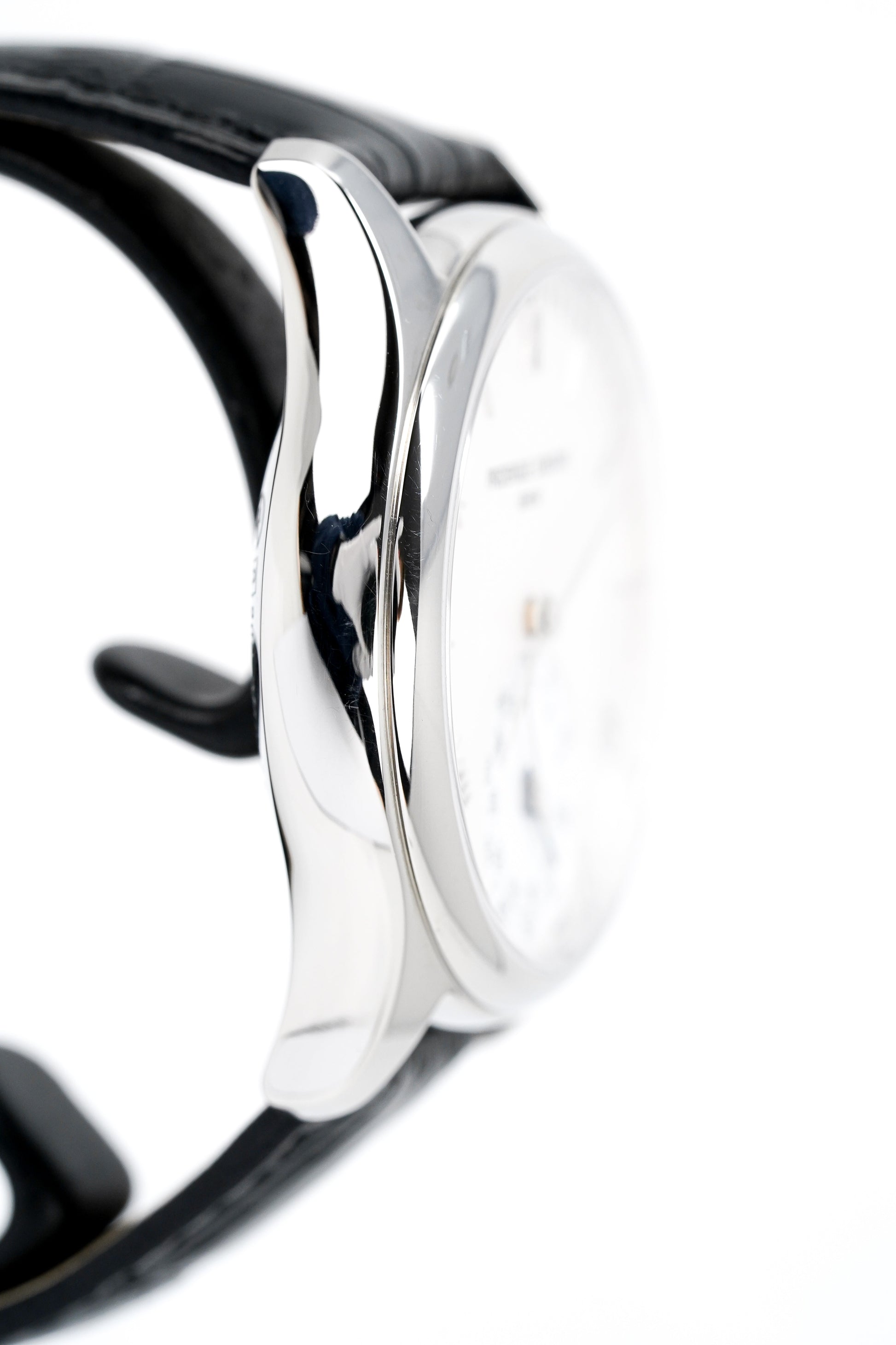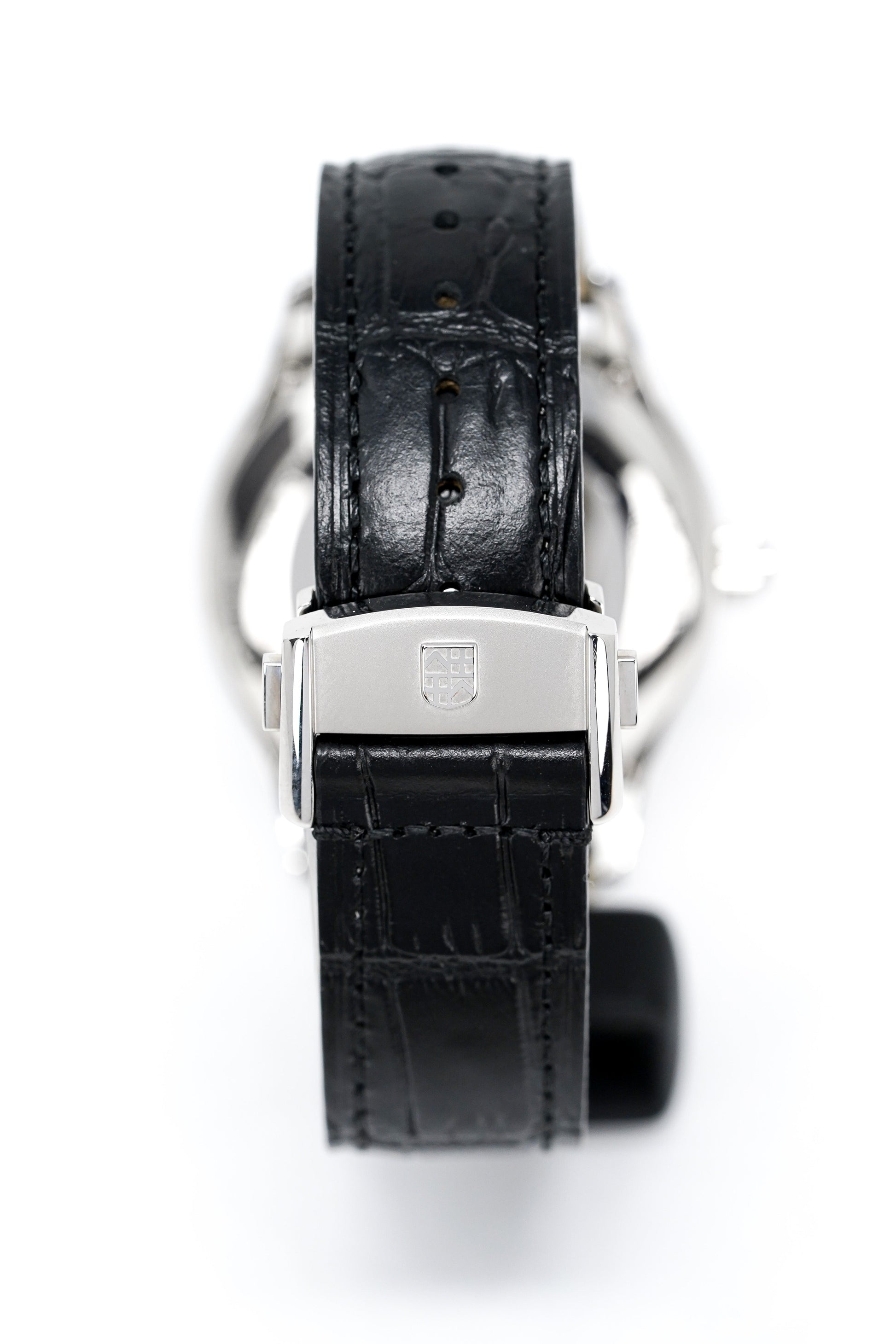 White Guilloche Dial - Silver Roman Numeral and Baton Hour Indexes - Silver Hour and Minute Hands - Date and 1/100th Second Sub-Dial.