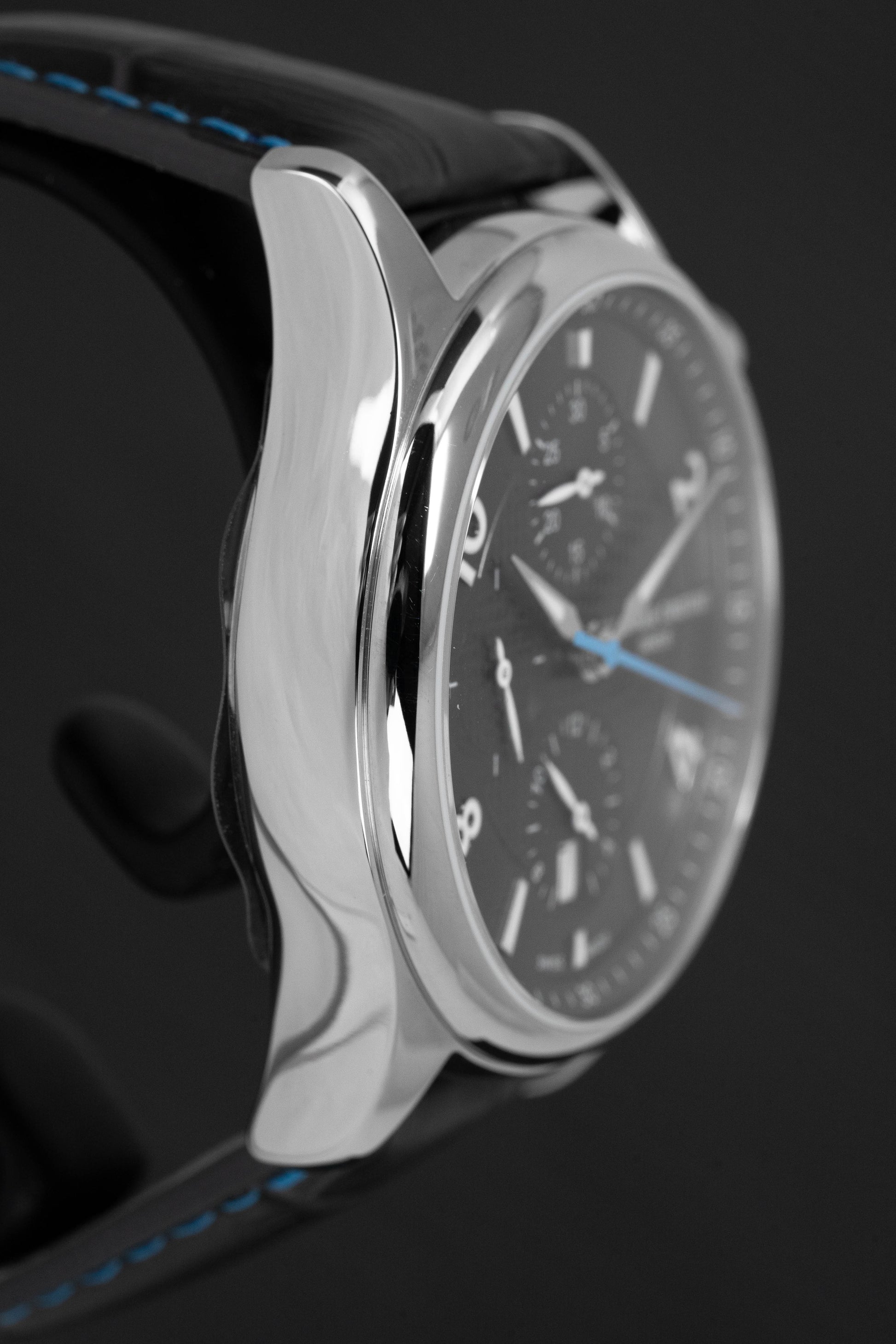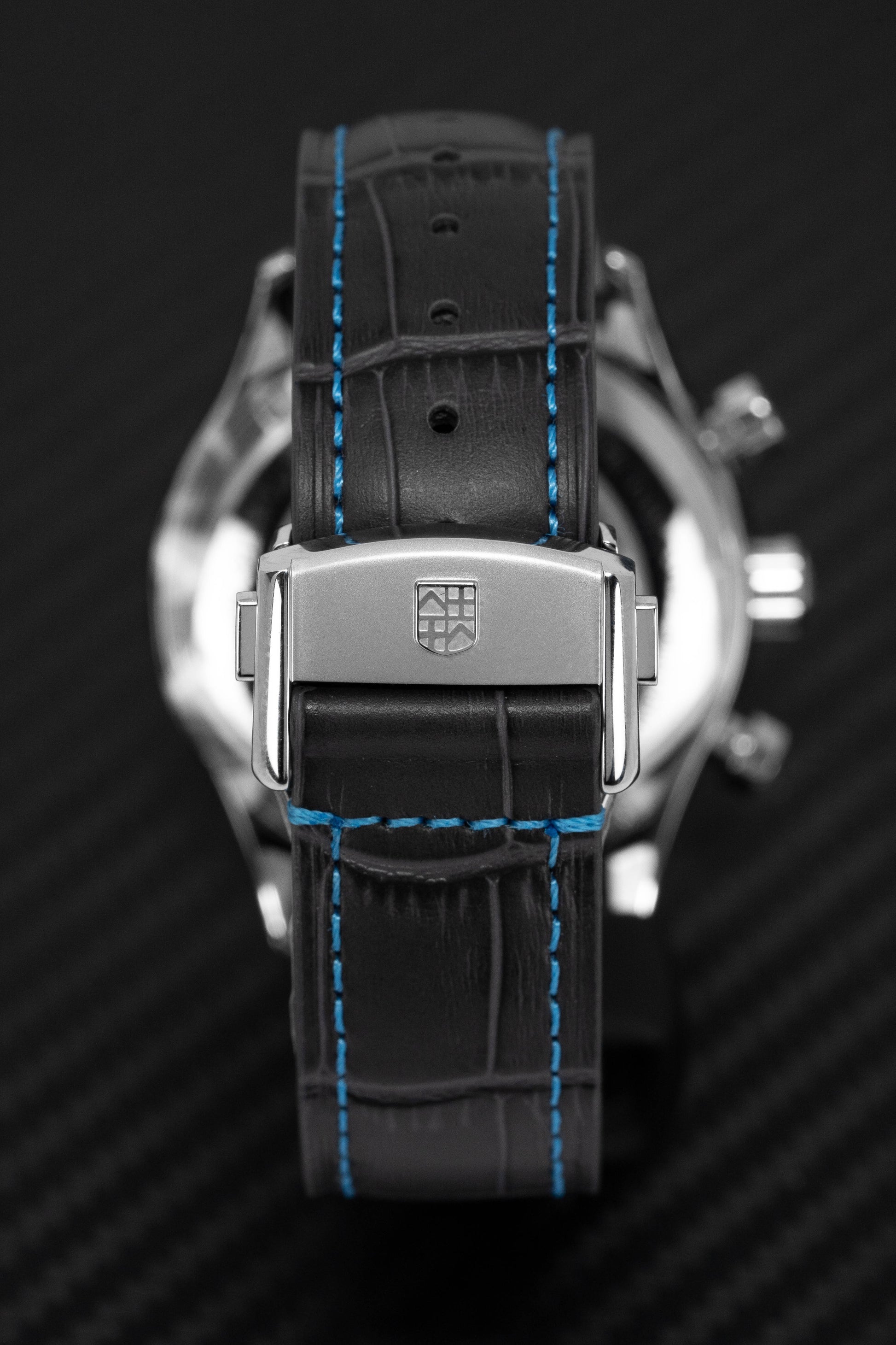 Black Guilloché Dial with Date Window at 6 O'clock - Luminous Arabic Numbered Hour Indexes - Luminous Hour and Minute Hand - Blue Seconds Hand - Three Sub-Dials.