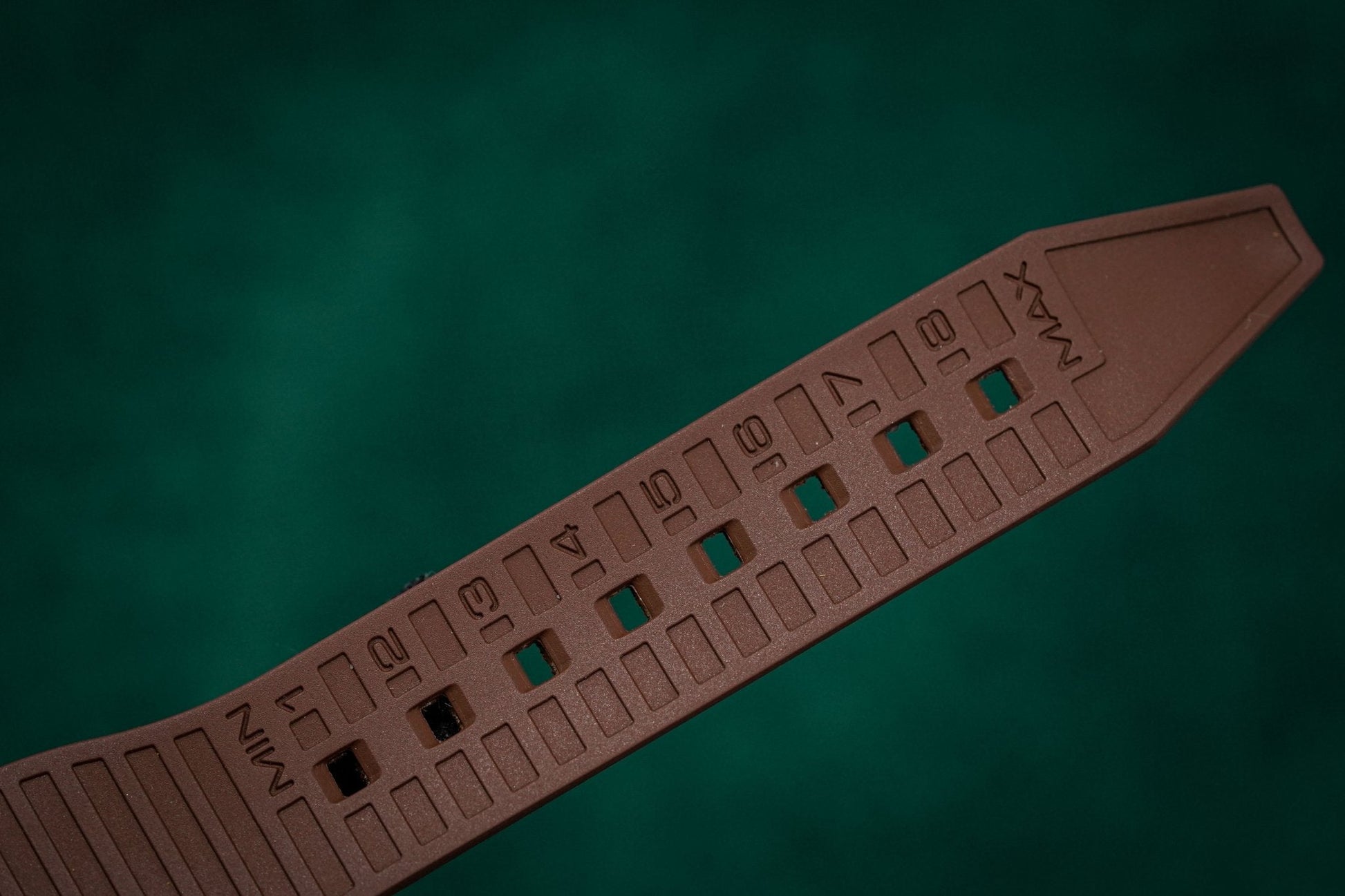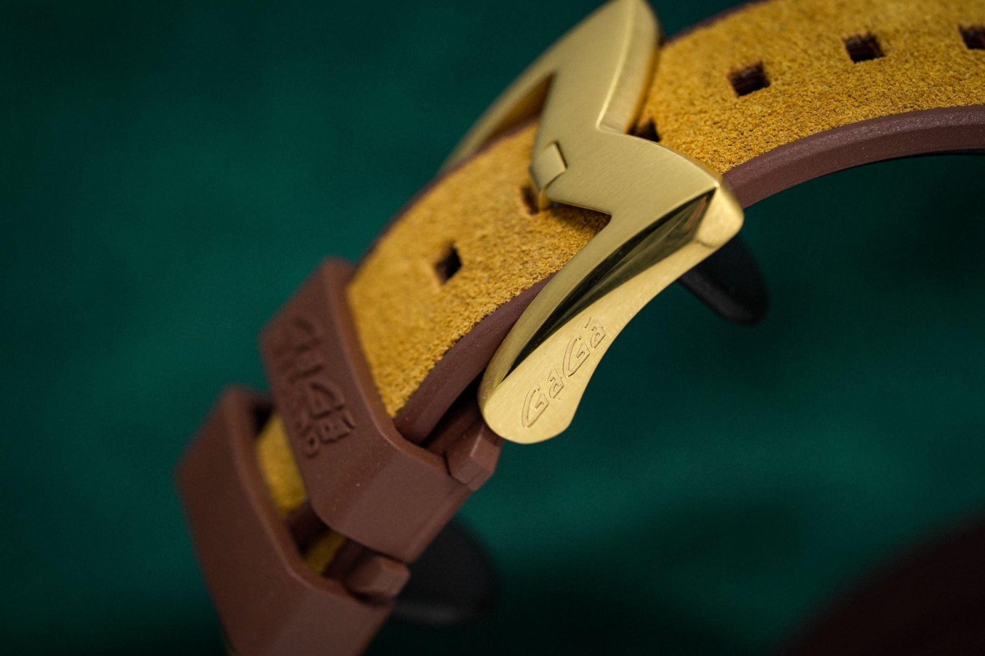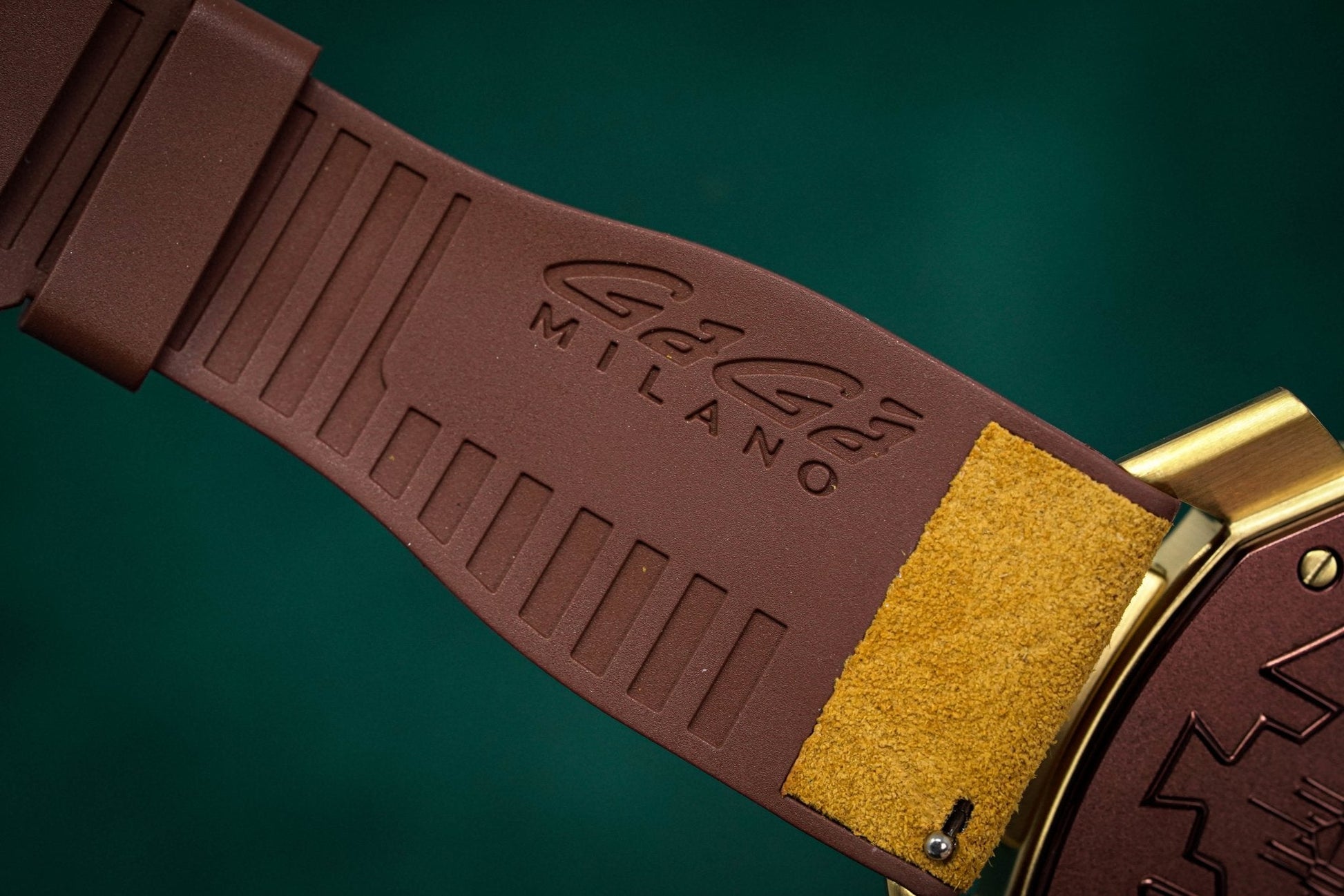22mm x 18cm Brown Rubber Strap with upper Leather Insert. Gold Plated Stainless Steel Buckle.