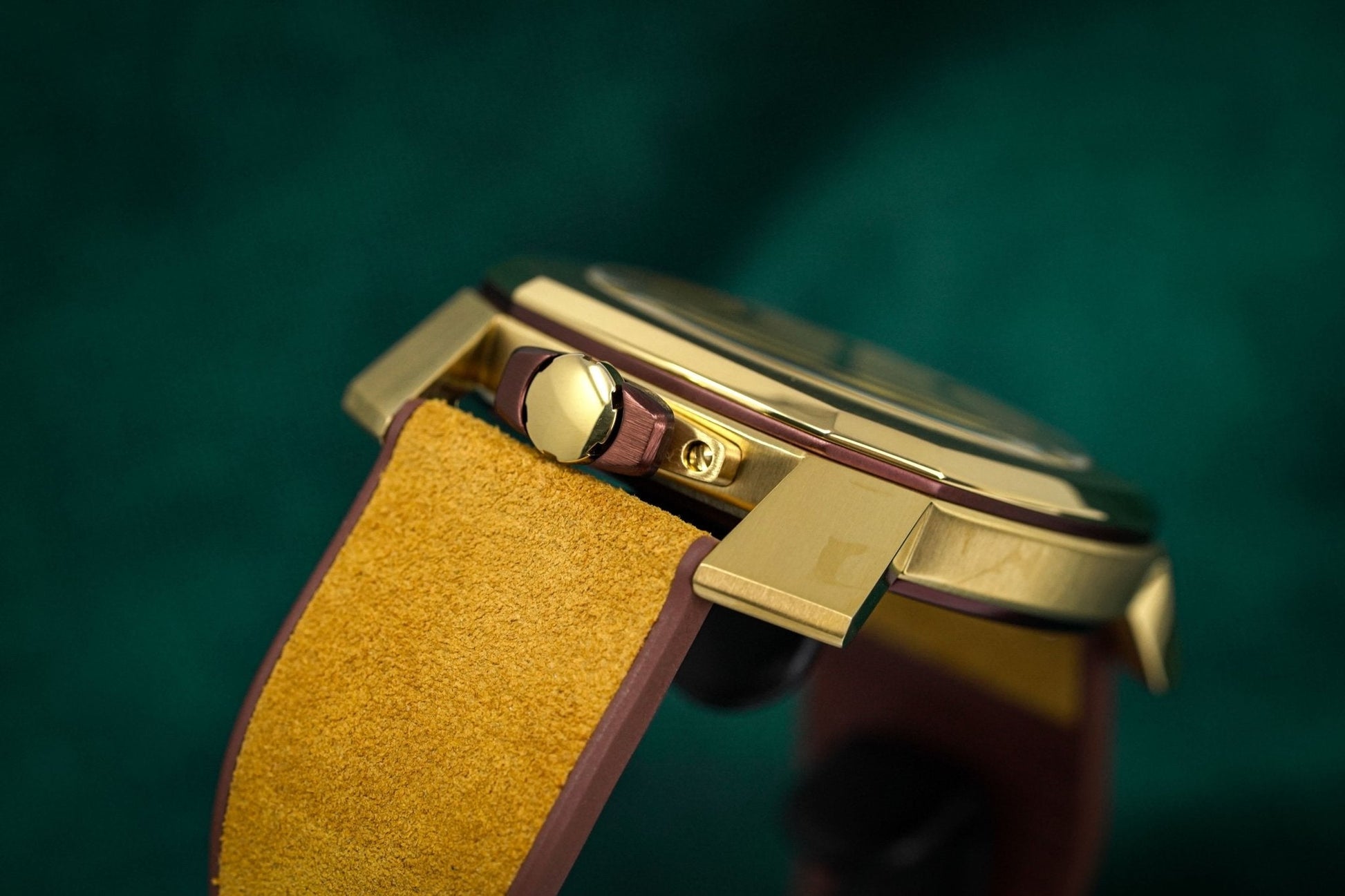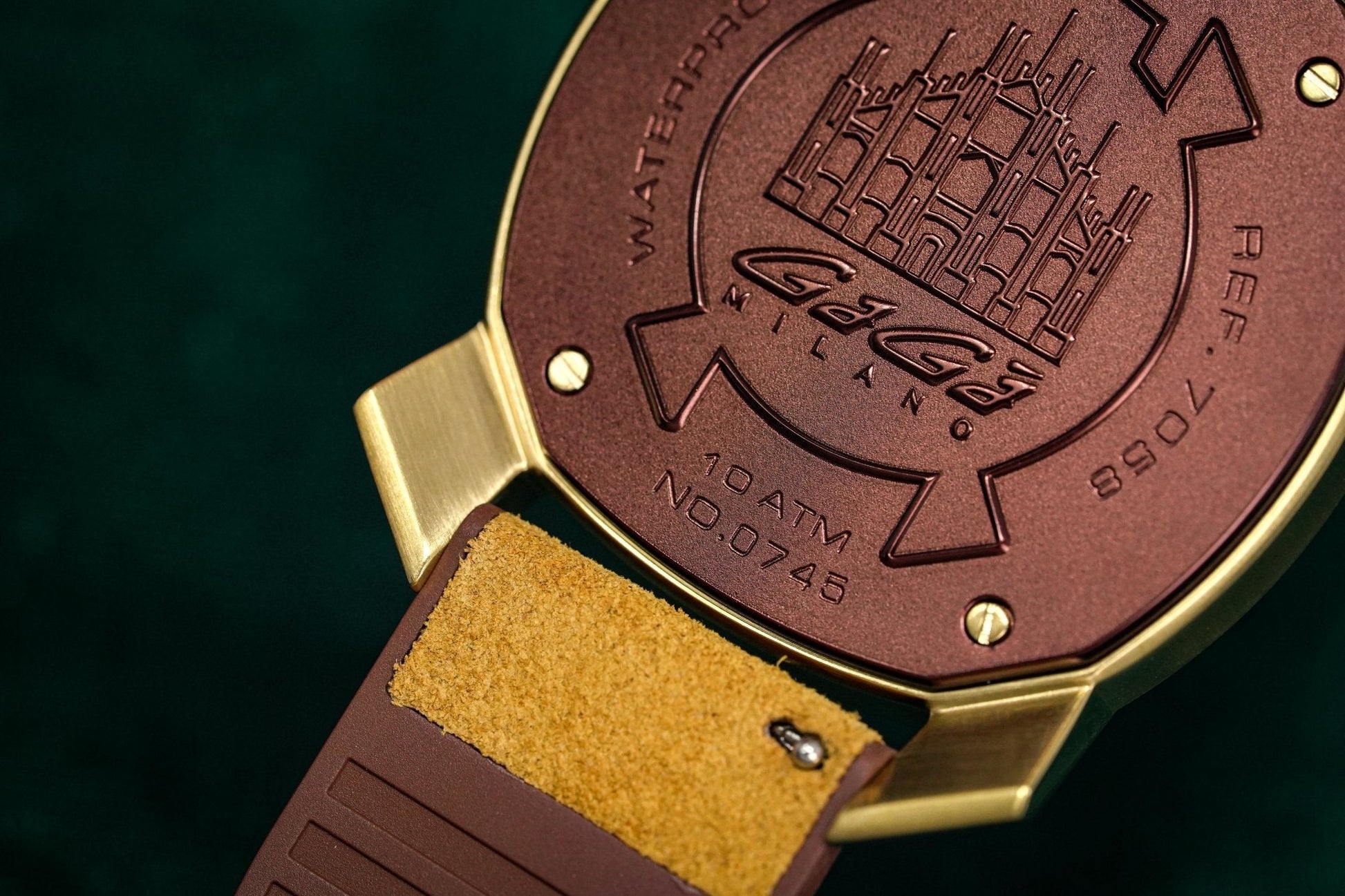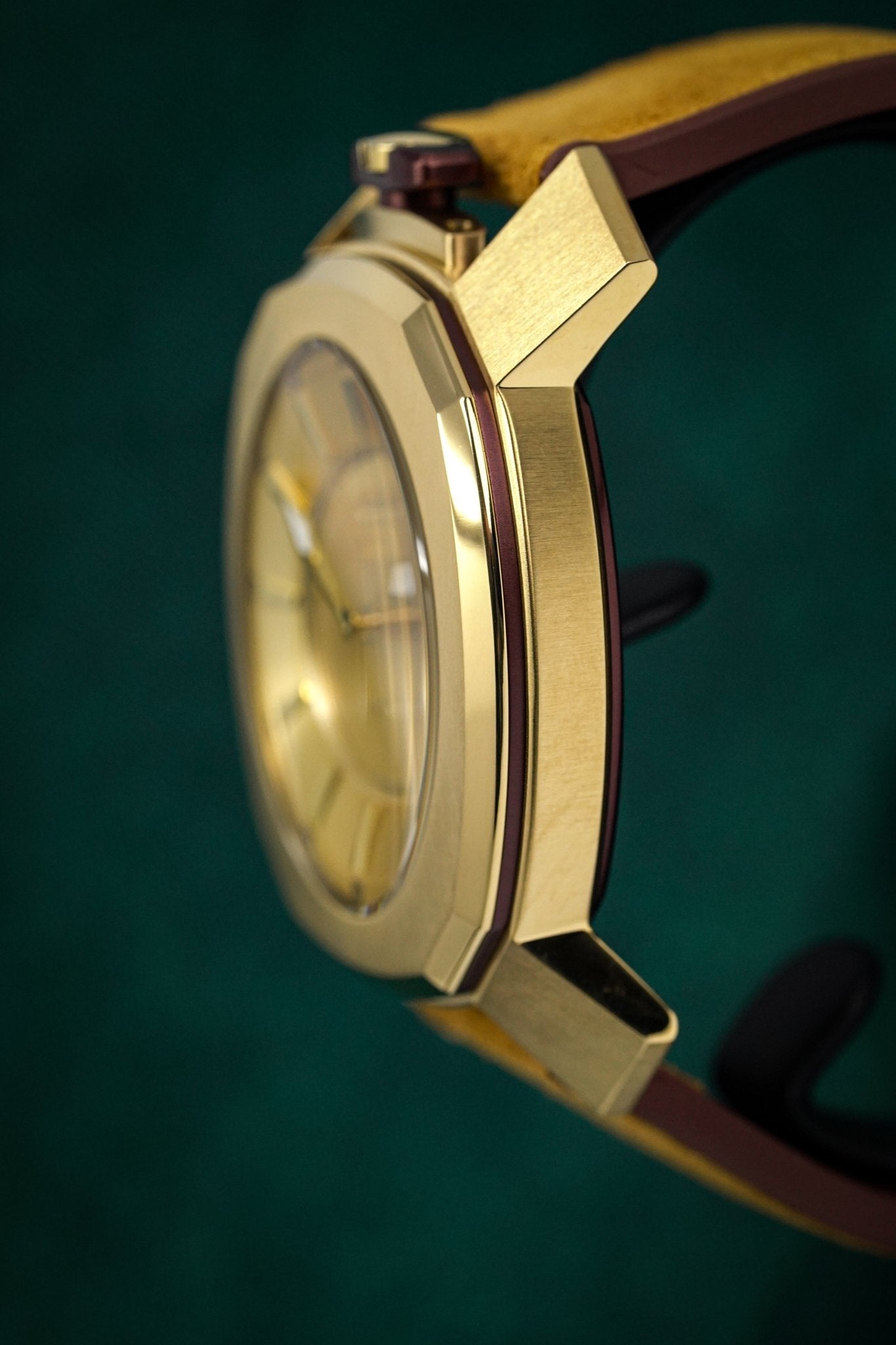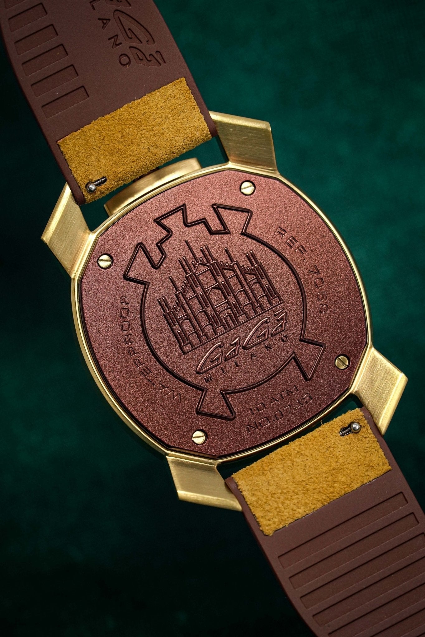 44mm x 11mm Gold Plated 316L Stainless Steel Case. Gold Plated Stainless Steel Bezel. Mineral Glass with Sapphire Treatment. Screw Down Caseback.