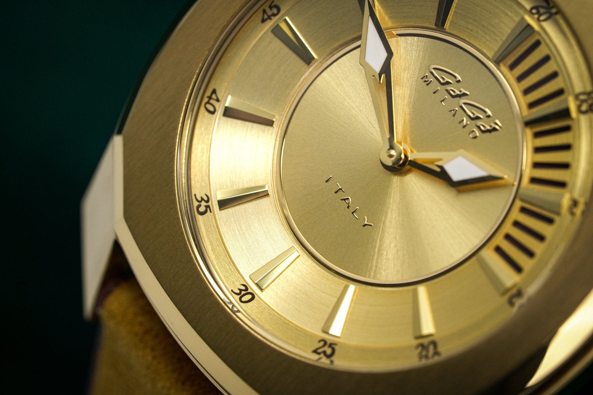 Gold Sunray Dial. Gold PVD Hour Markers and Hands.
