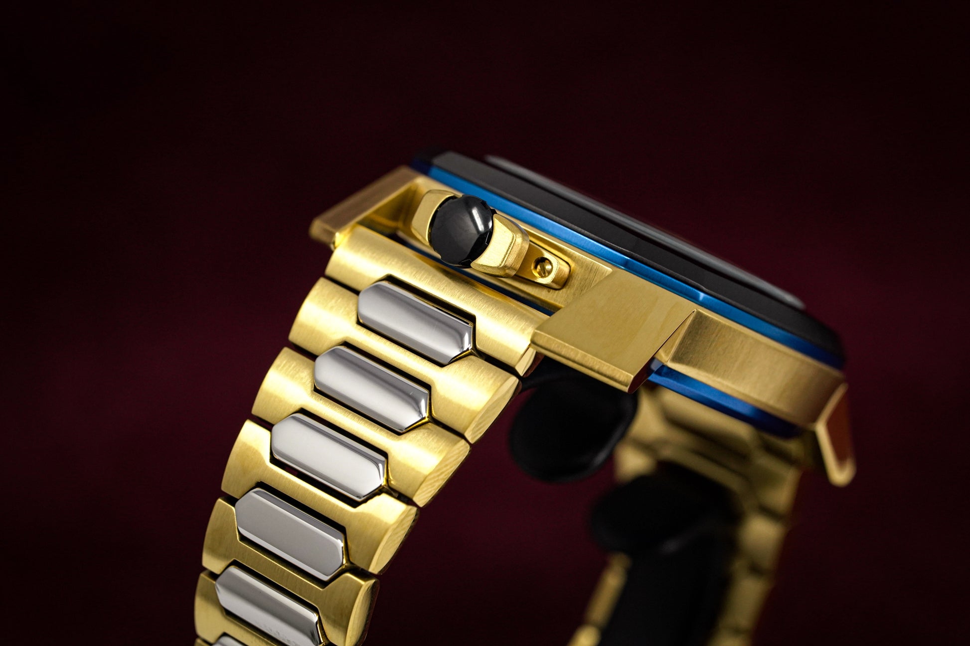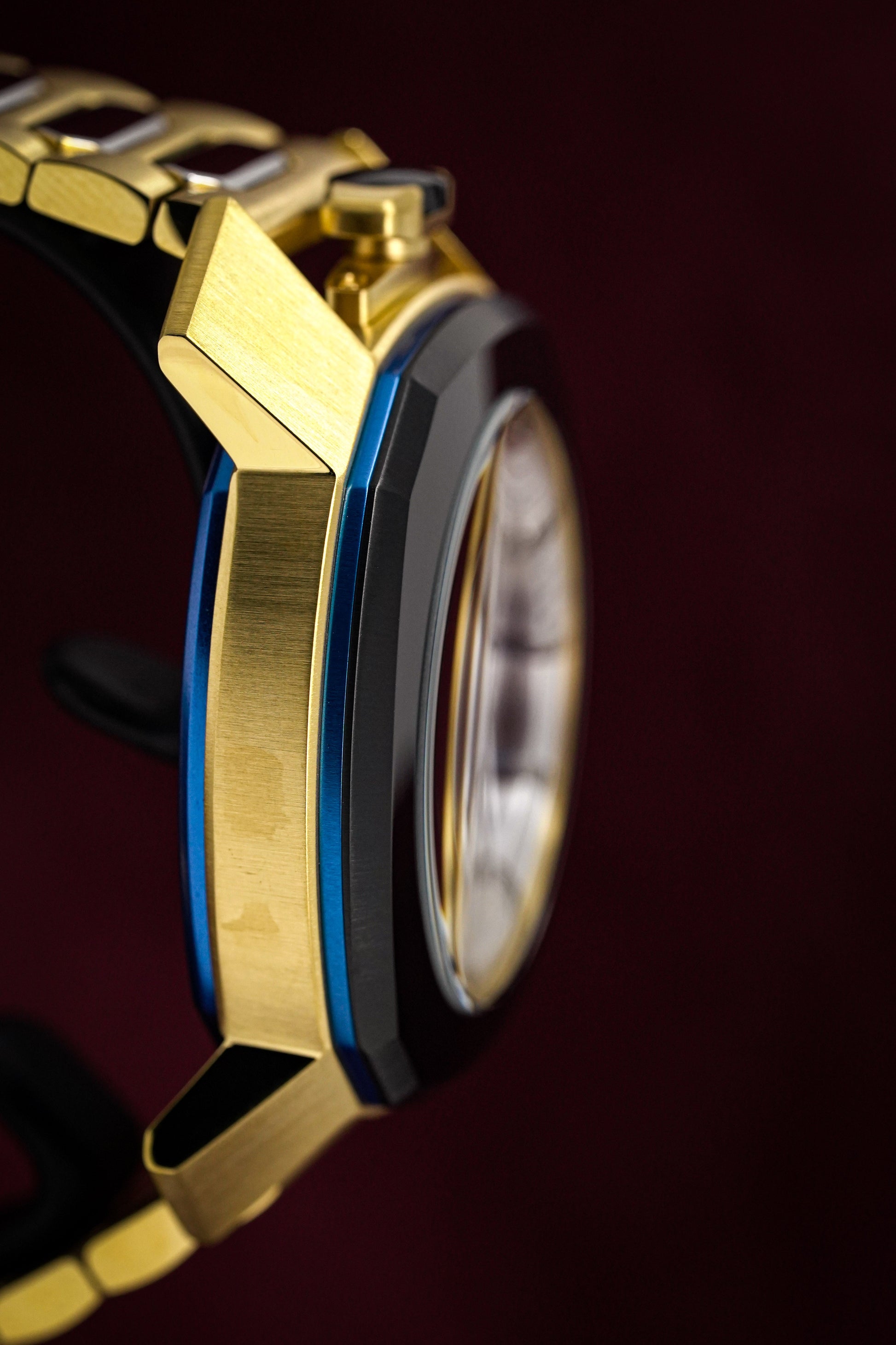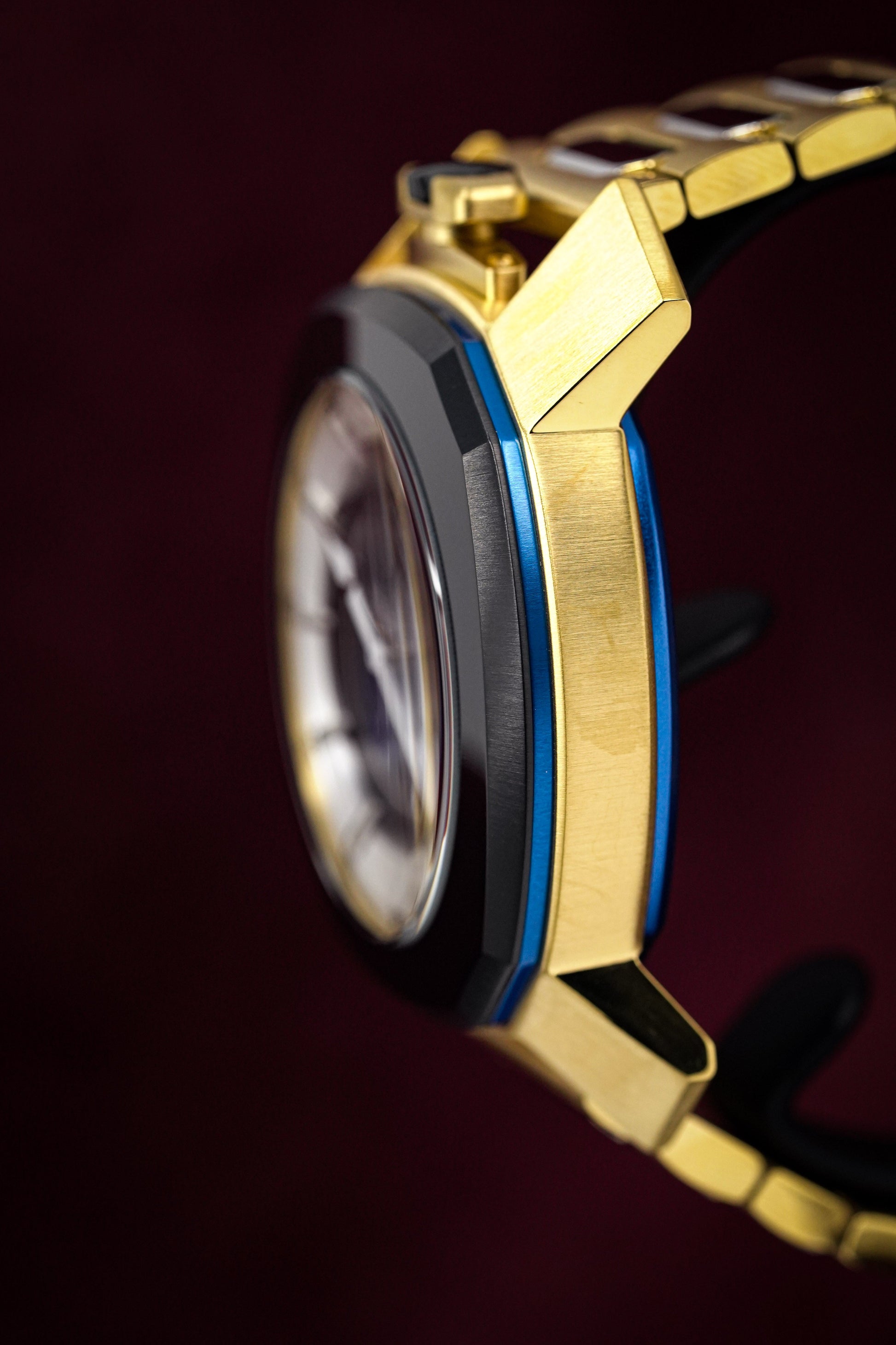 44mm x 13.5mm Gold PVD 316L Stainless Steel Case. Black PVD Stainless Steel Bezel. Mineral Glass with Sapphire Treatment. Screw Down Caseback.