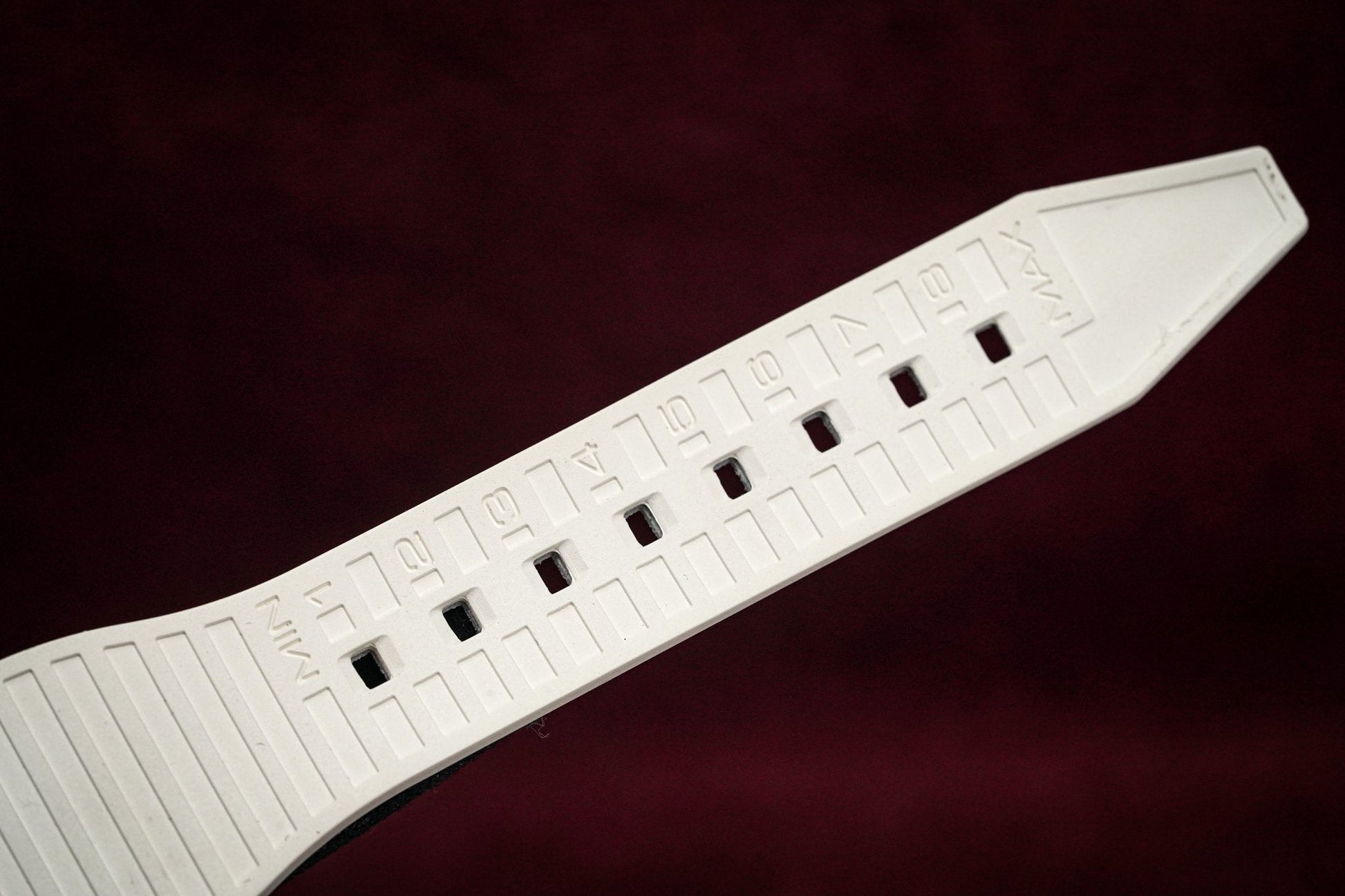 22mm x 18cm White Rubber Strap with White upper Leather Insert. 316L Stainless Steel Buckle.