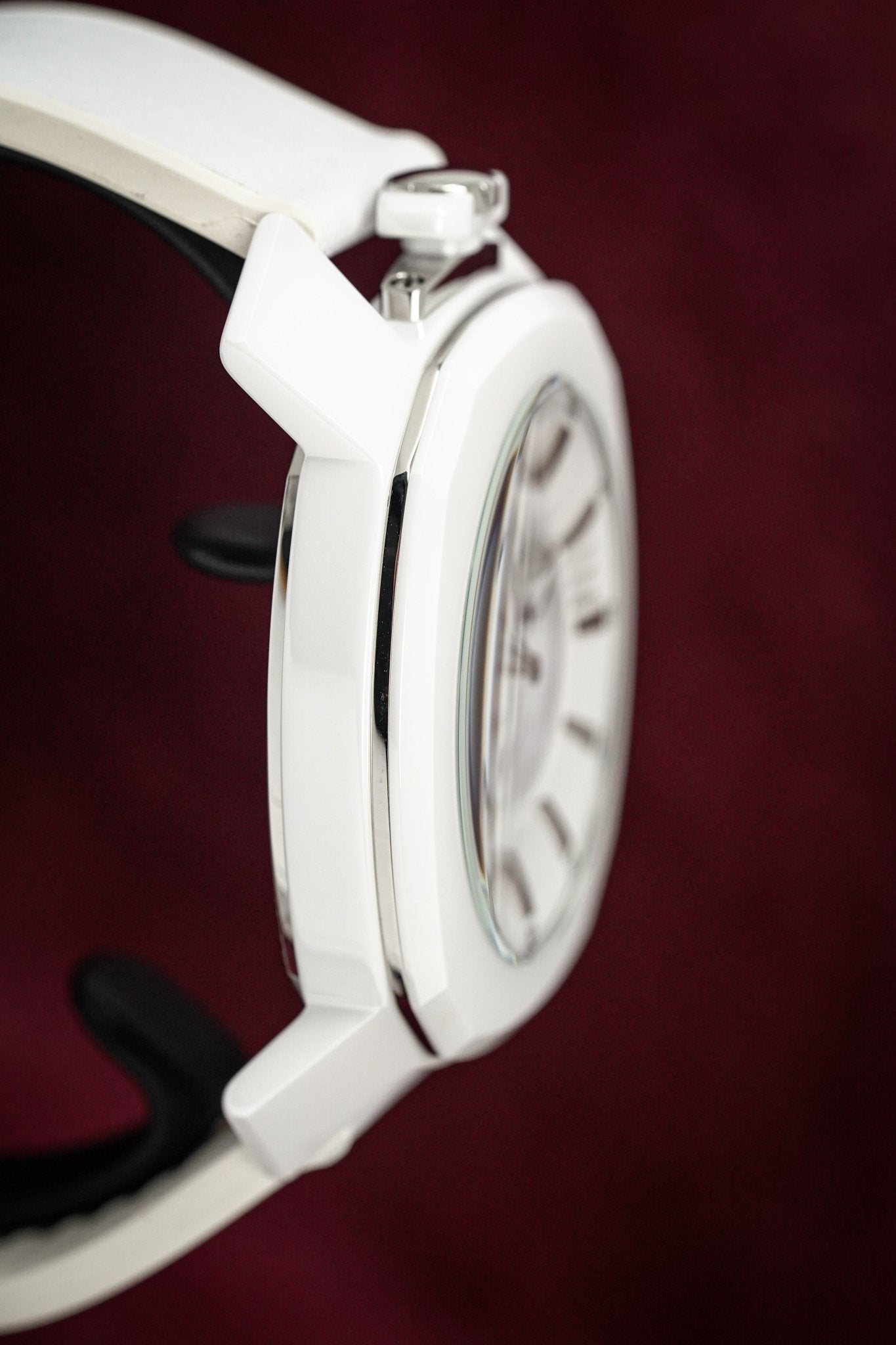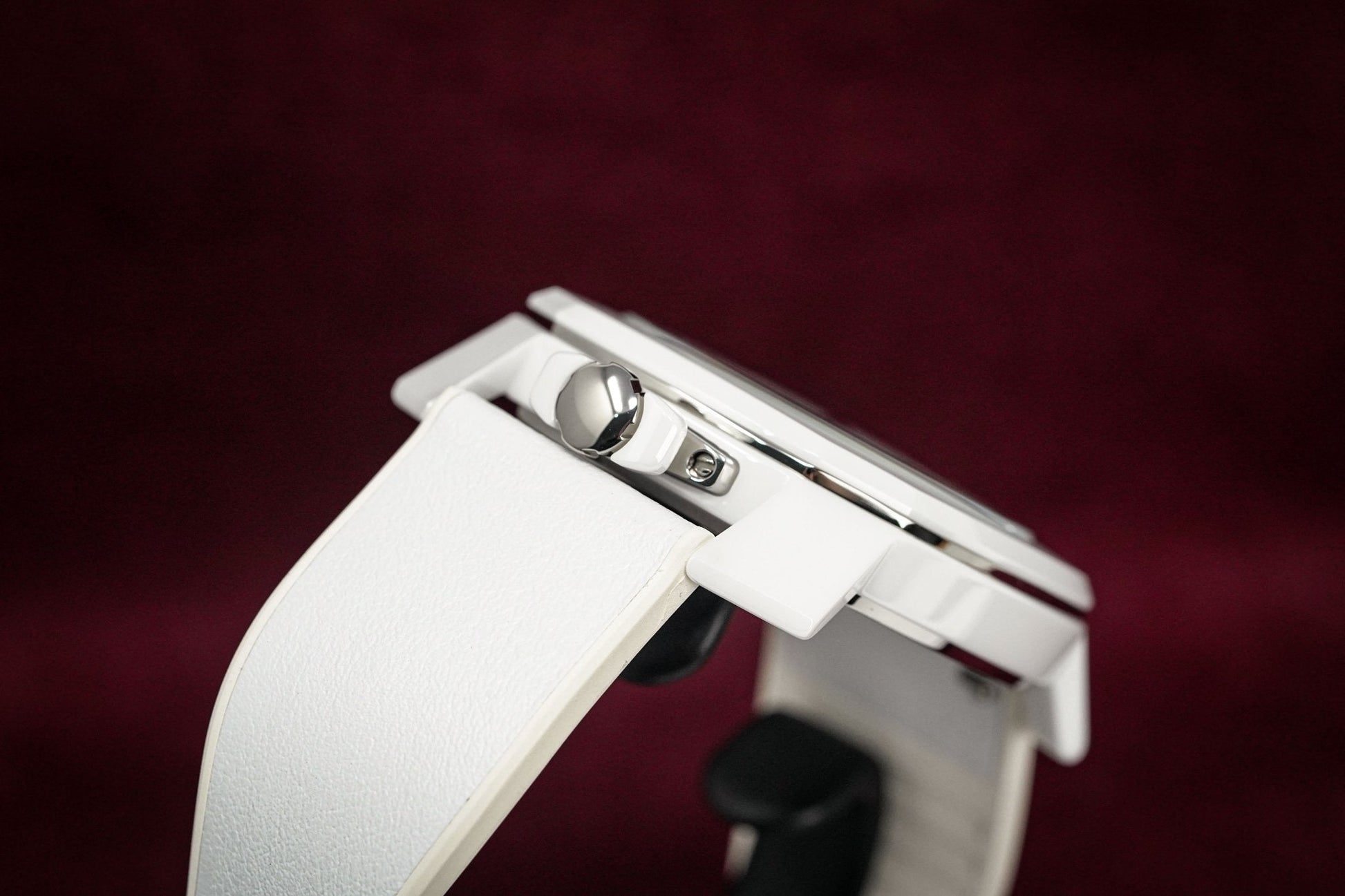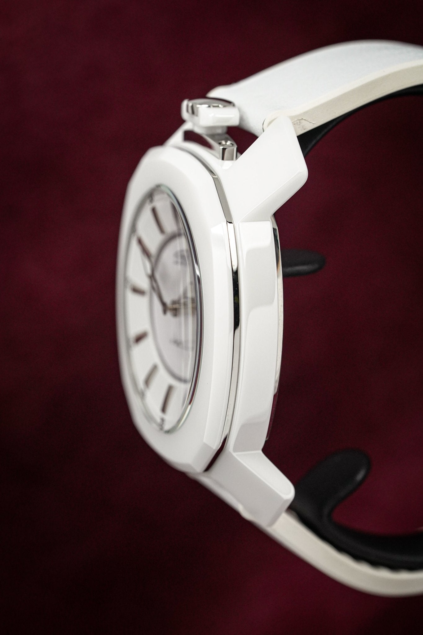 44mm x 11mm White Ceramic Case. Mineral Glass with Sapphire Treatment. Screw Down Caseback.