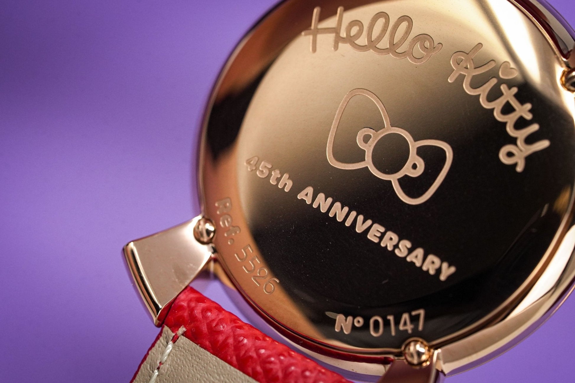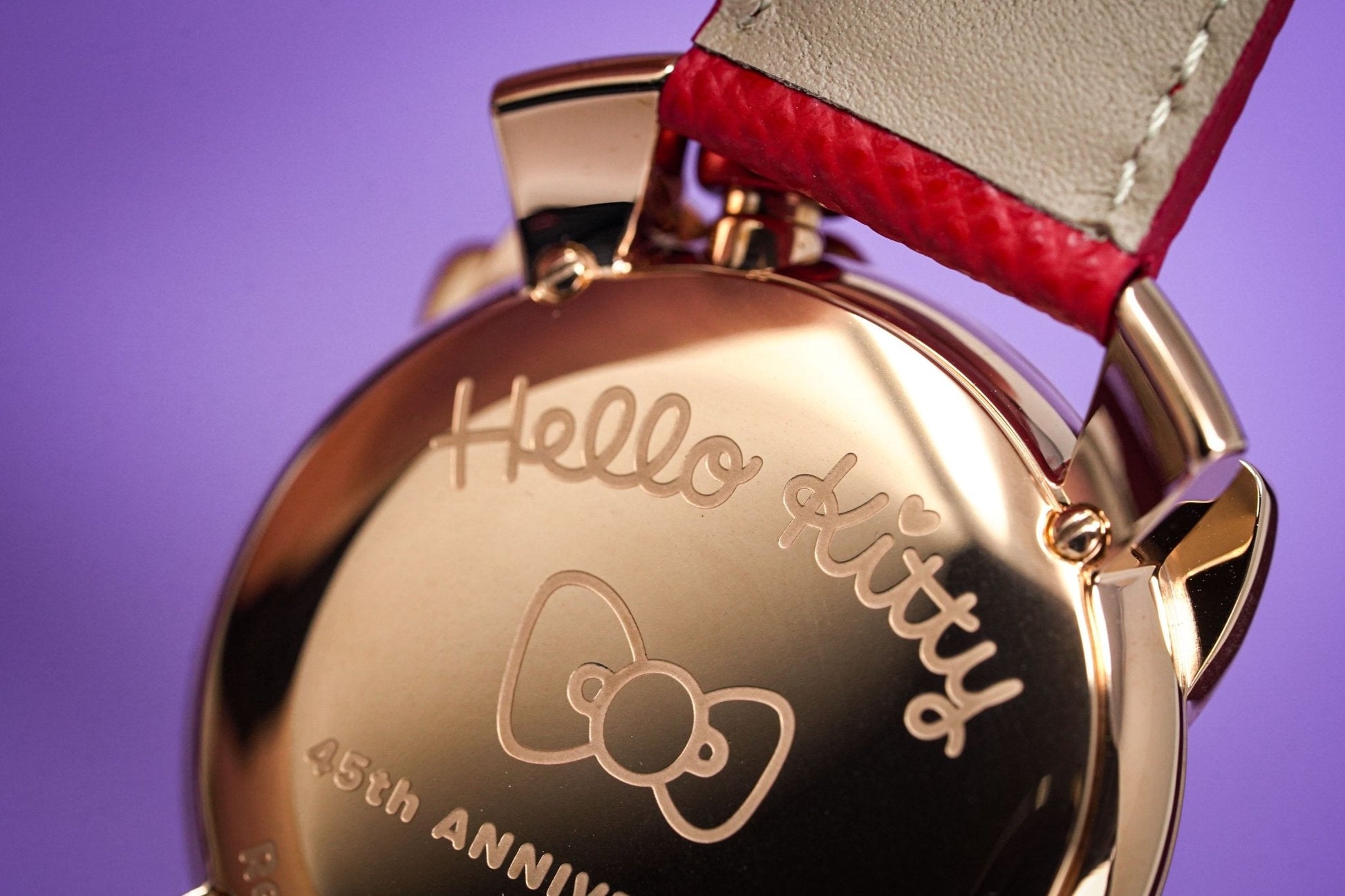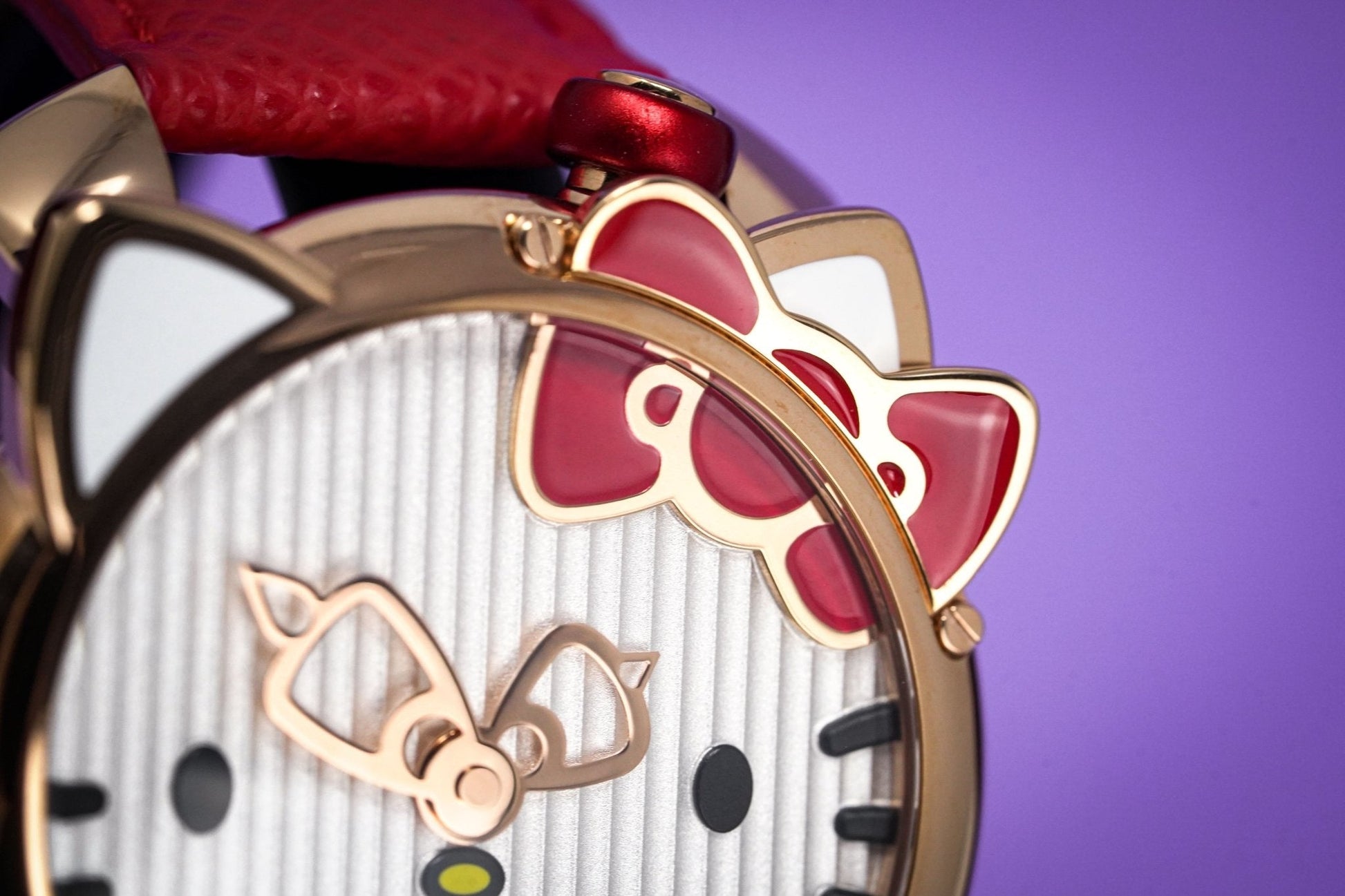 40 x 14mm Rose Gold Plated 316L Stainless Steel Case - Red Hello Kitty Bowtie Design and Ears - Domed Anti-Reflective Sapphire Crystal