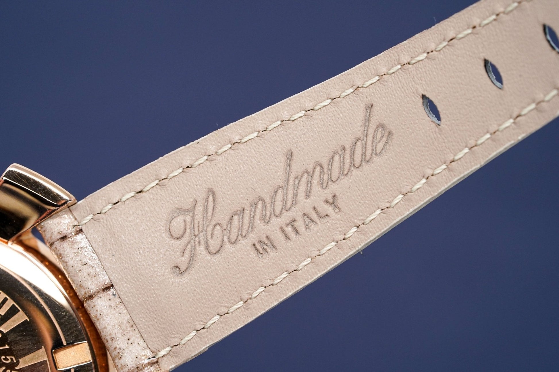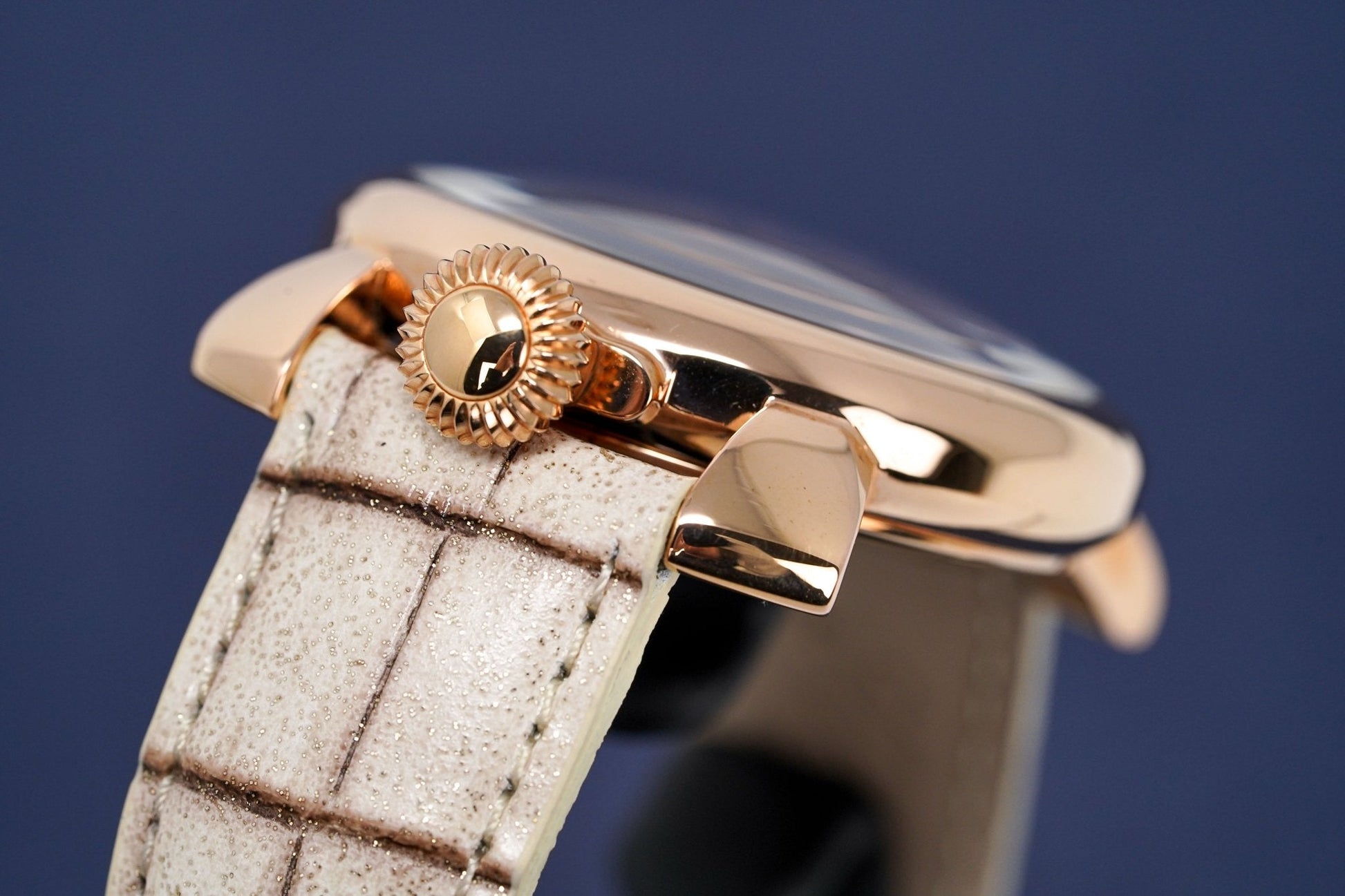 40mm x 12mm Polished Rose Gold Plated 316L Stainless Steel Case - Domed Anti-Reflective Sapphire Crystal - Screw Down Crown at 12 O'Clock - Solid Caseback.