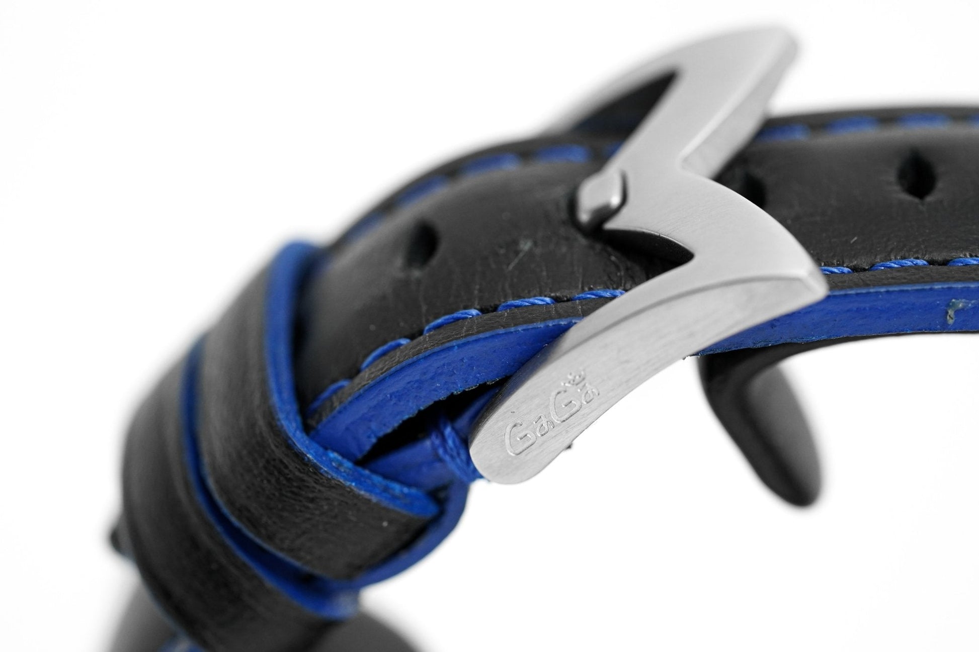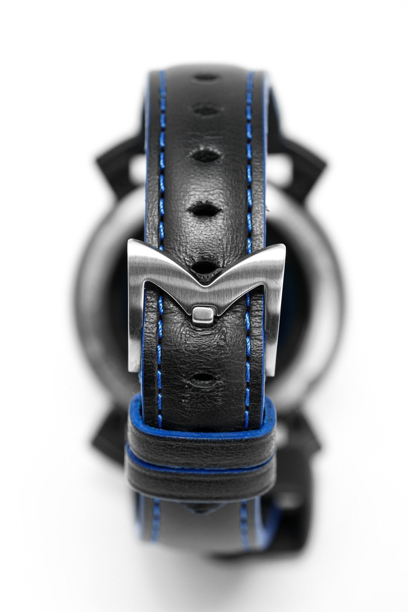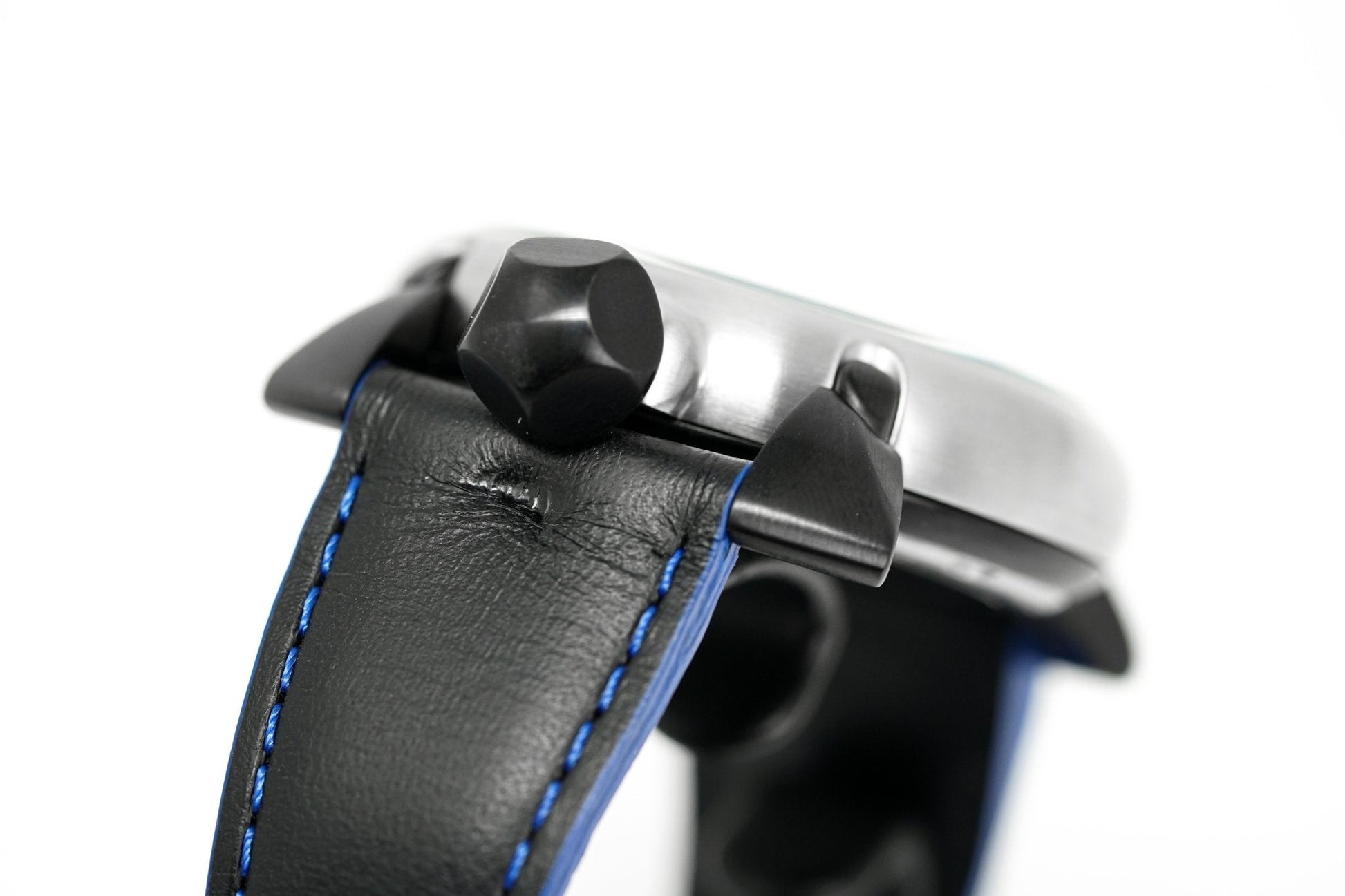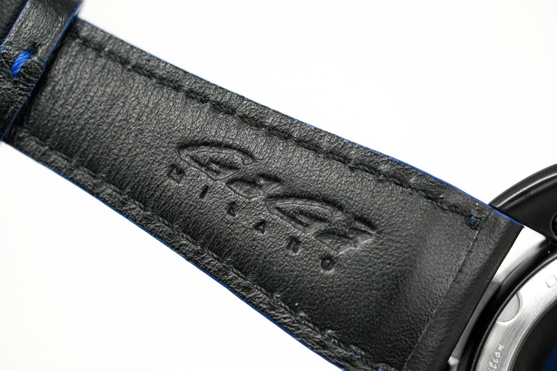 22mm x 18cm Handmade Black Italian Leather Strap with Blue Stitching. Black PVD Pin Buckle.